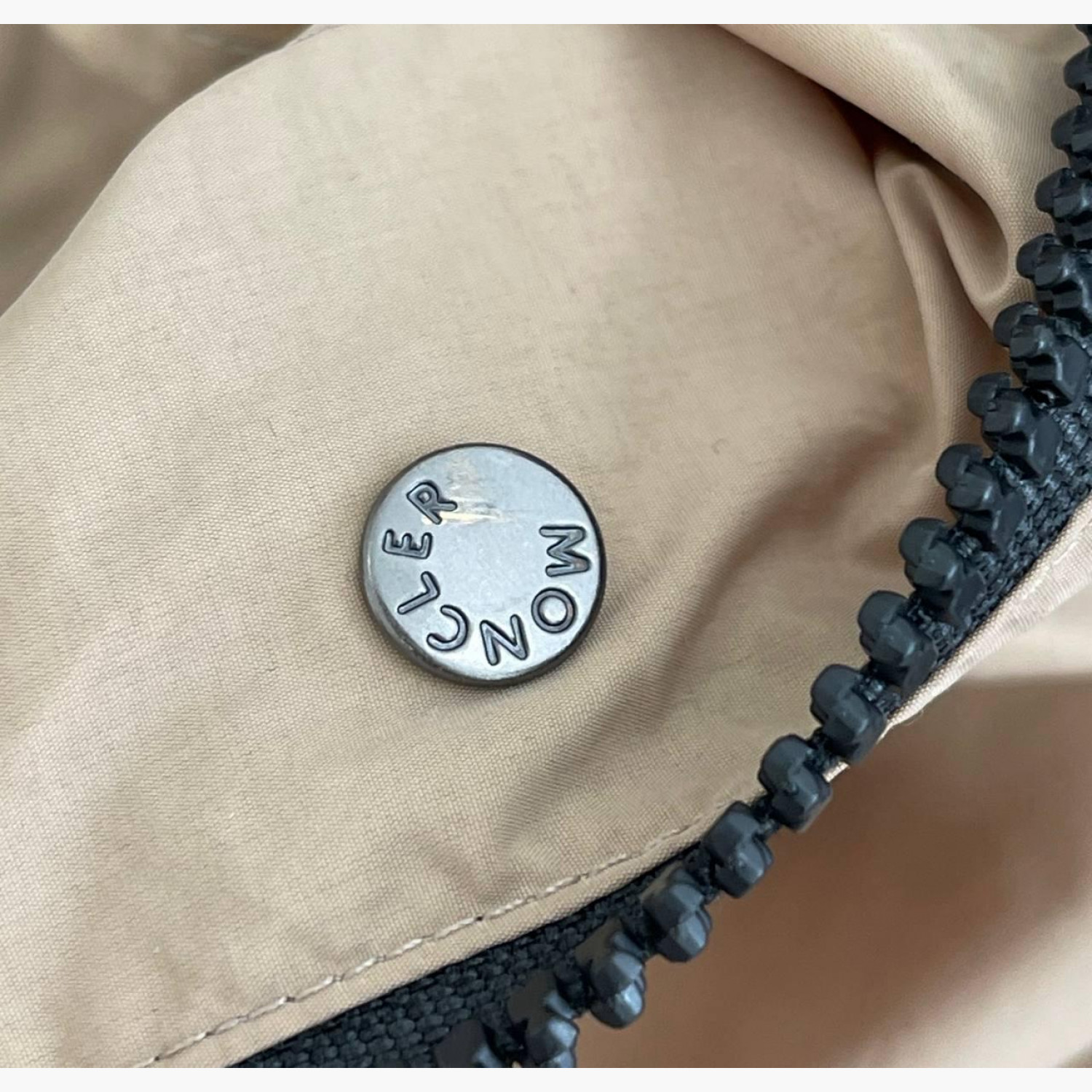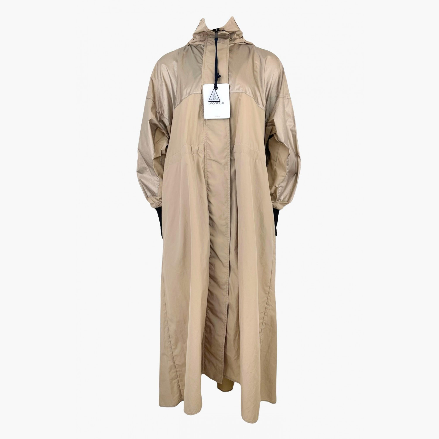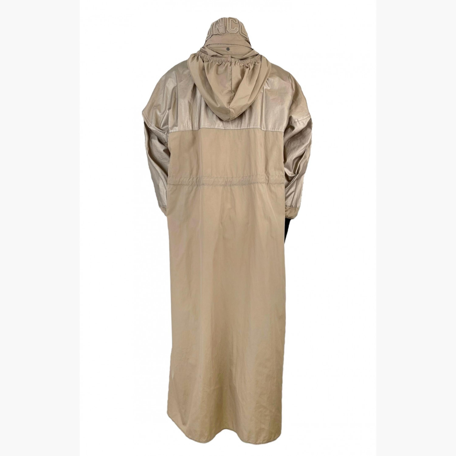 Beige zip-up coat with a hidden hood, with a tag. Main material — 100% polyamide; trim — 100% cotton. In excellent condition, minor wear marks and a scuff on the snap.