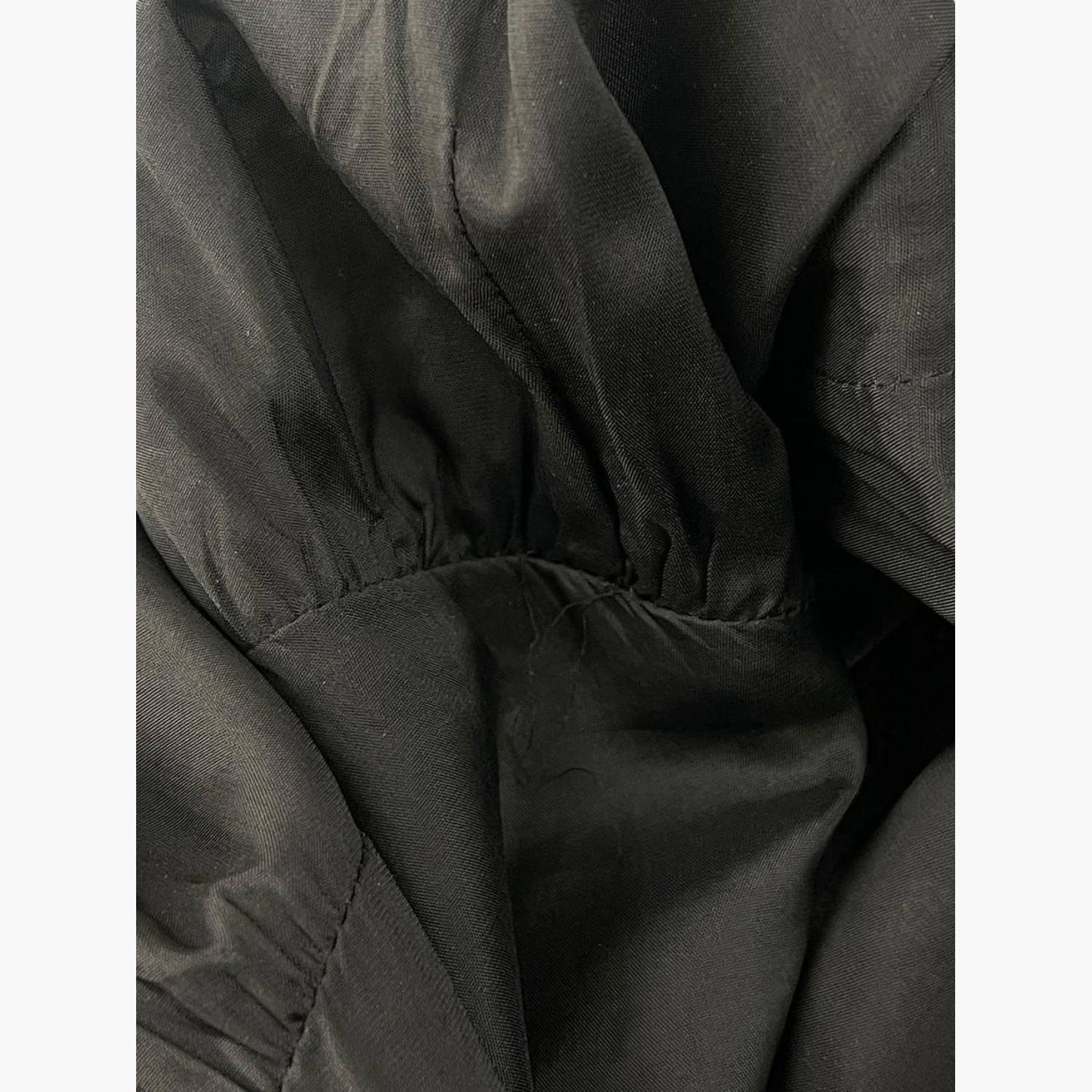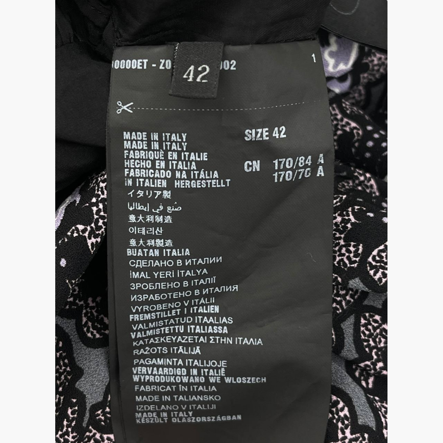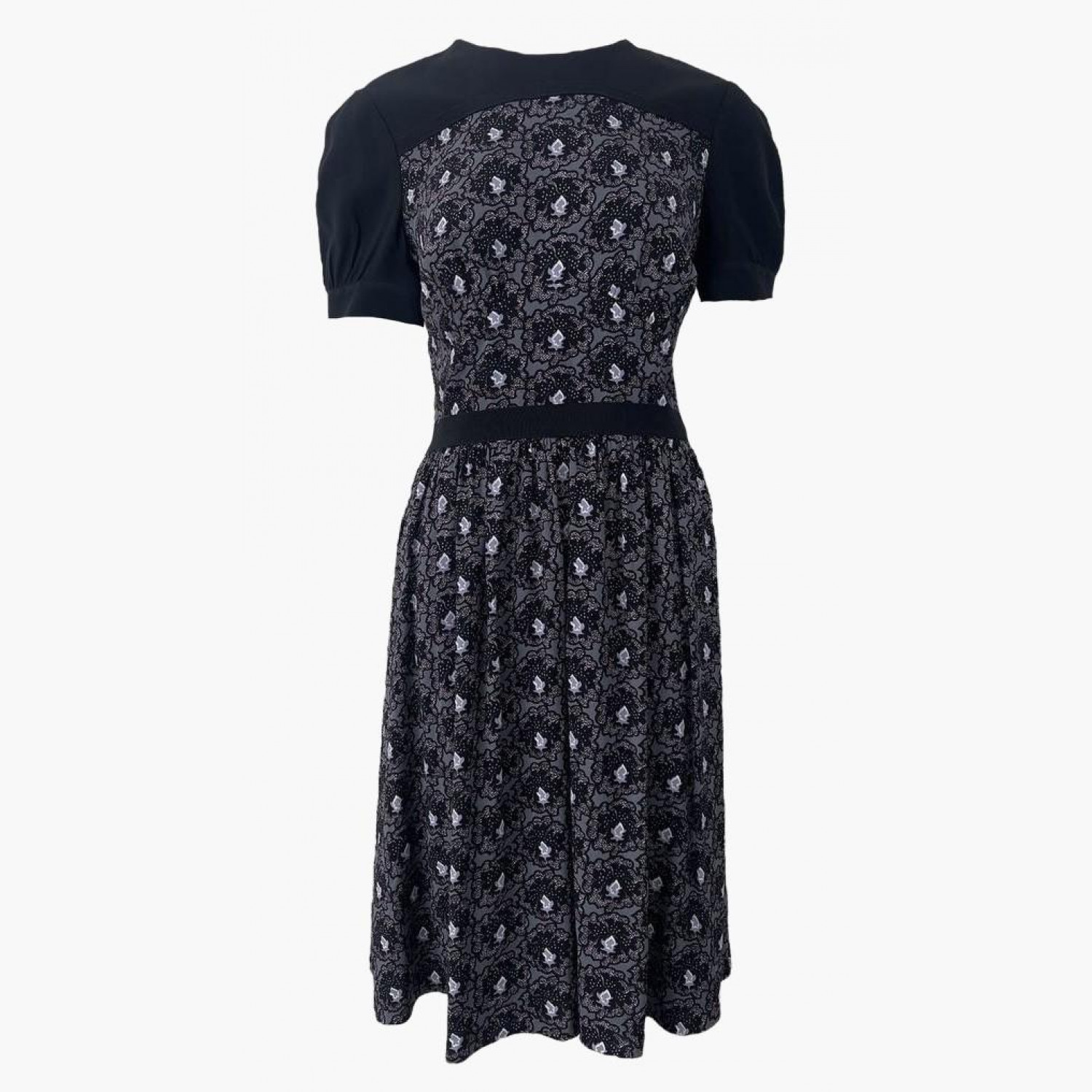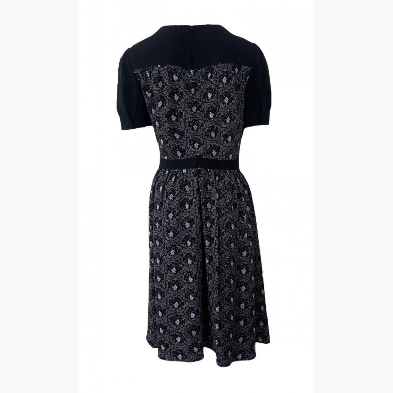 Black midi dress with short puff sleeves in a floral print. Composition: main material — 98% viscose, 2% elastane; sleeve lining — 57% acetate, 43% viscose; front and back yoke trim — 50% cotton, 50% viscose; lining — 93% cupro, 7% elastane. In excellent condition, minor wear marks, and loose threads inside.