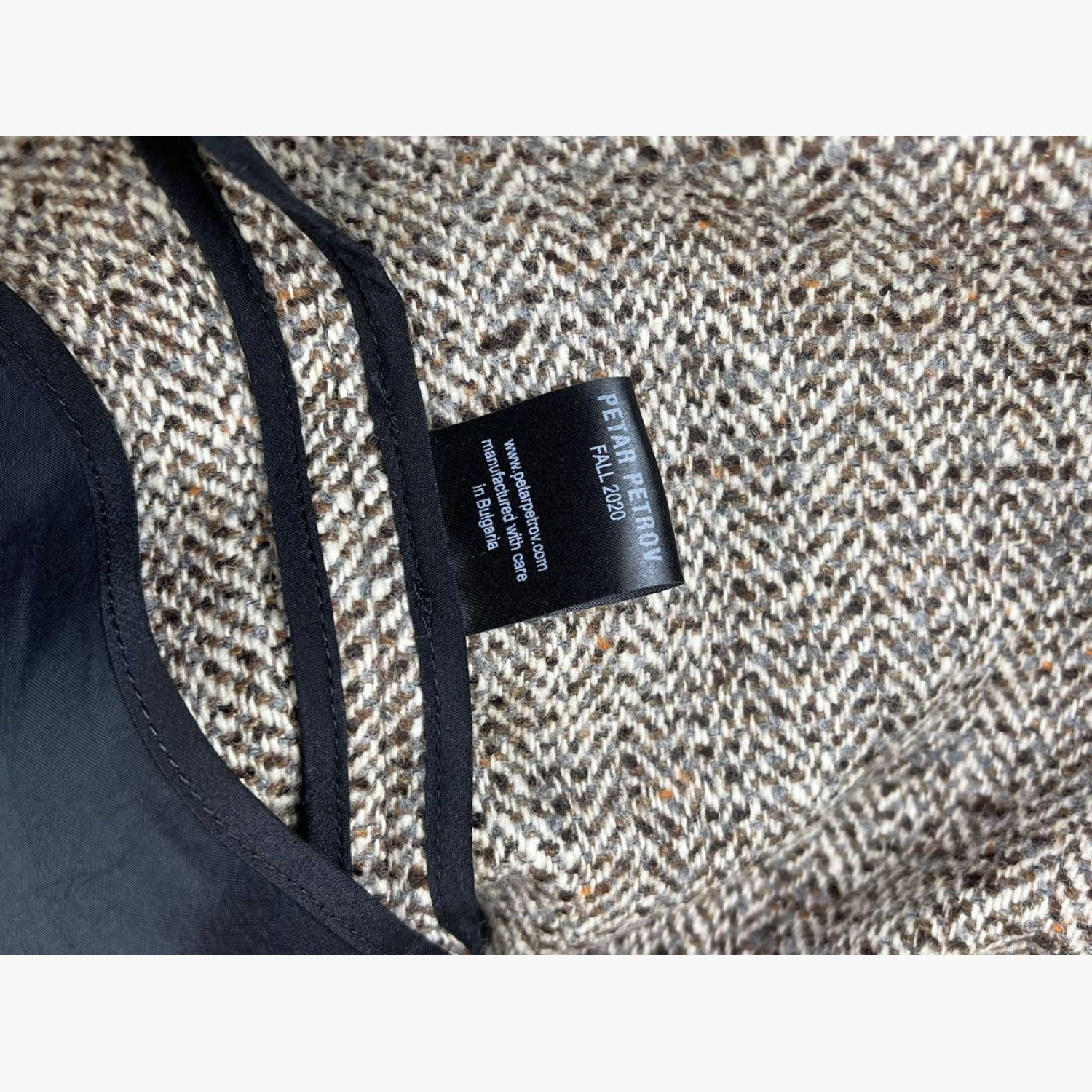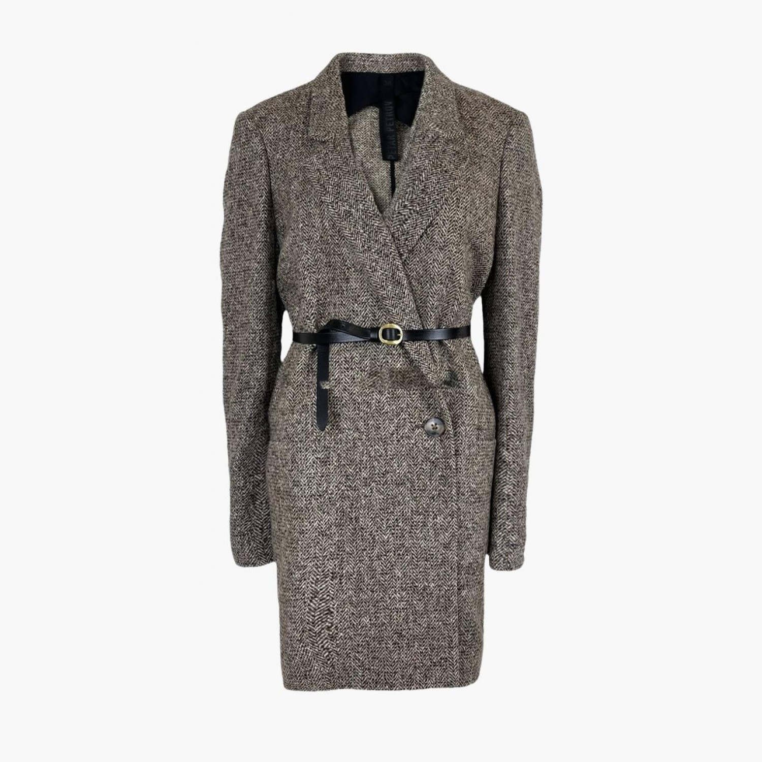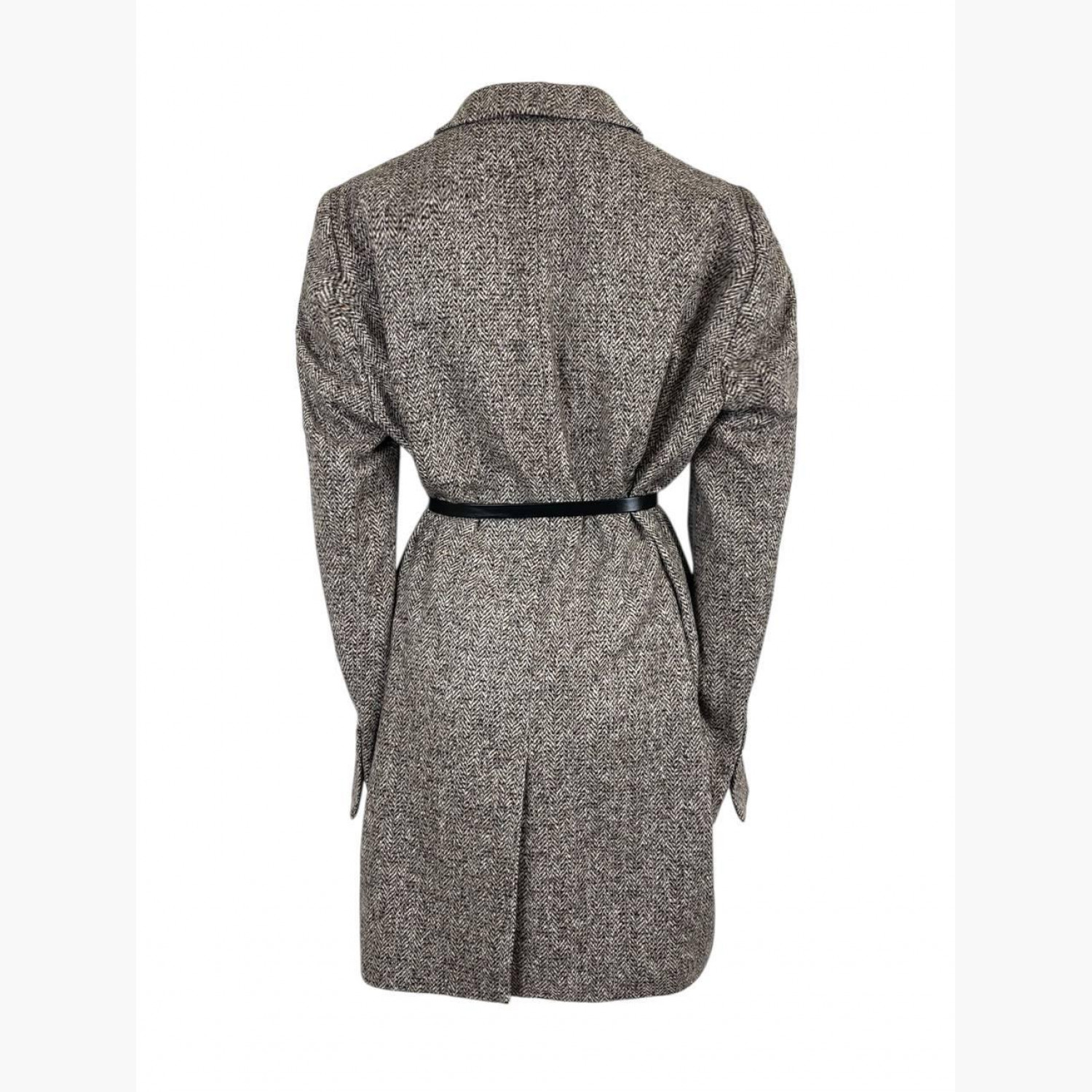 Brown long wool jacket with a thin black leather belt. Composition: main material — 72% wool, 23% silk, 5% polyamide; lining — 100% cupro; pocket lining — 100% cotton; trim — 100% silk. In excellent condition, with no wear marks.