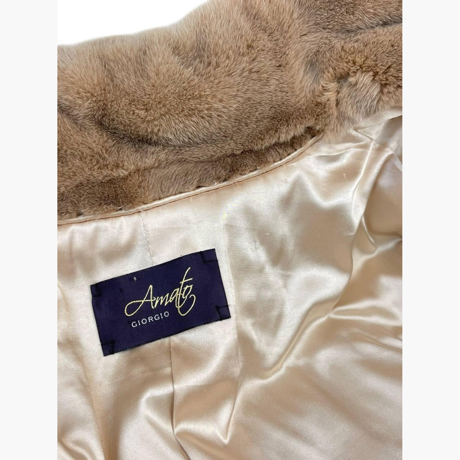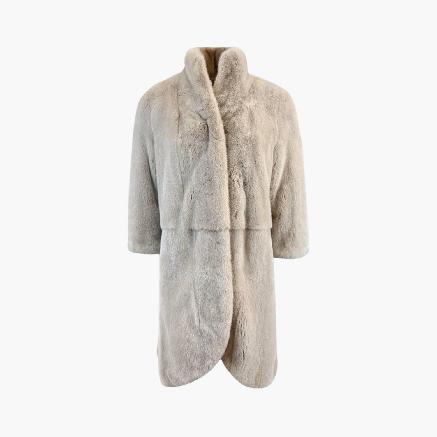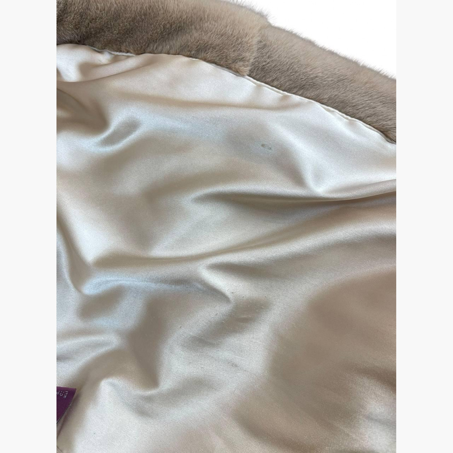 Light beige fur coat with a stand-up collar. In good condition, with snags and stains.