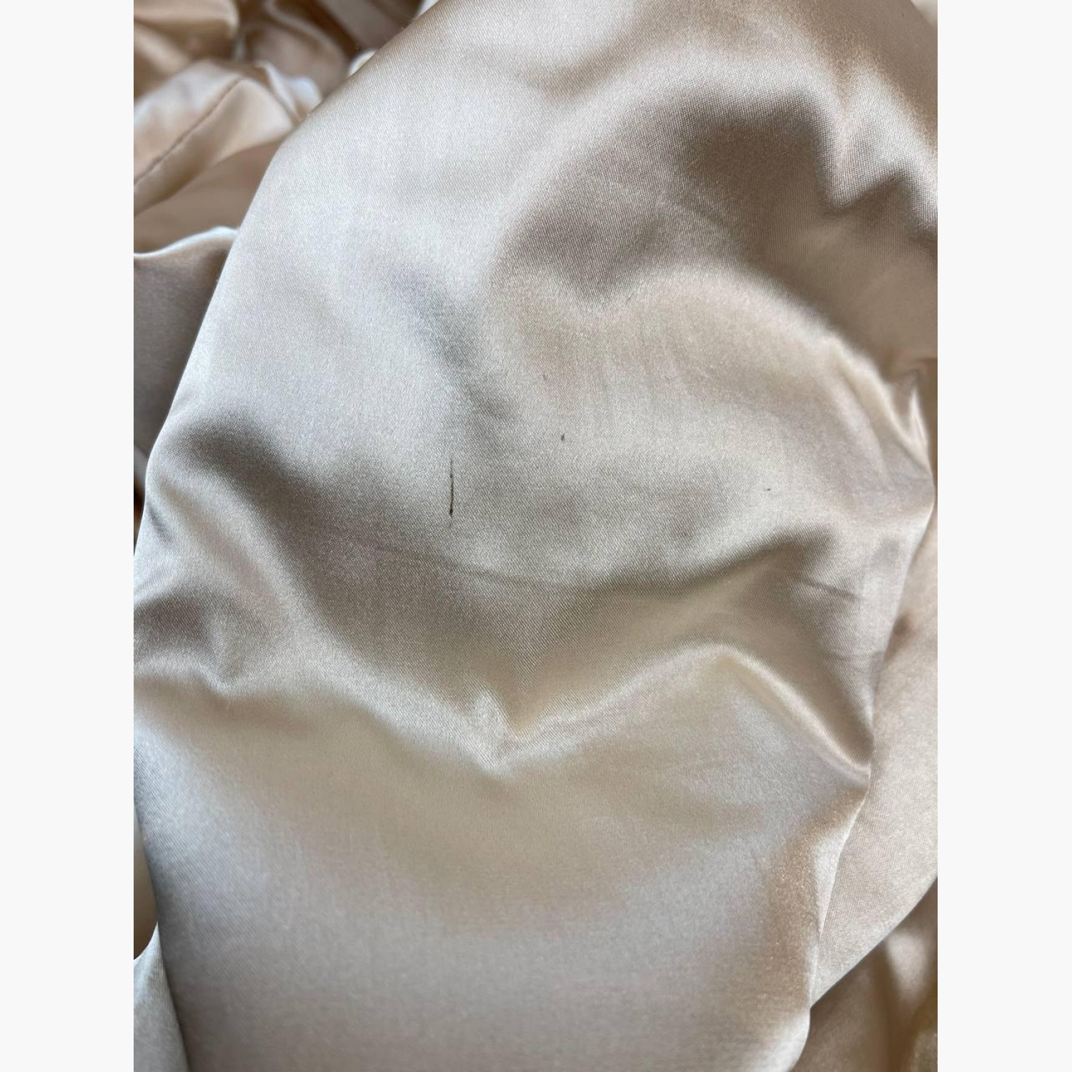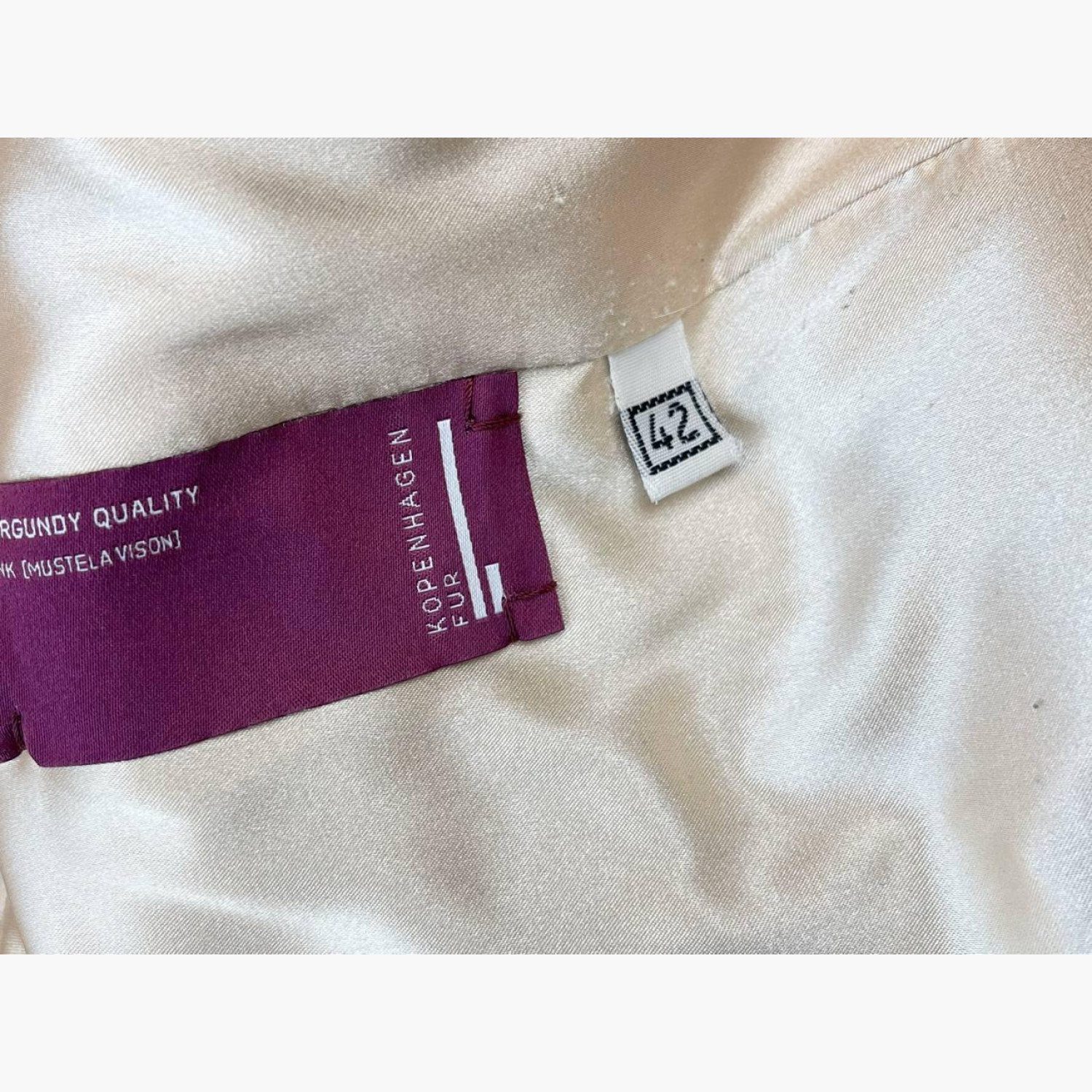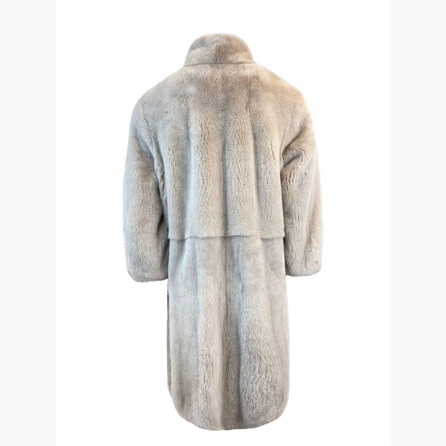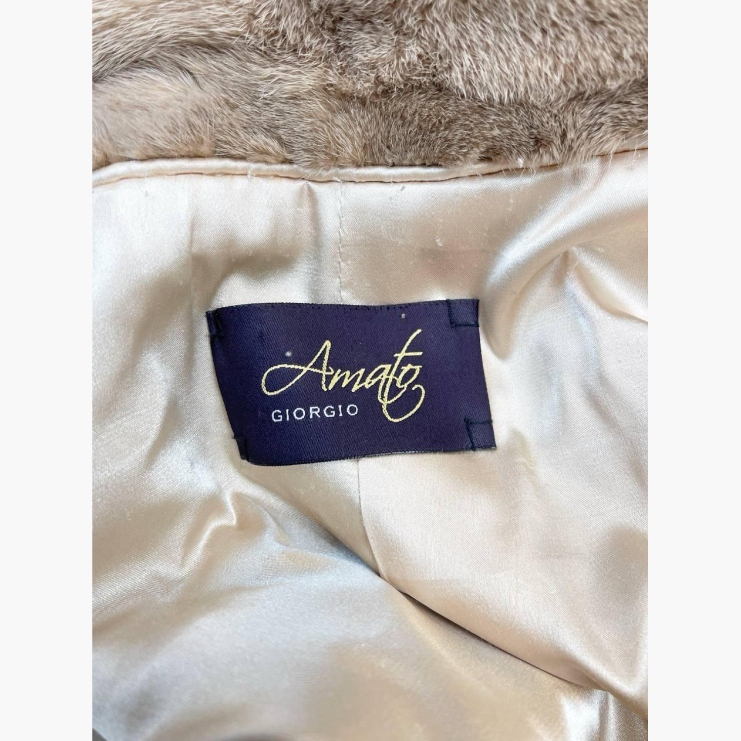 Light beige fur coat with a stand-up collar. In good condition, with snags and stains.