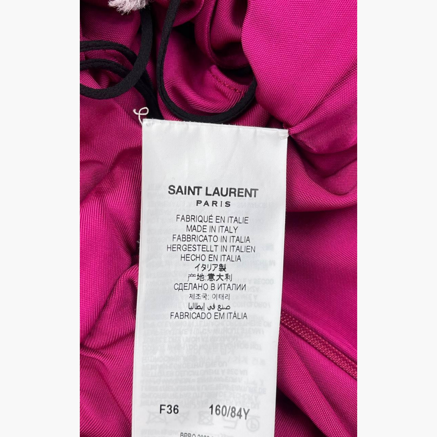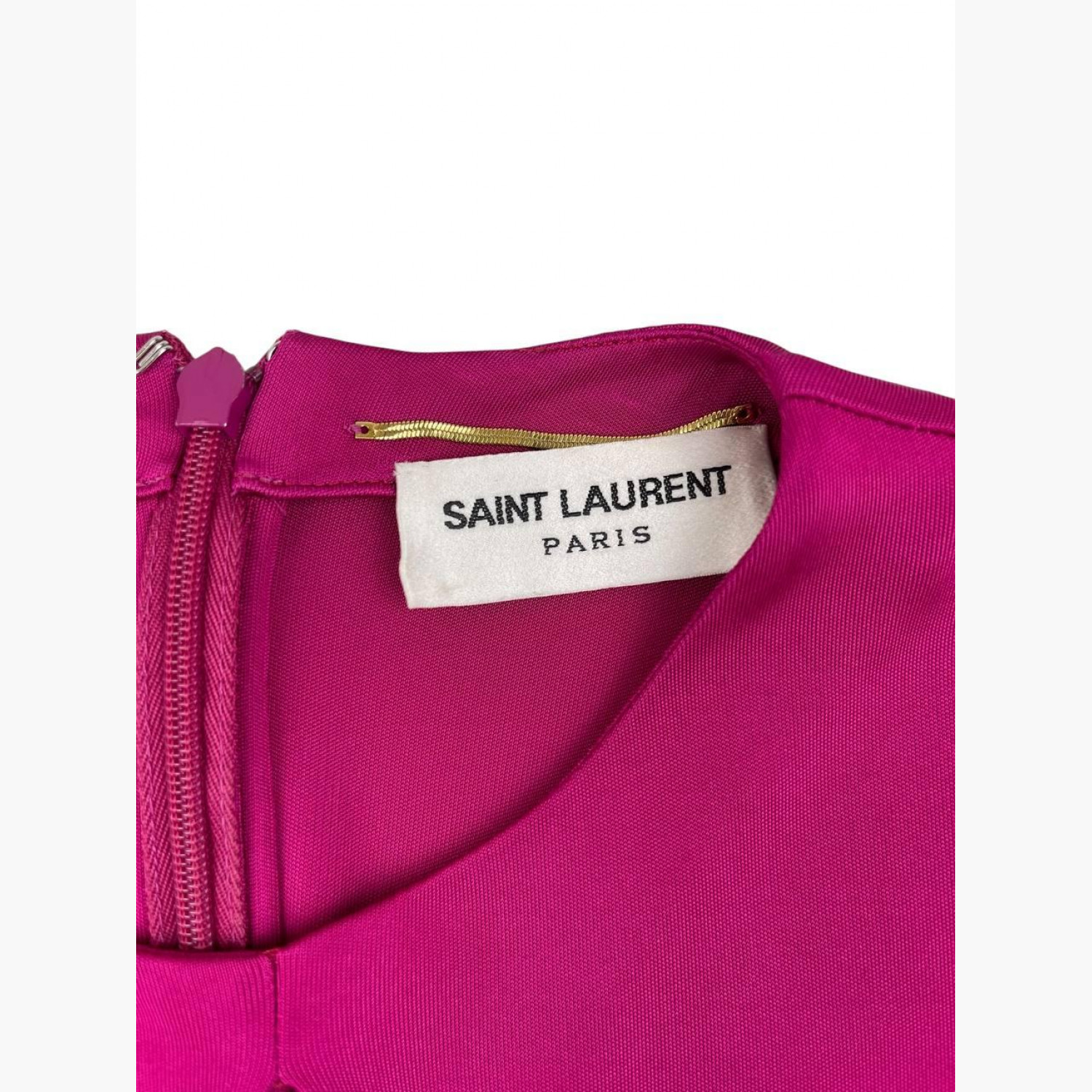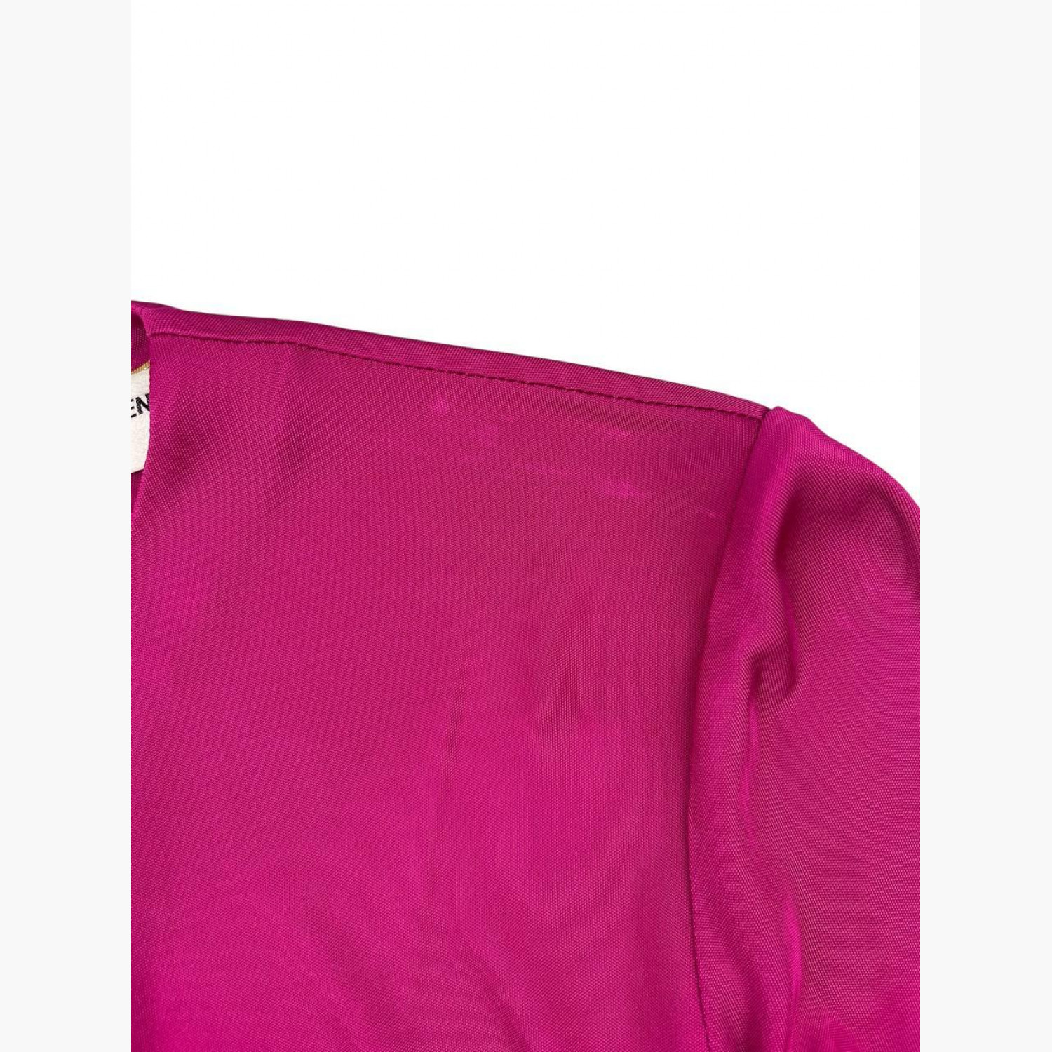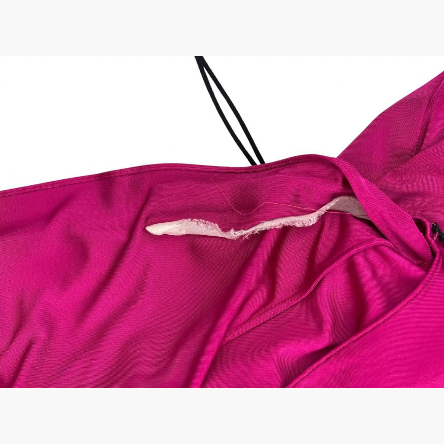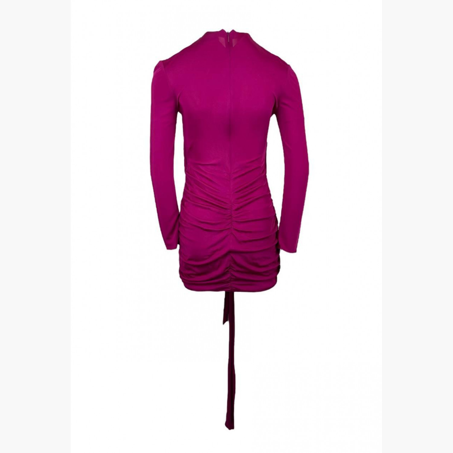 Fuchsia mini dress with chest cutout and draped skirt with train. In good condition, with wear marks.