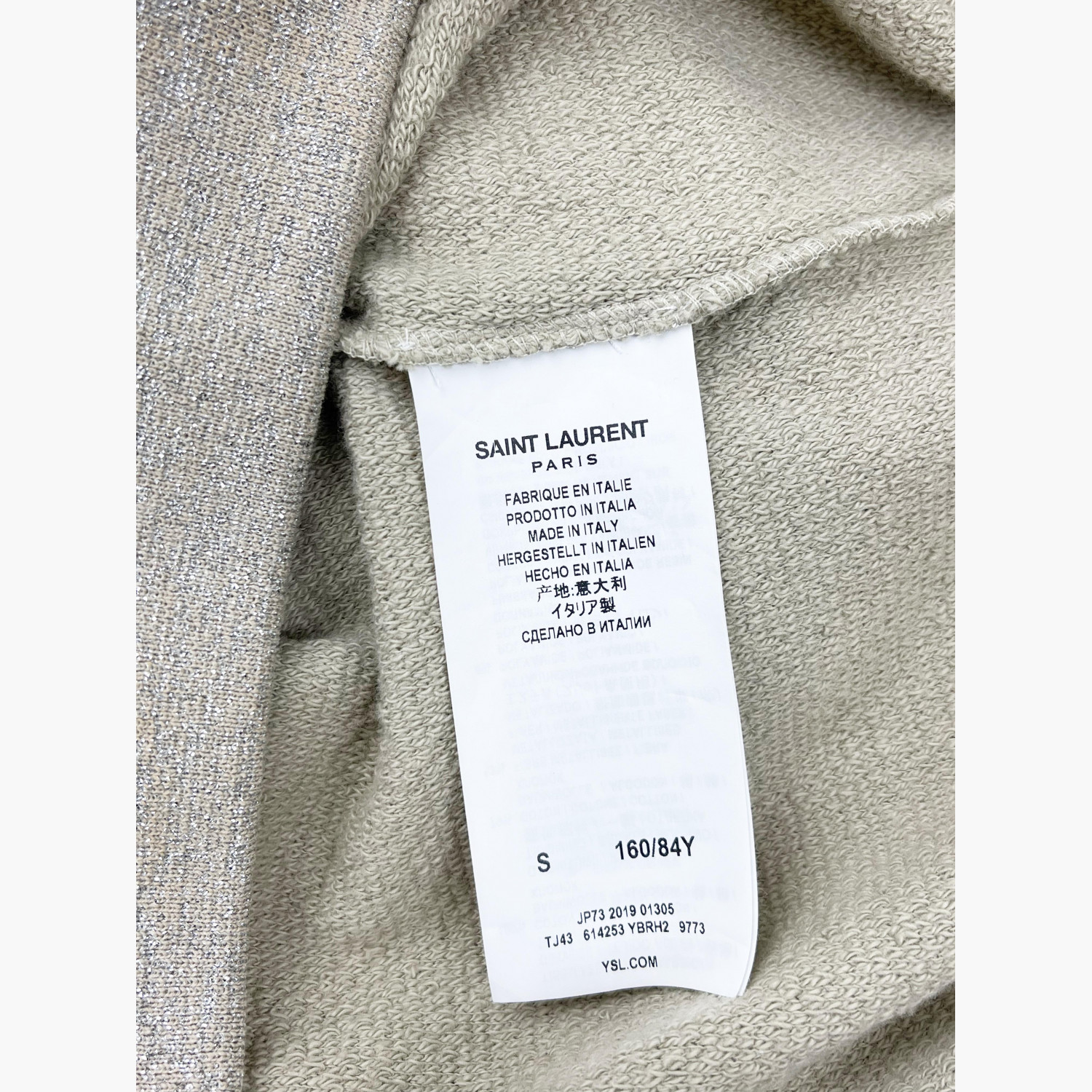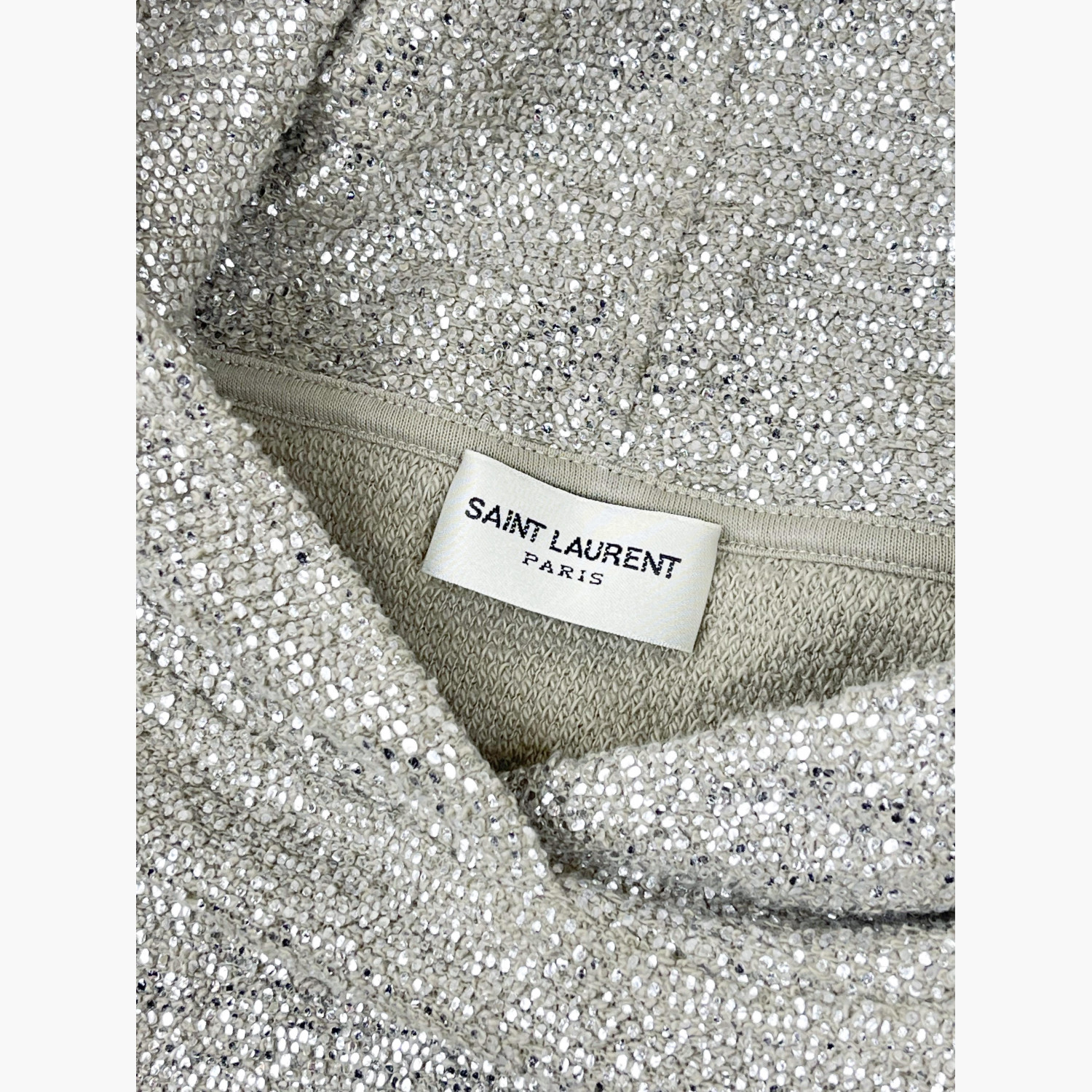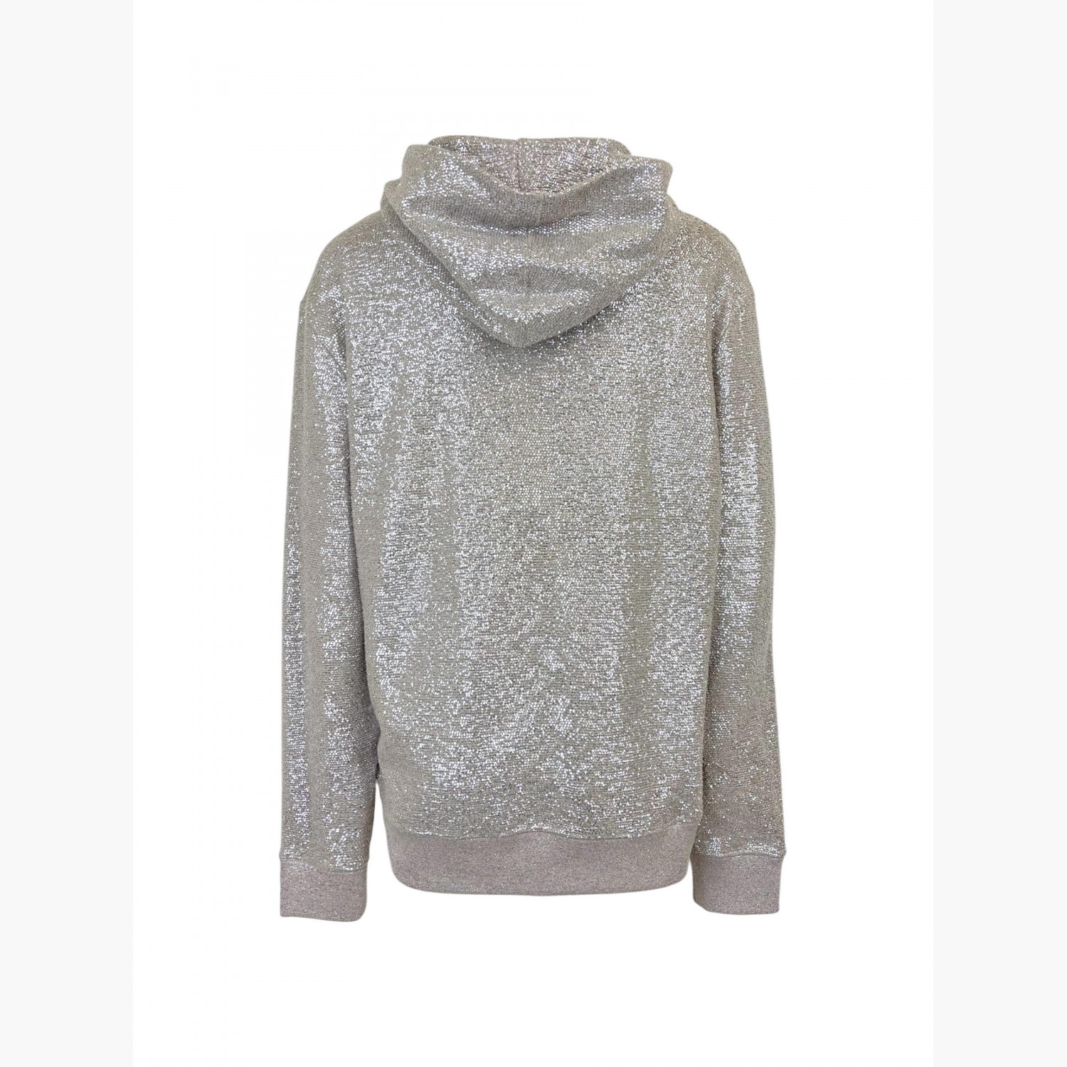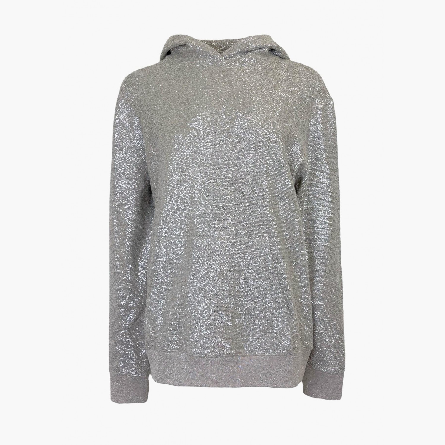 A silver-toned hoodie with lurex. Composition: main material — 100% cotton; trim — 79% cotton, 13% metallized fiber, 8% polyamide. In excellent condition, with no wear marks.