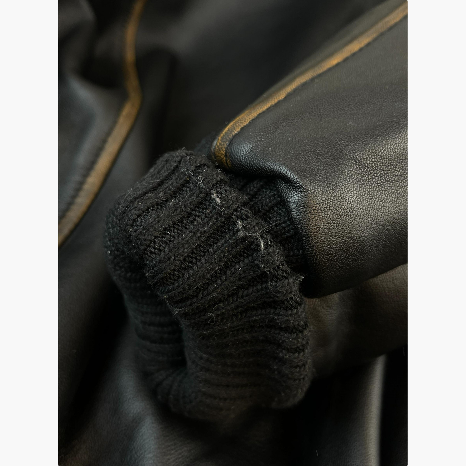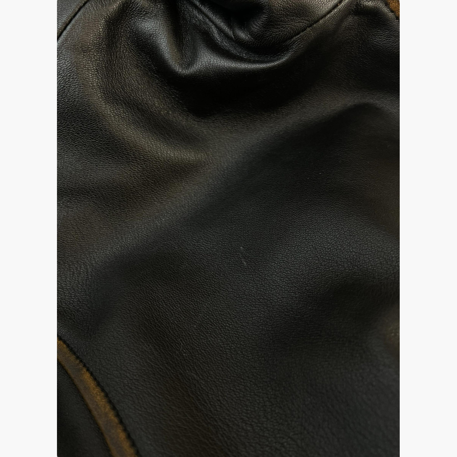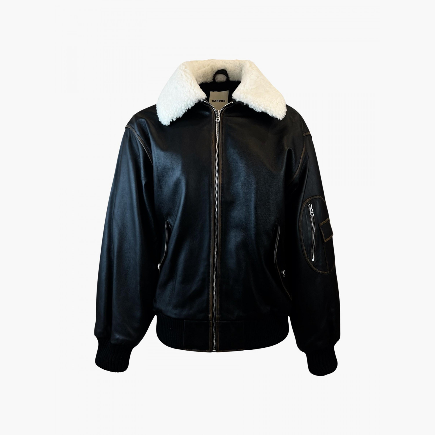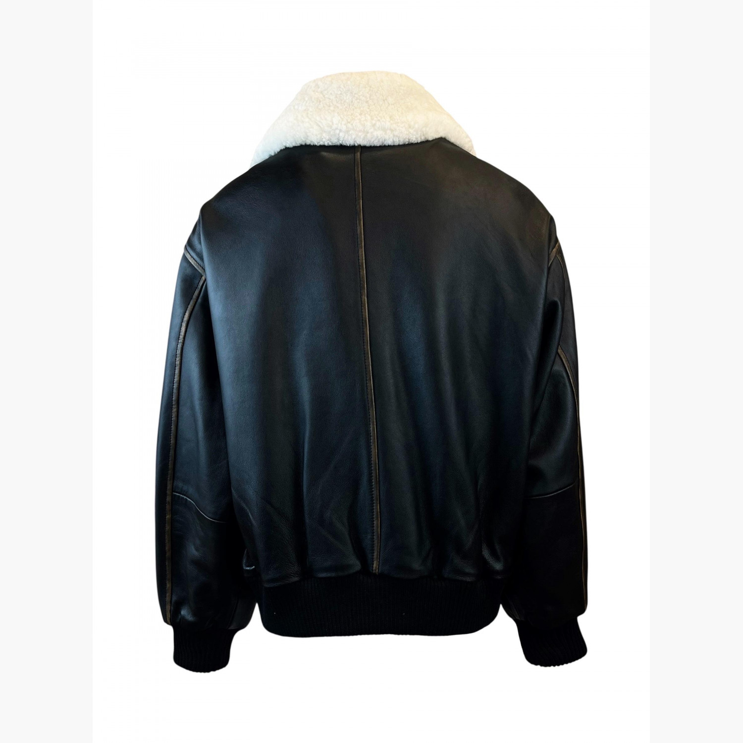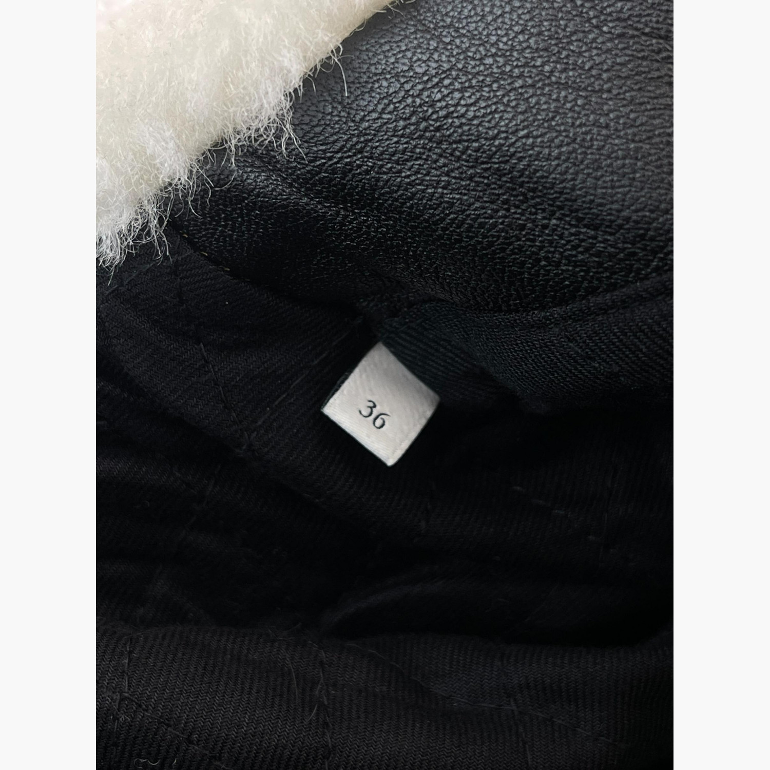 Black leather jacket with a zipper and a white fur collar.Composition: main material — 100% genuine sheepskin leather; collar — mouton; lining — 100% viscose; padding — 100% polyester batting.Comes with a branded garment bag and hanger.In excellent condition, with pilling on the cuffs and minor signs of wear.