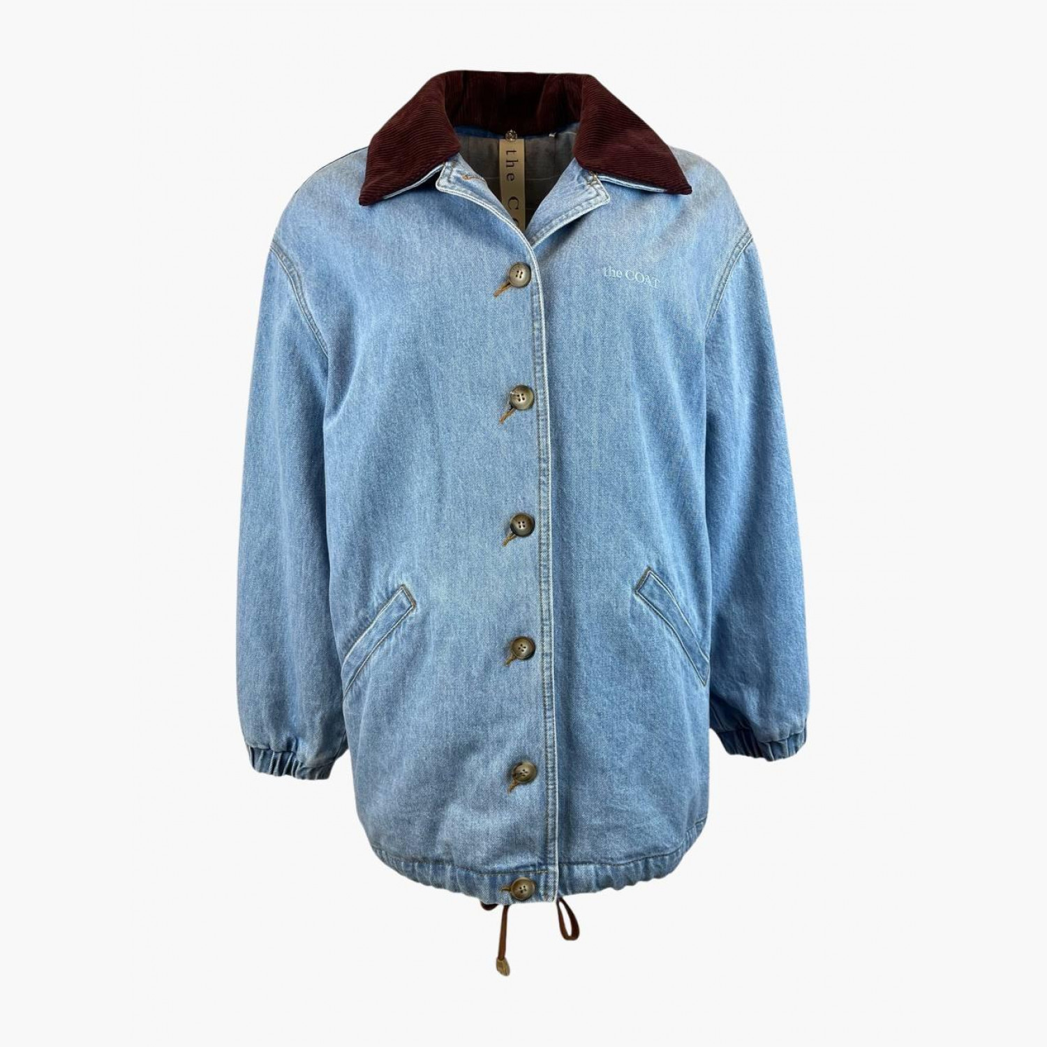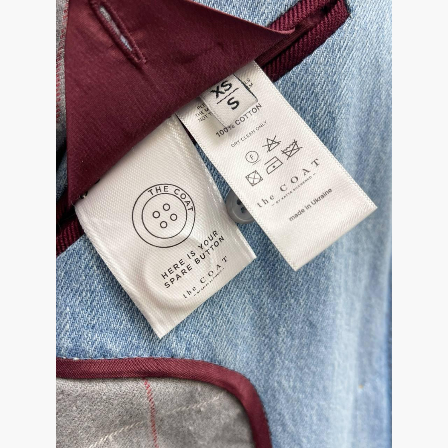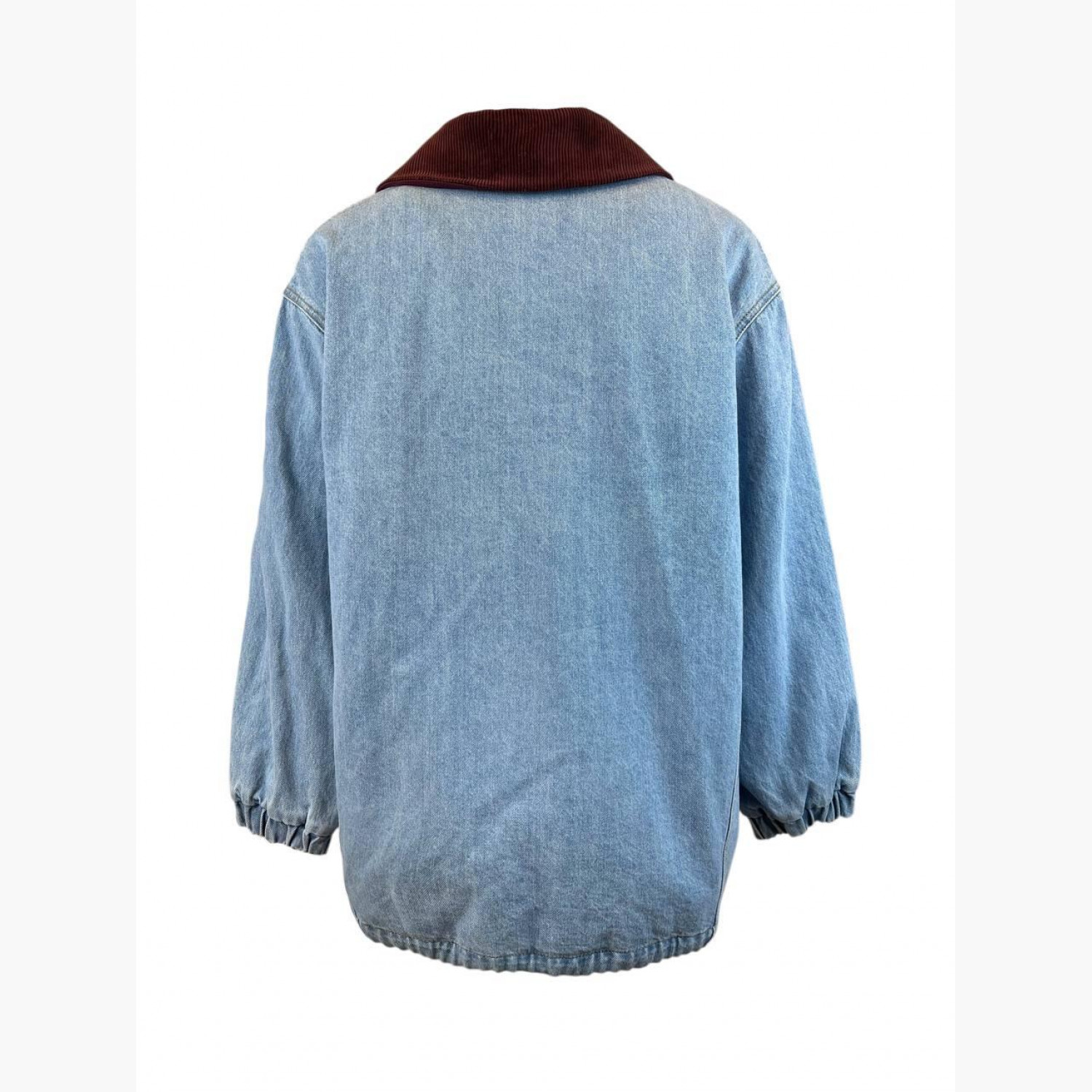 Light blue denim jacket with buttons and a burgundy corduroy collar. Material — 100% cotton, size XS–S. In excellent condition, the lining has slight pilling.