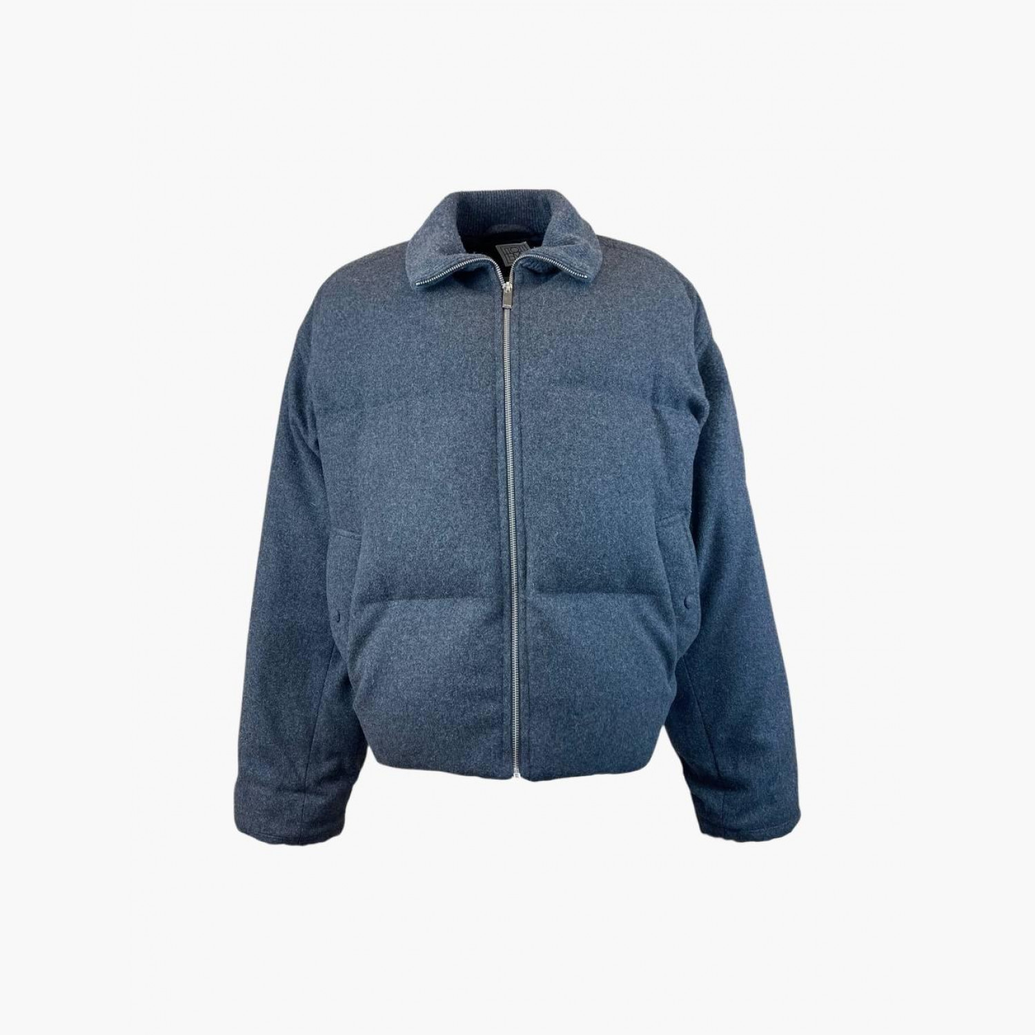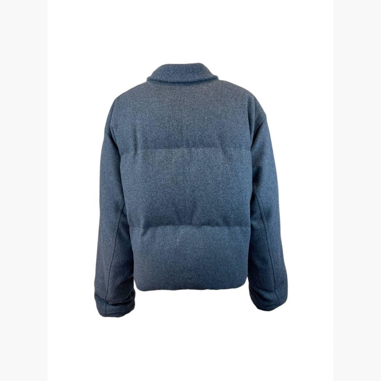 Gray wool down jacket with a knitted collar and zipper. Composition: main material — 60% wool, 35% polyester, 5% other fibers; lining — 100% viscose; collar — 70% wool, 30% cashmere. In excellent condition, with minor wear marks.