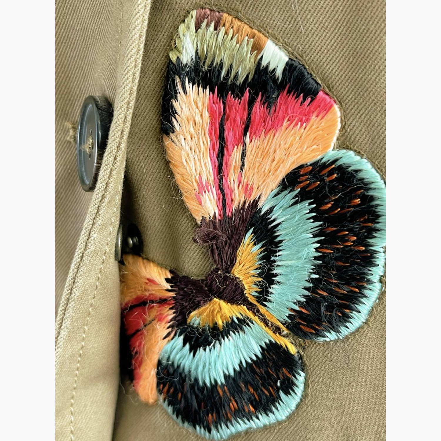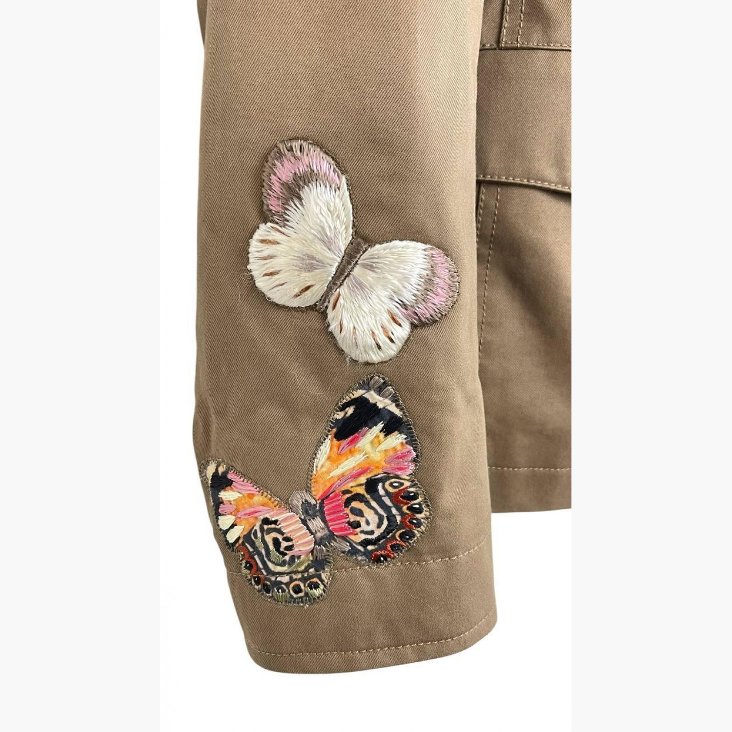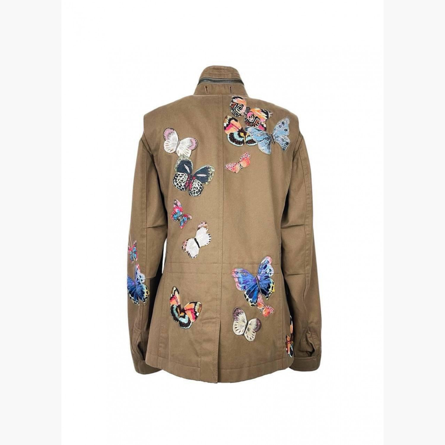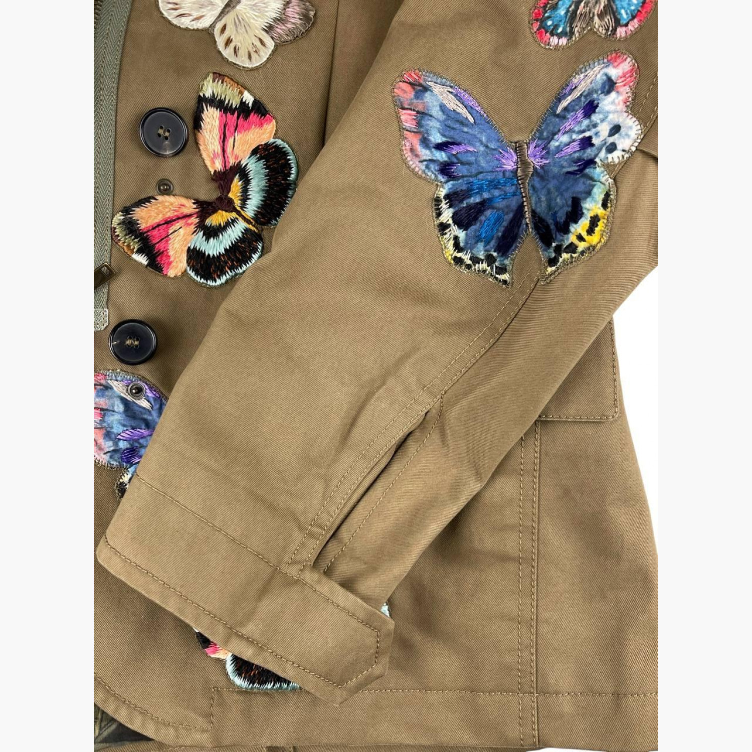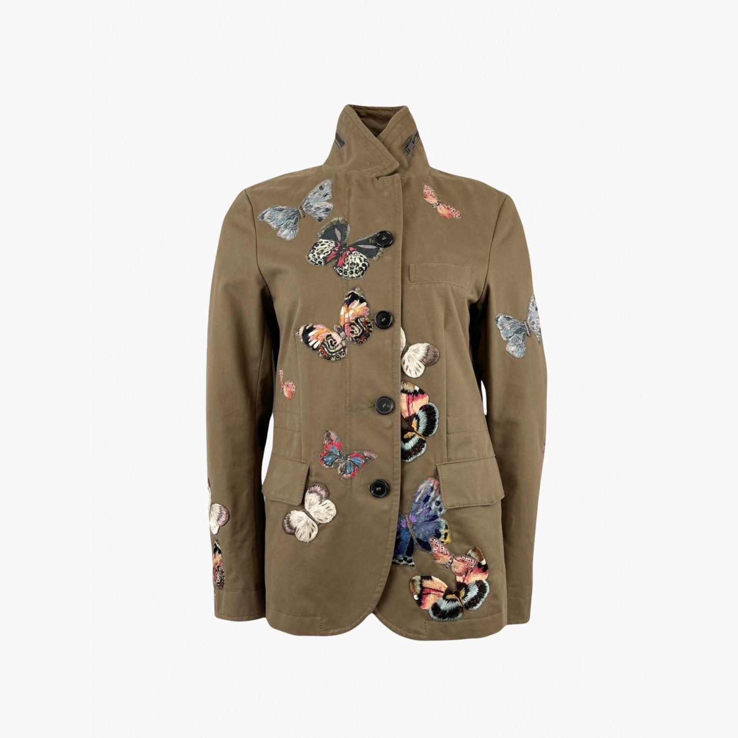 Khaki single-breasted blazer with buttons, hidden zipper, and studs, featuring butterfly embroidery all over. Composition: main fabric and lining — 100% cotton; embroidery — 100% viscose. In excellent condition.