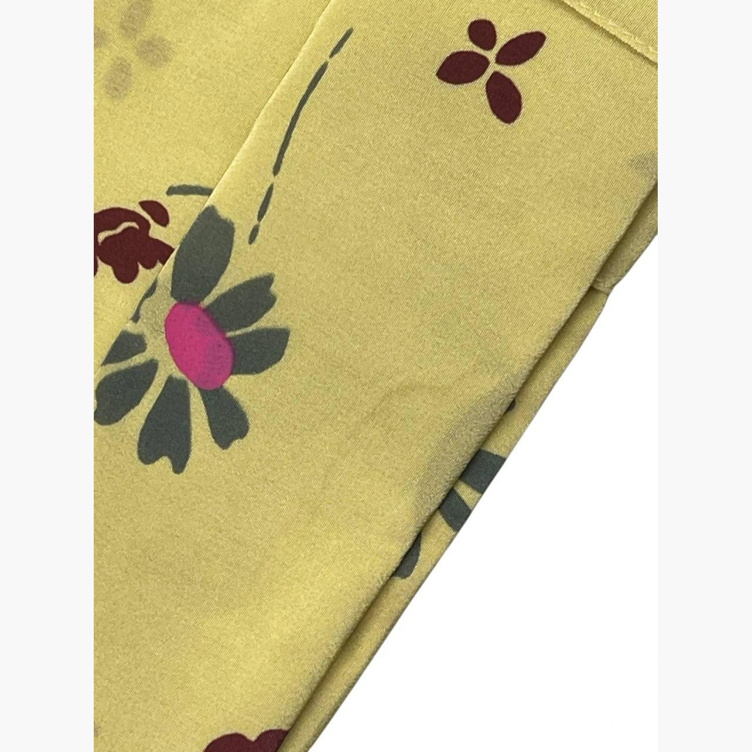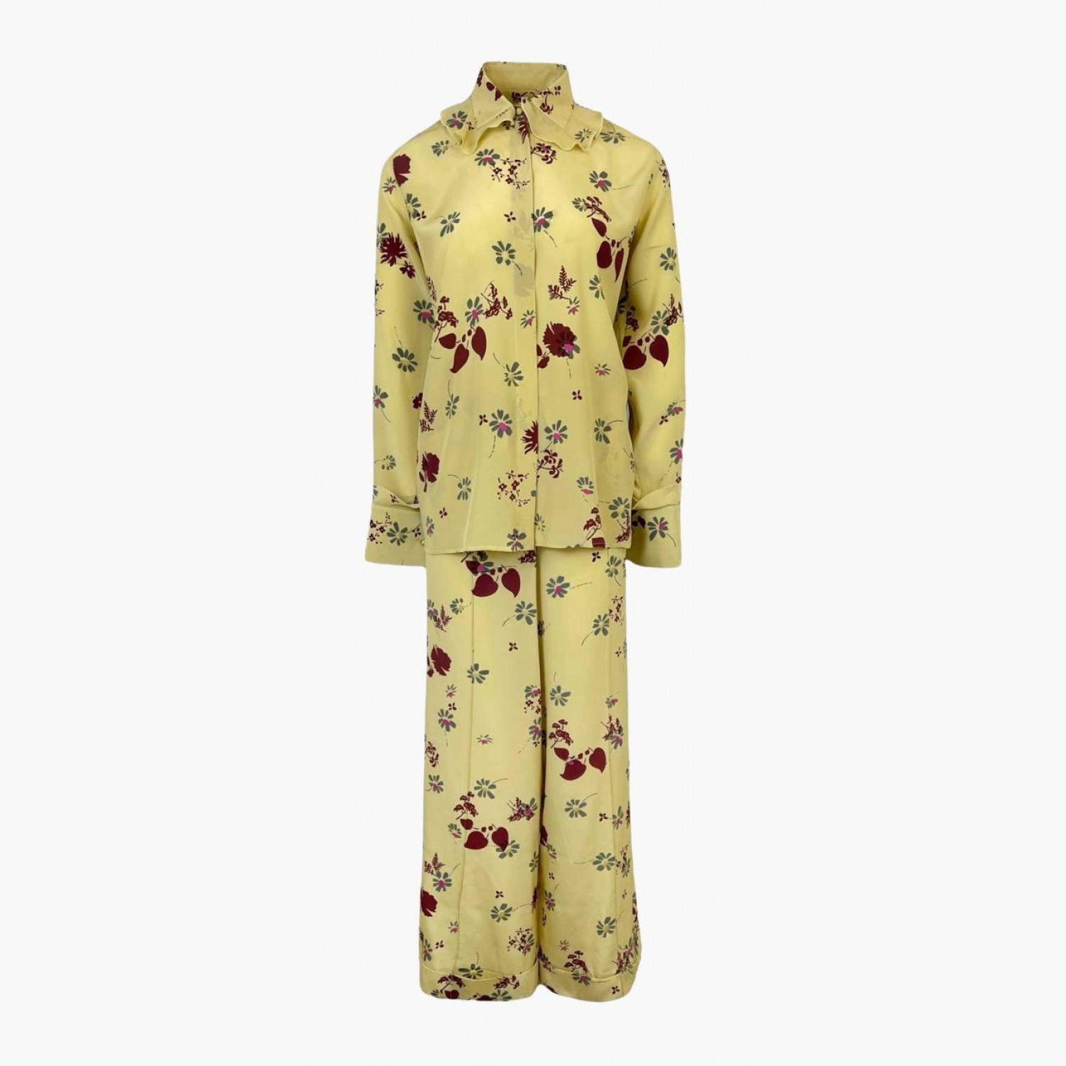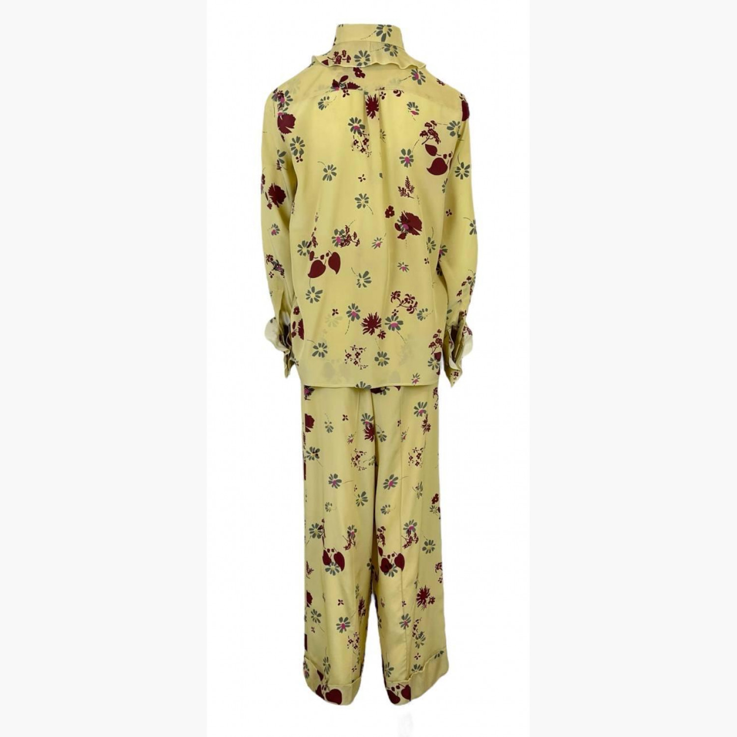 Mustard silk suit with a floral print. In good condition with wear marks.