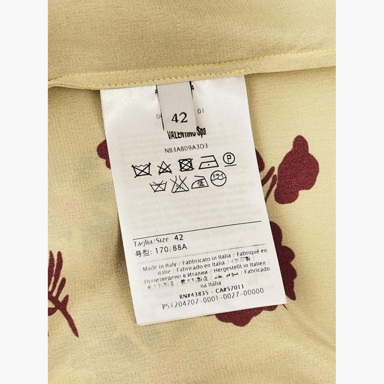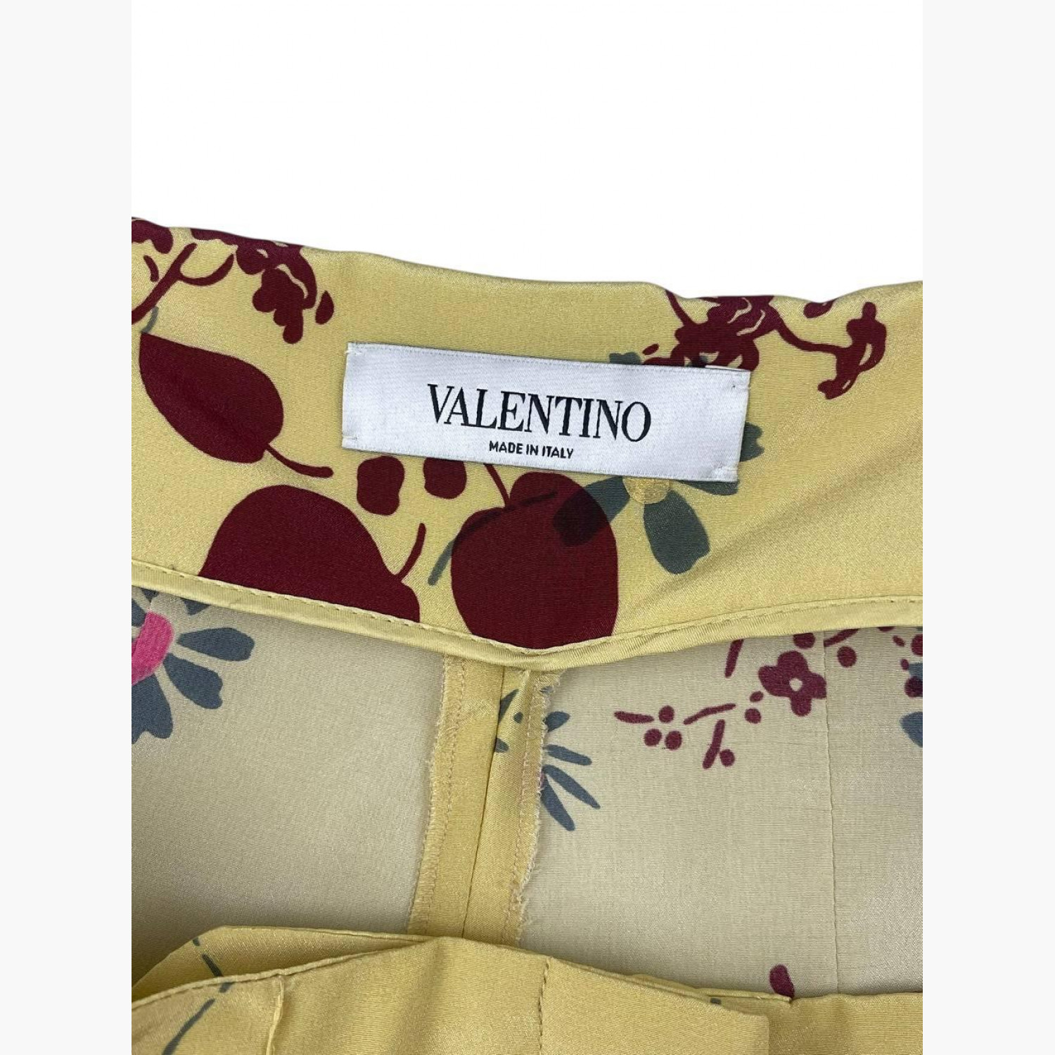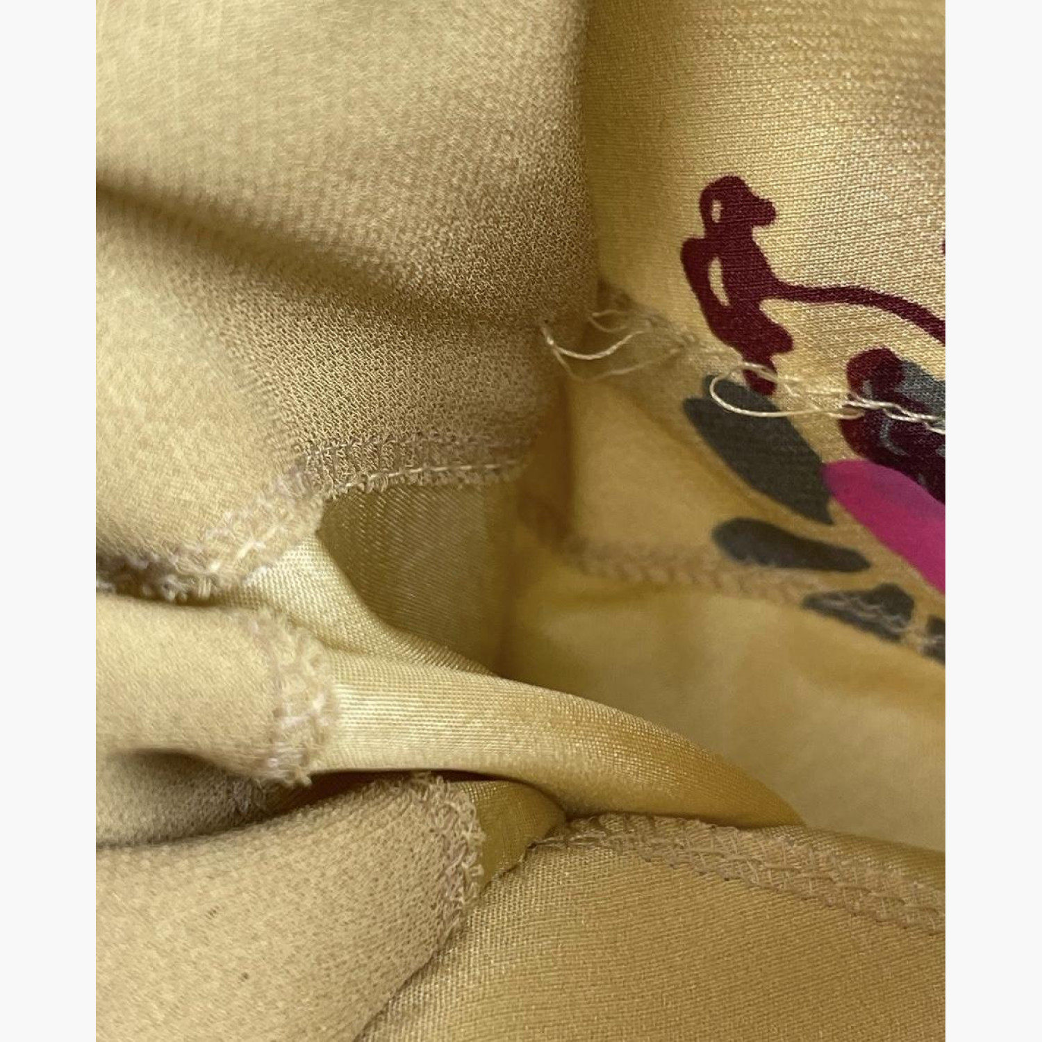 Mustard silk suit with a floral print. In good condition with wear marks.