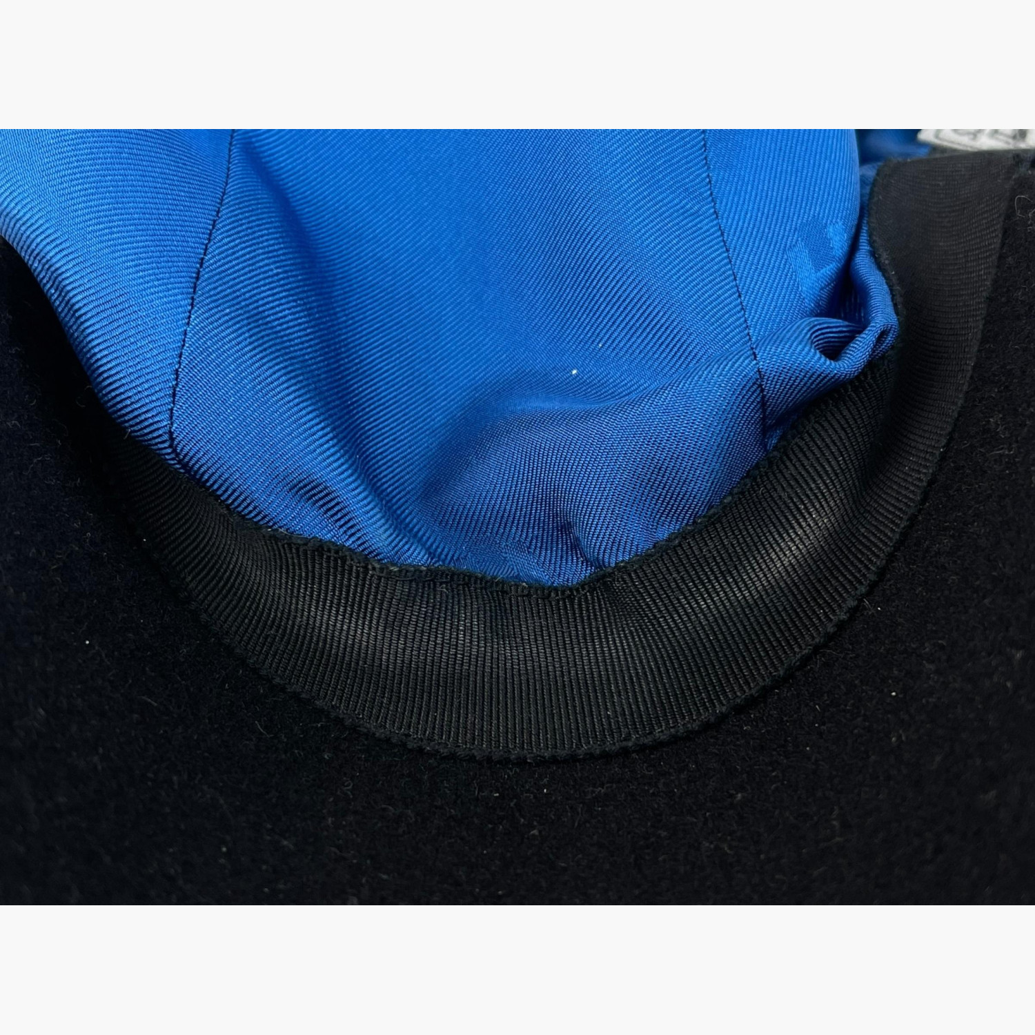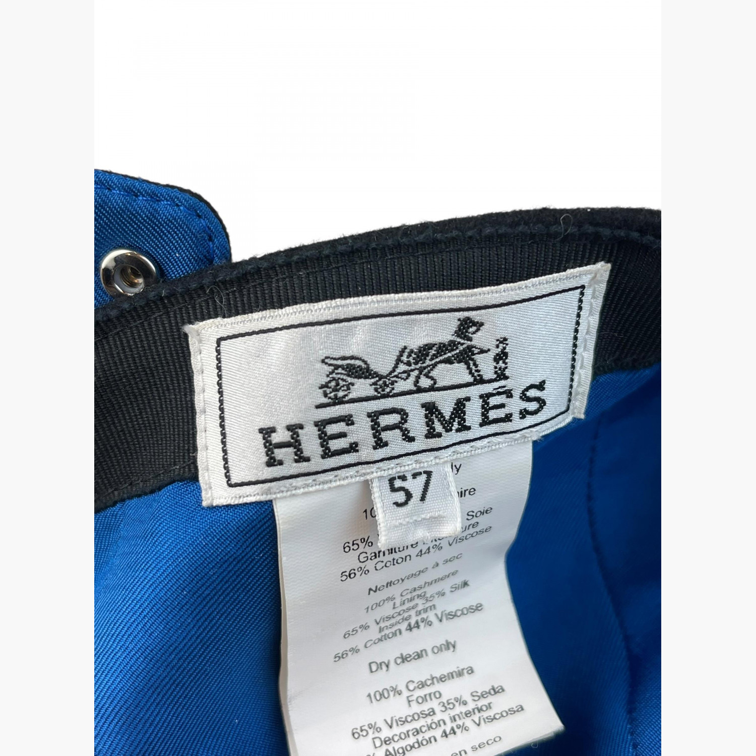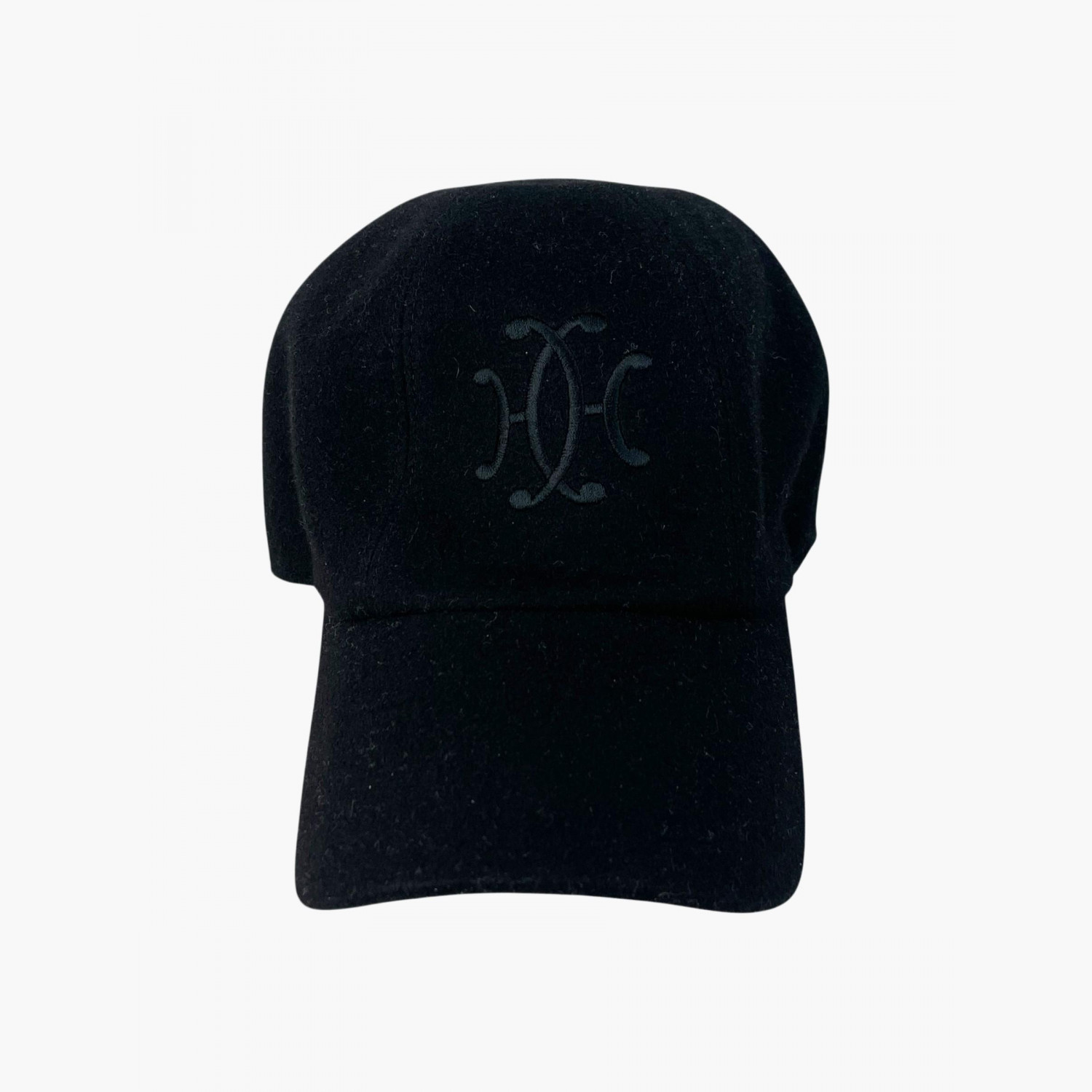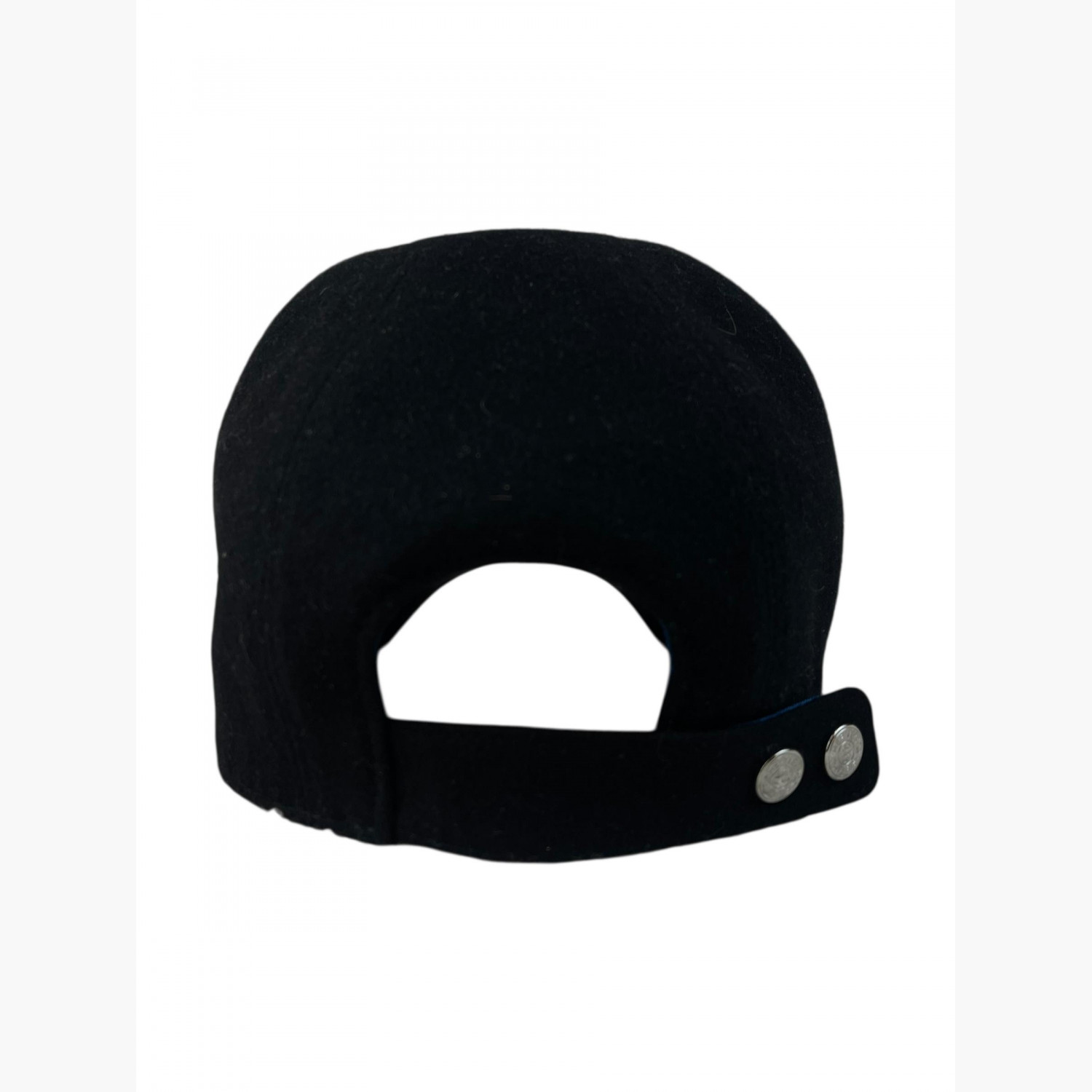 Black cashmere men’s cap with a large logo on the front. Composition: main material — 100% cashmere; lining — 65% viscose, 35% silk; inner trim — 56% cotton, 44% viscose. In excellent condition, with a stain on the inner trim.