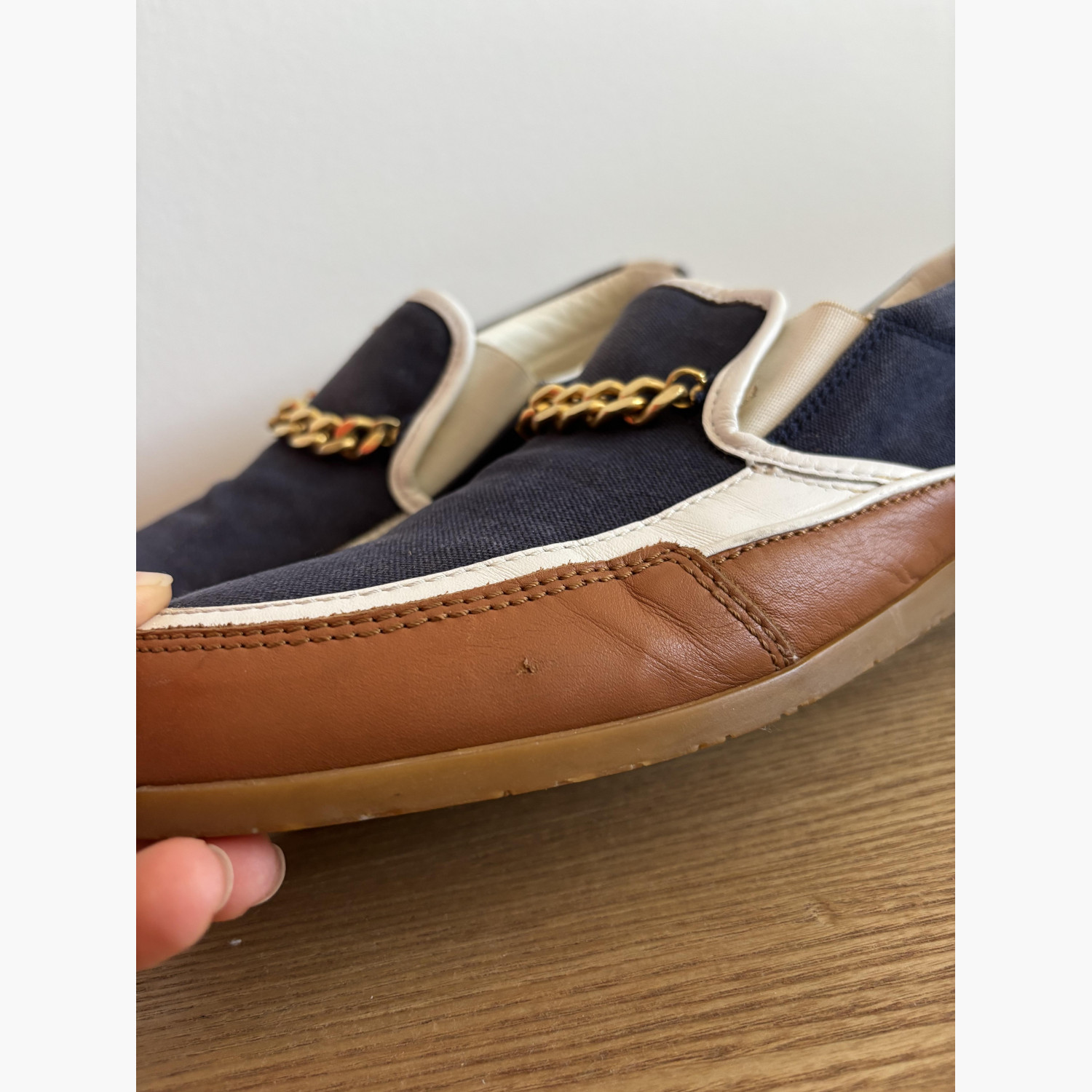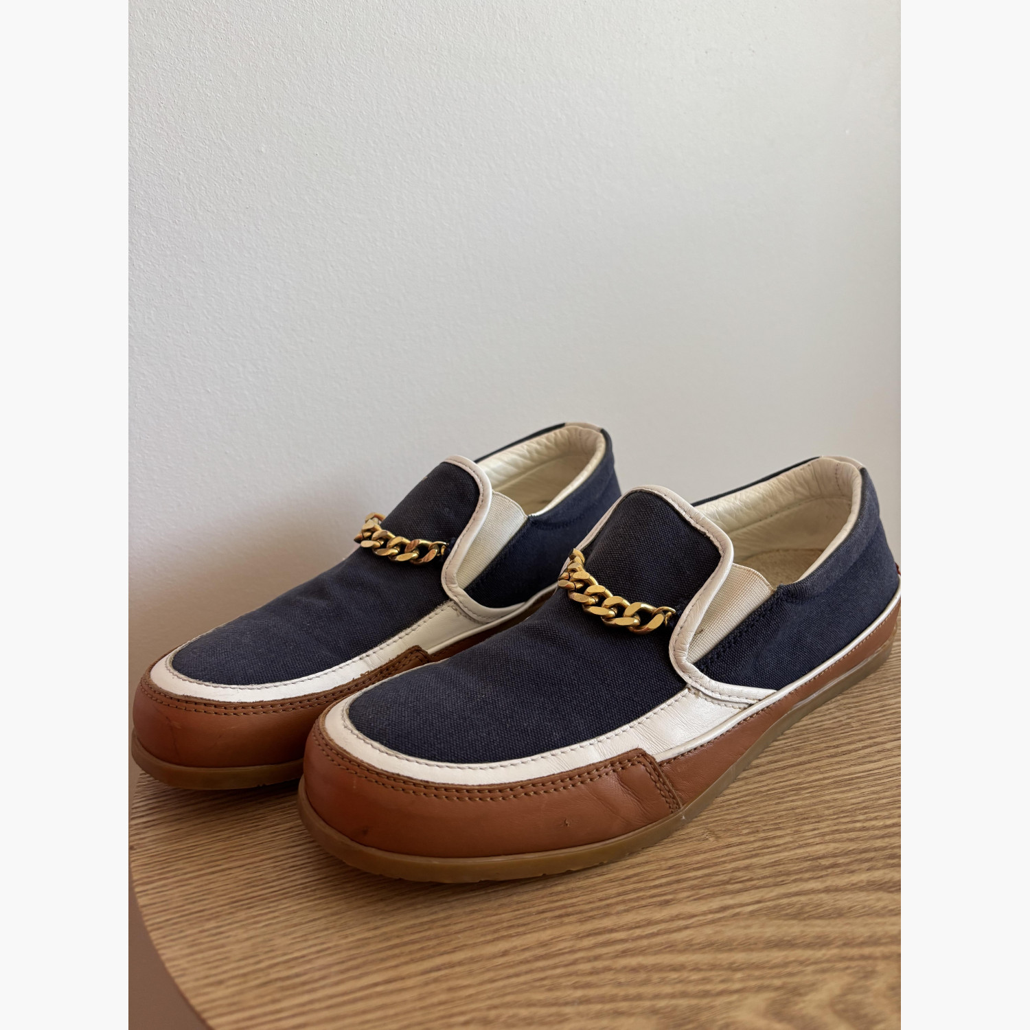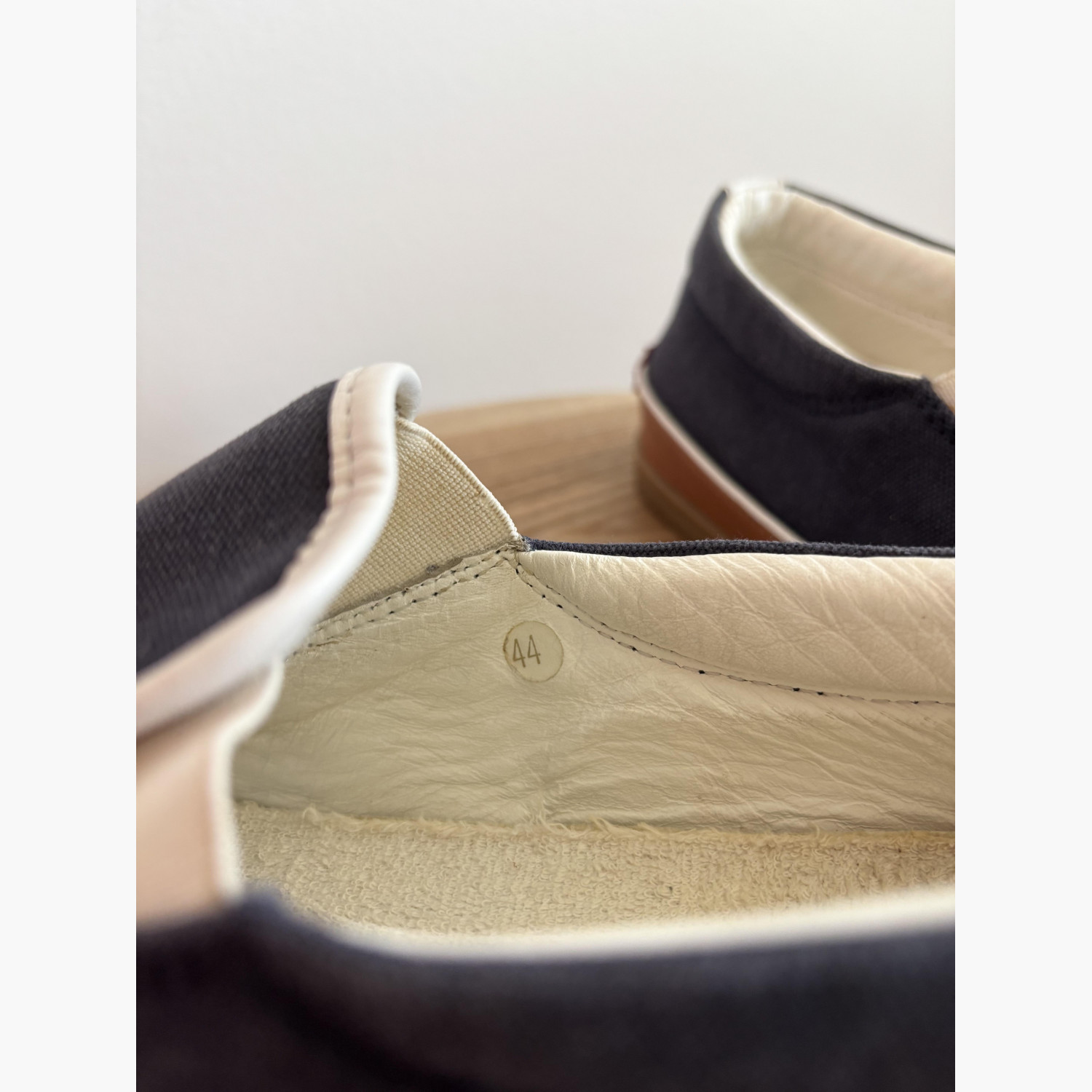 Men’s moccasins in very good condition. The interior is fully leather-lined, while the upper combines textile and leather. There is a small scratch on the front (barely noticeable from a distance).