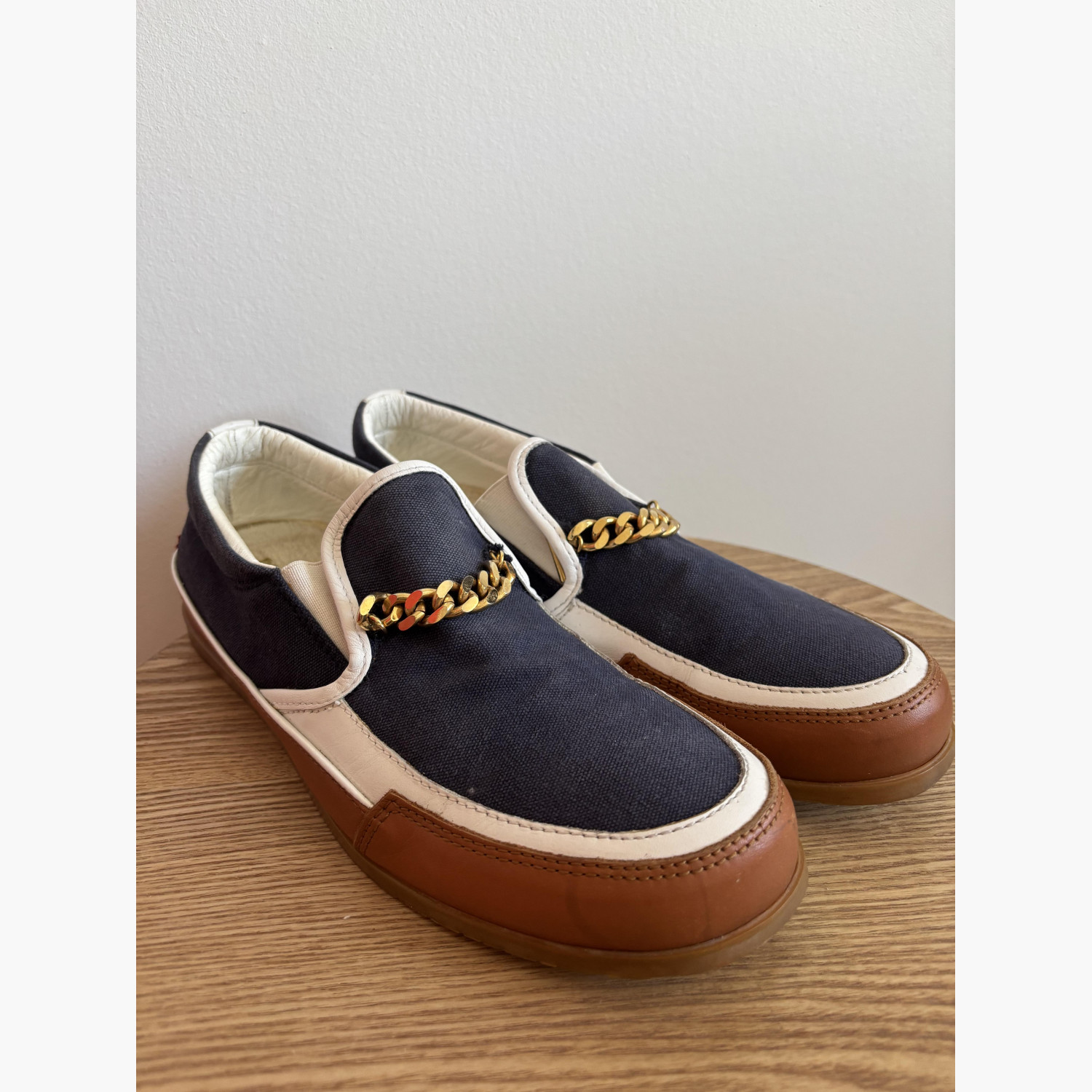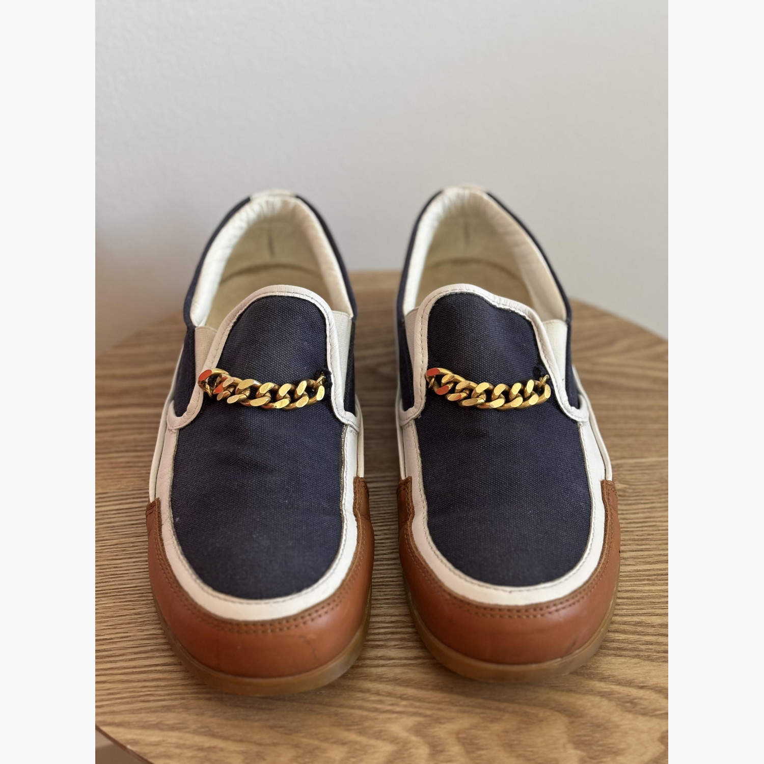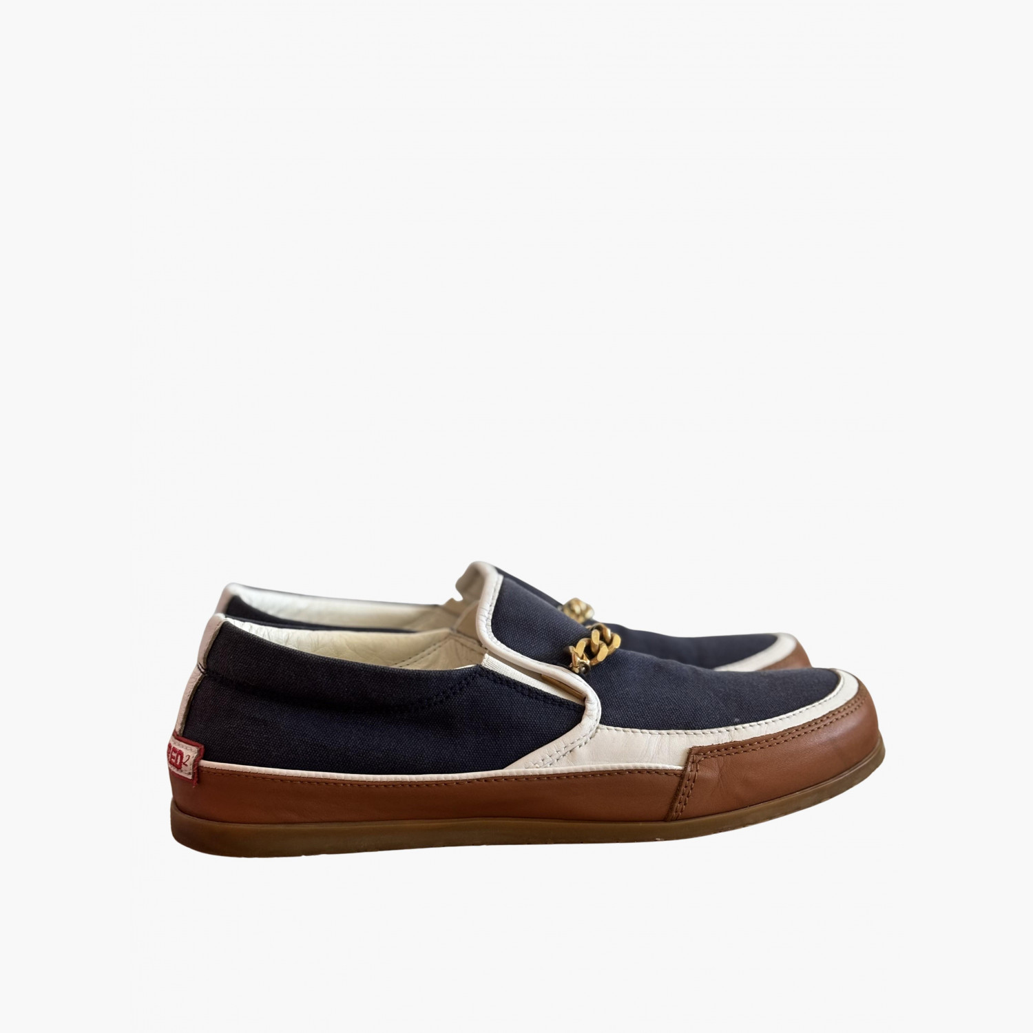 Men’s moccasins in very good condition. The interior is fully leather-lined, while the upper combines textile and leather. There is a small scratch on the front (barely noticeable from a distance).