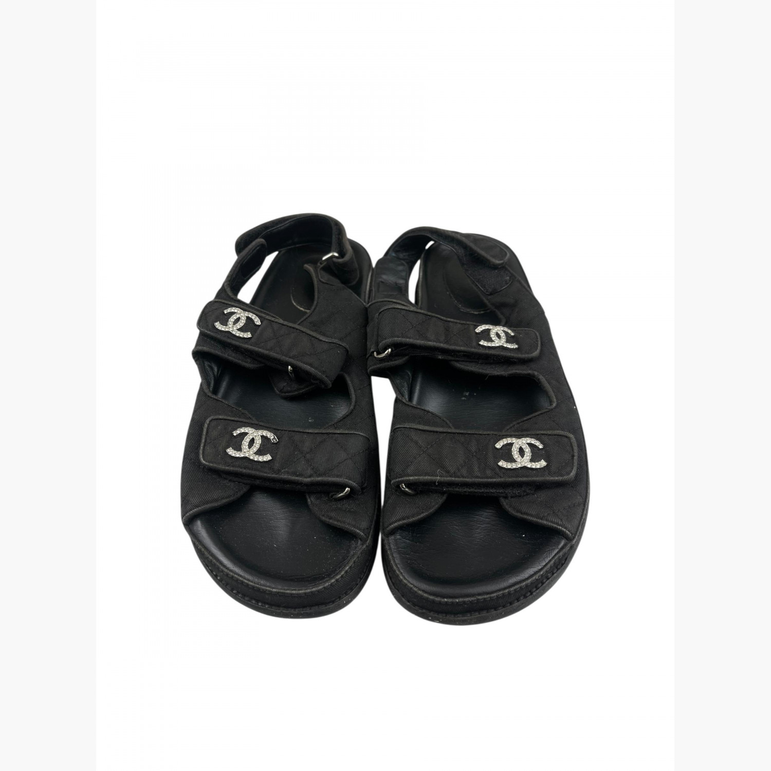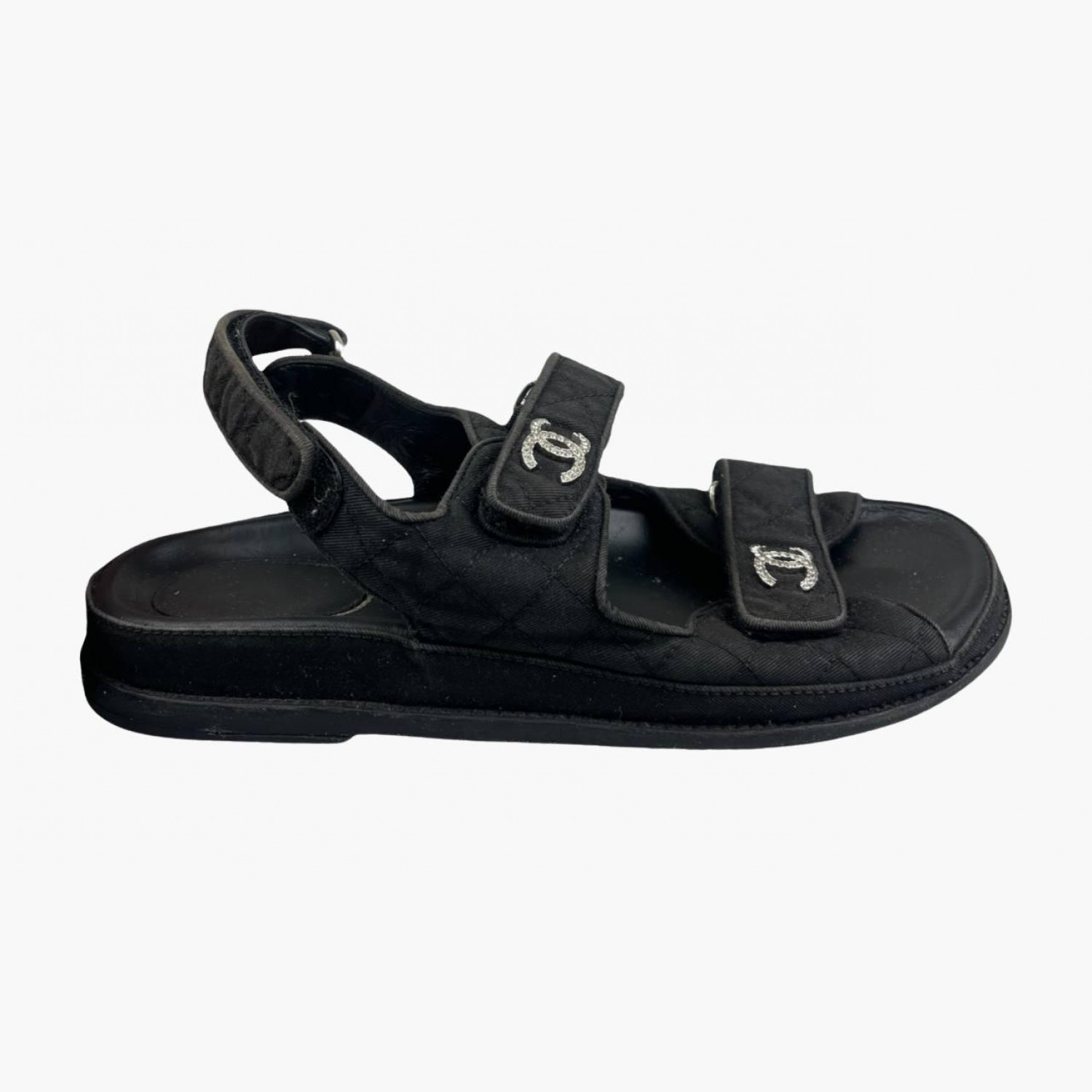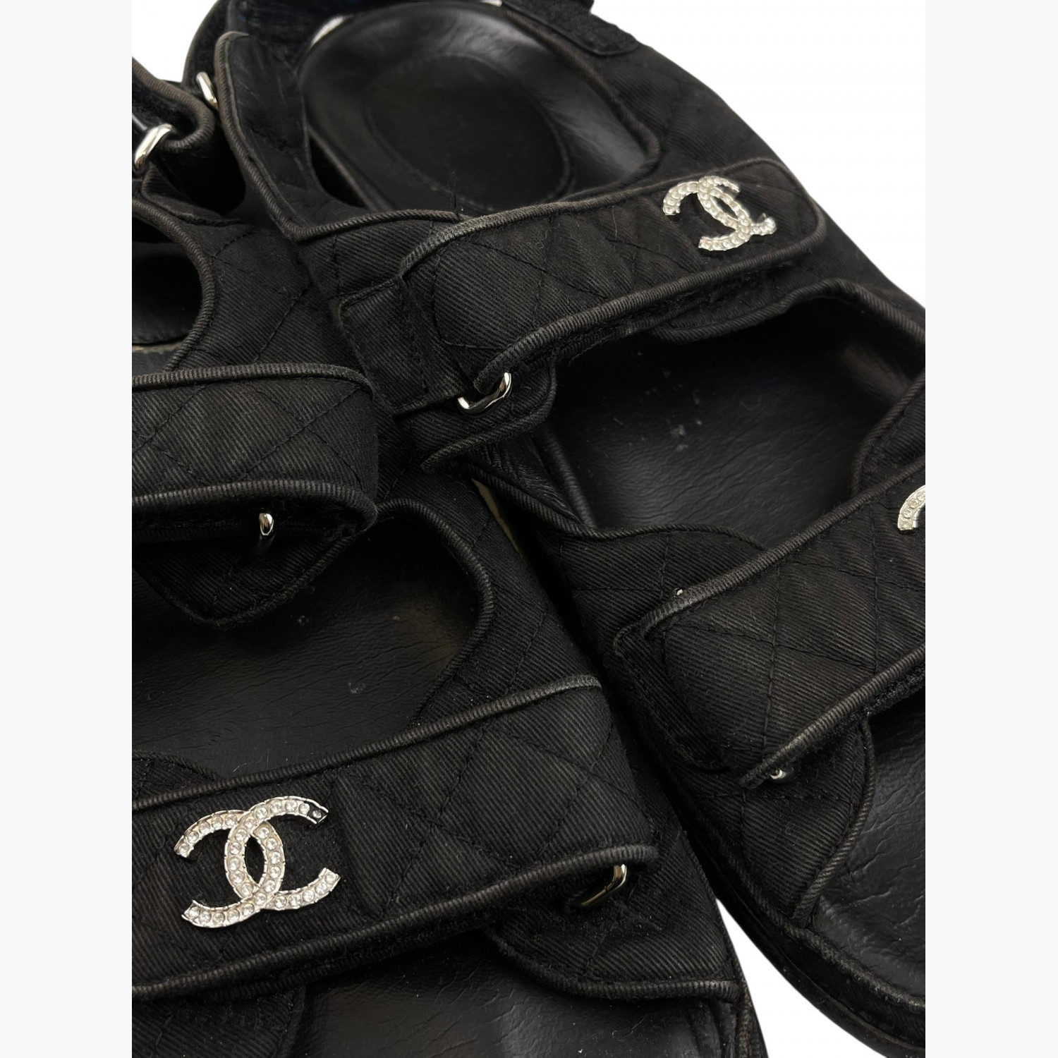 Текстильні стьобані сандалі з логотипом з каменів на ремінцях. У хорошому стані, є сліди вжитку.