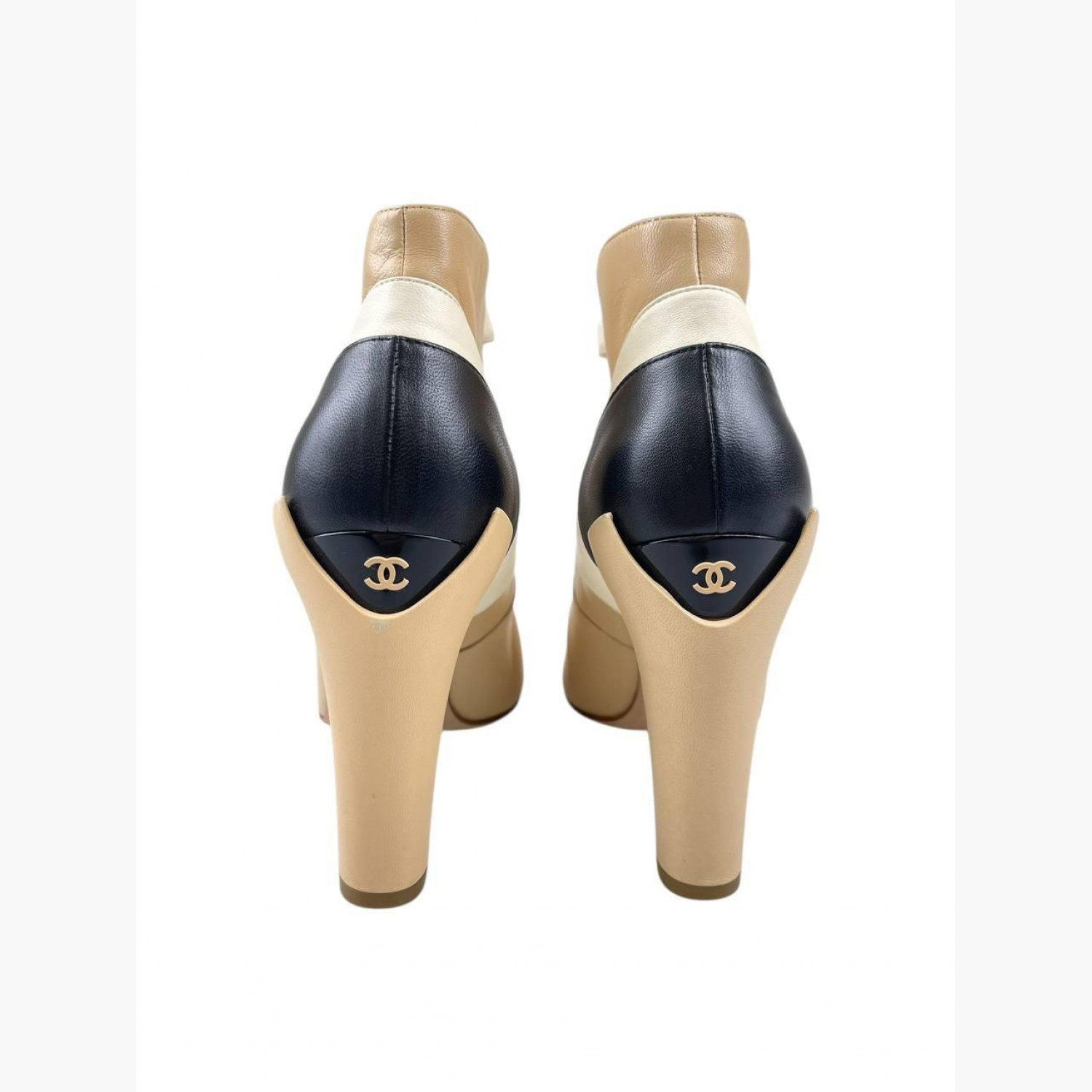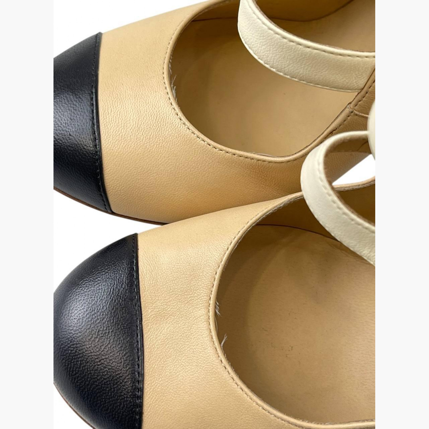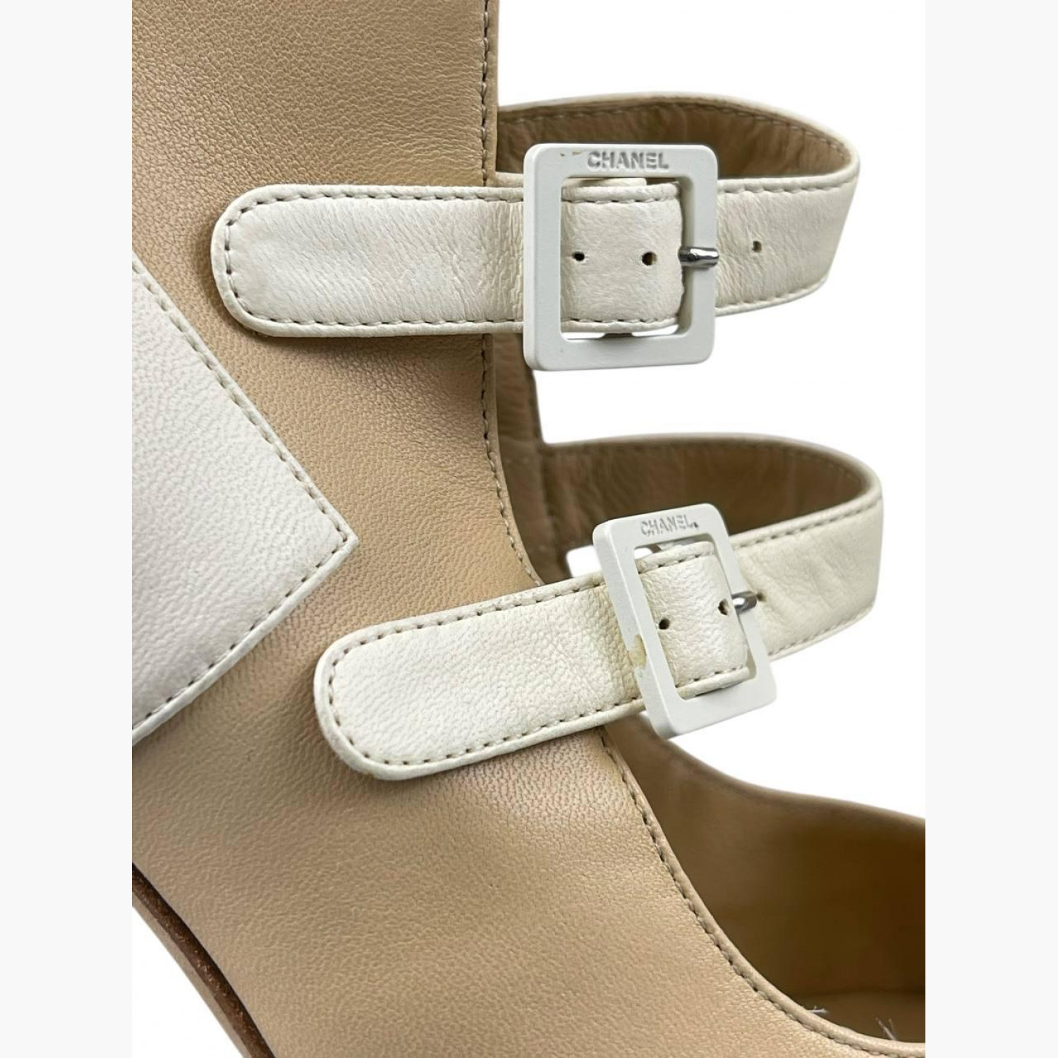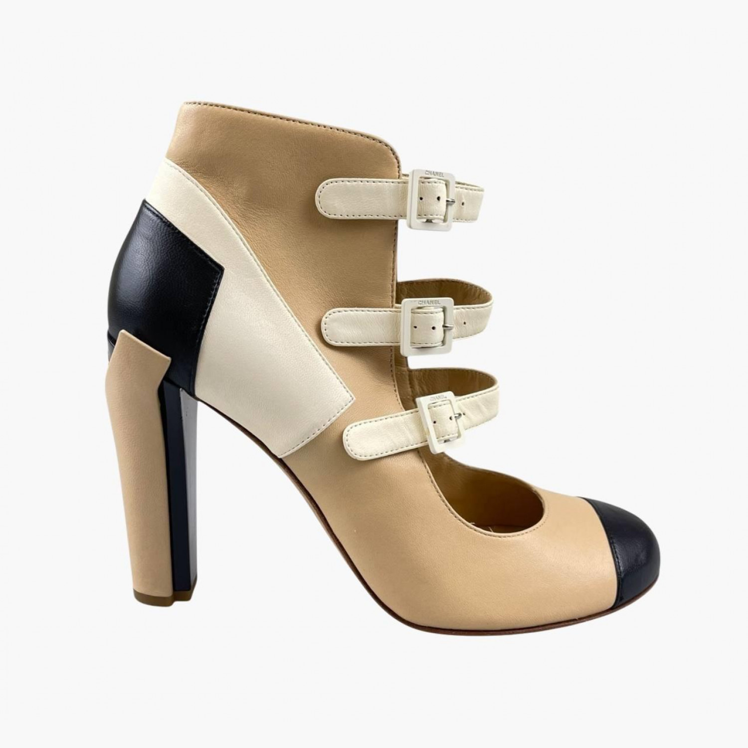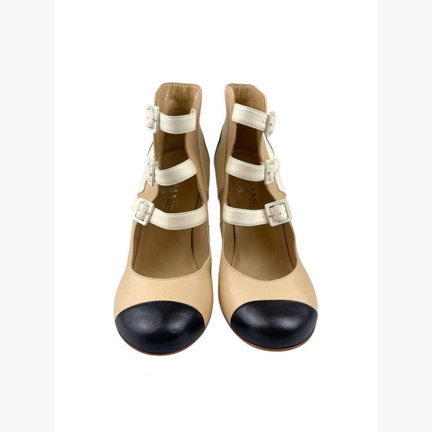 Бежеві шкіряні туфлі з круглим чорним носком і трьома пряжками молочного кольору. В чудовому стані, є незначні сліди вжитку.