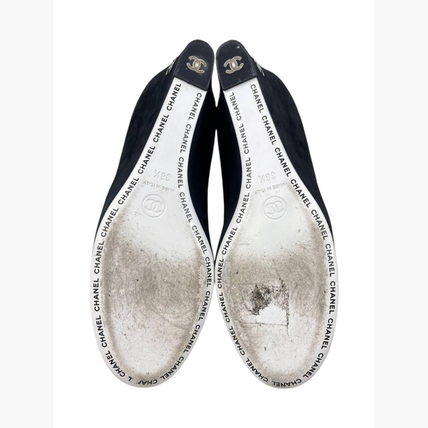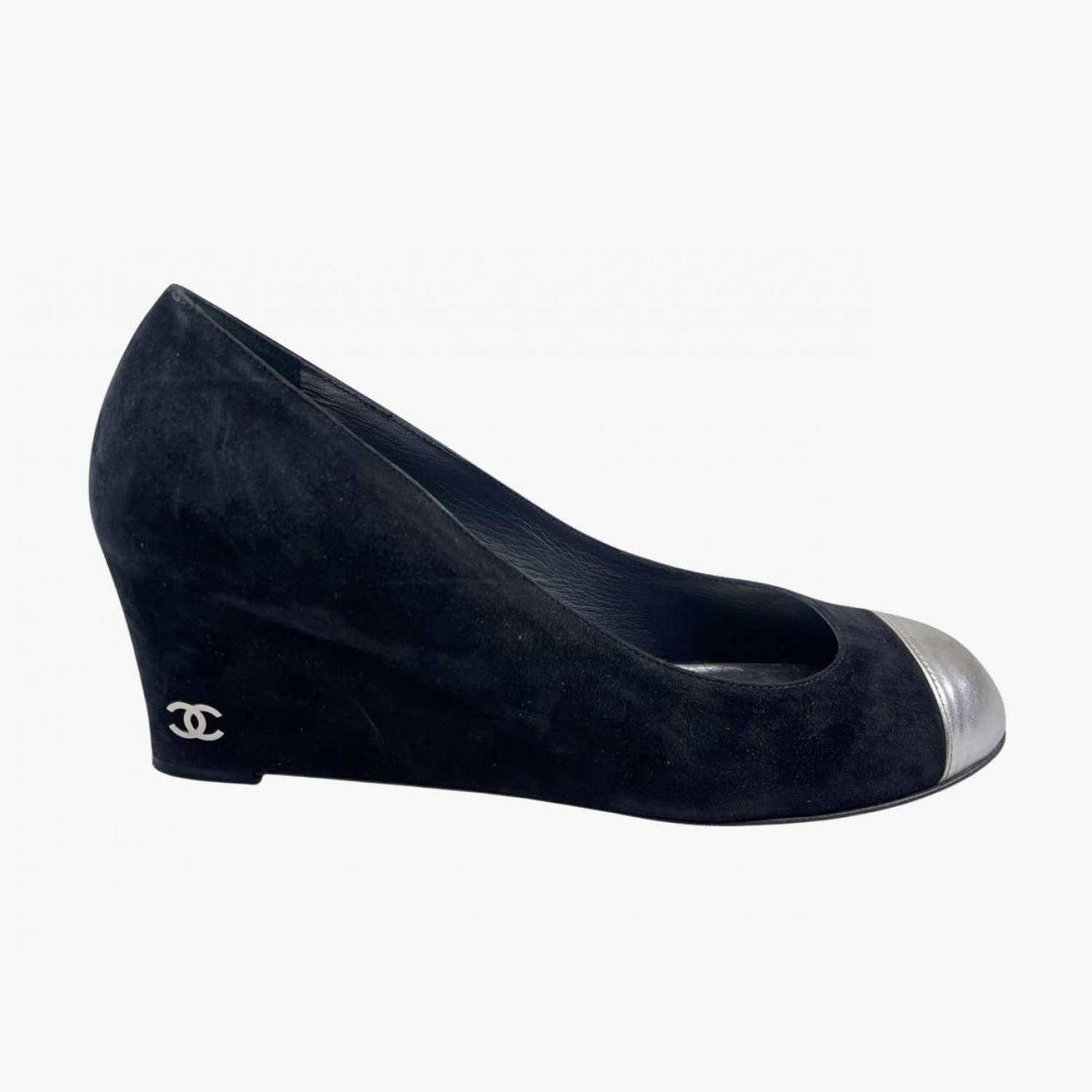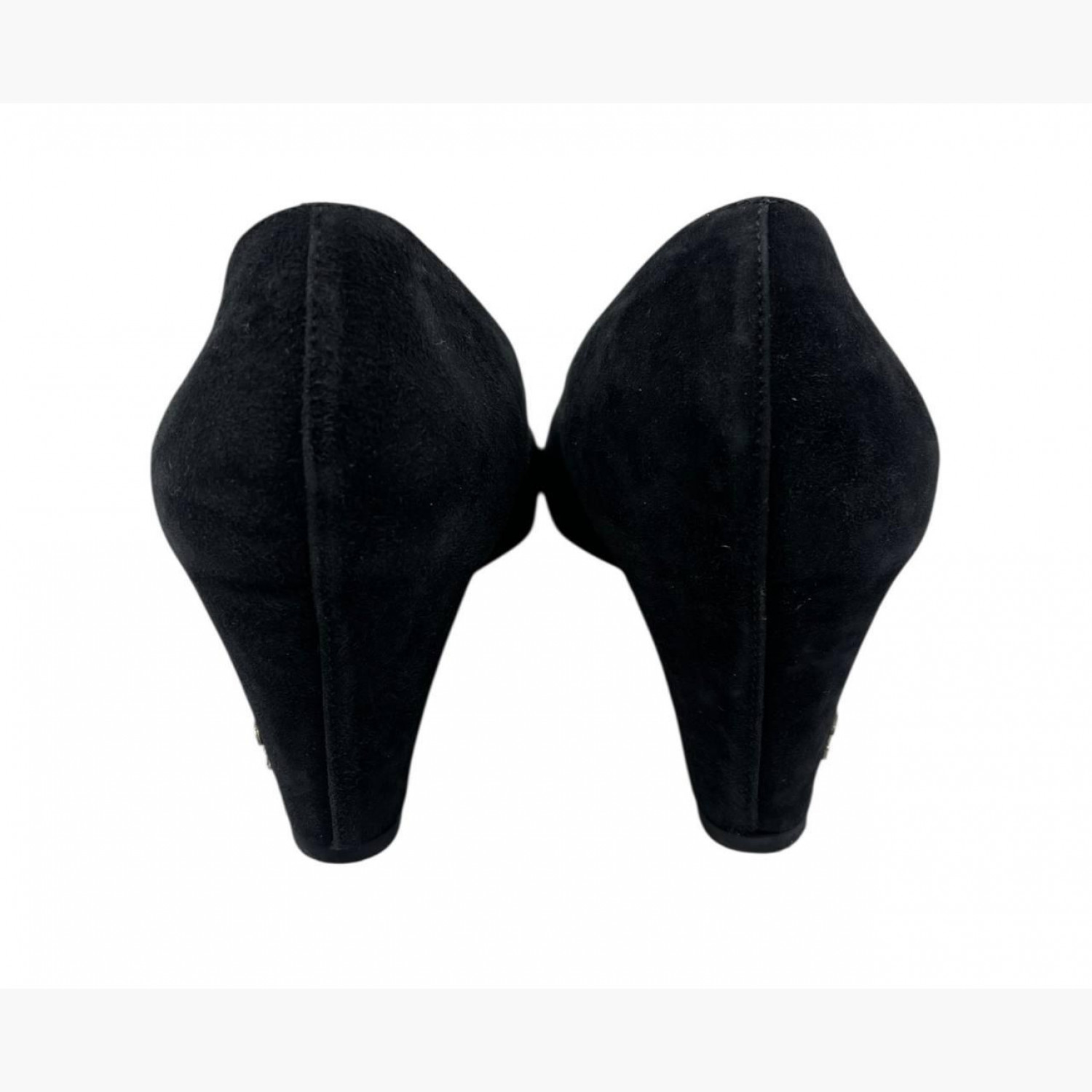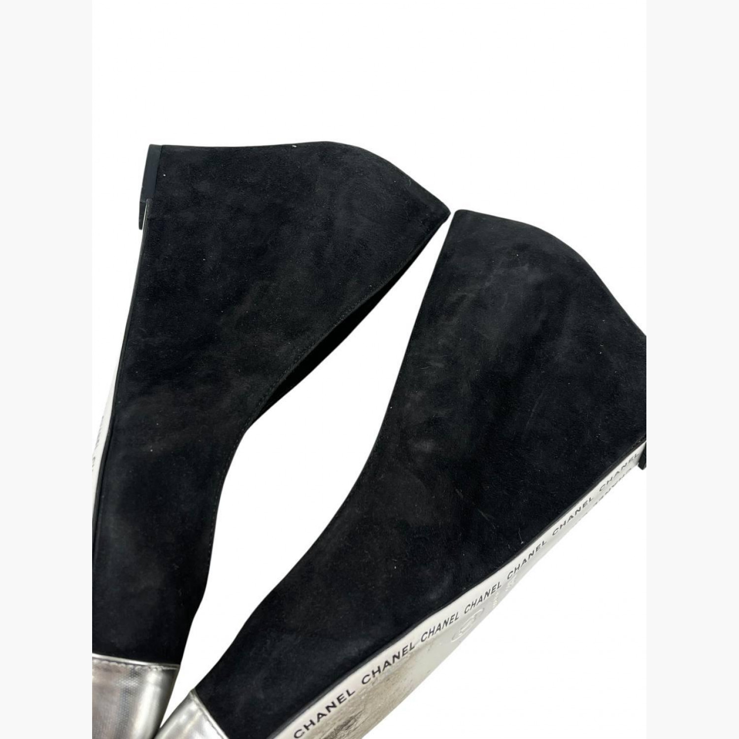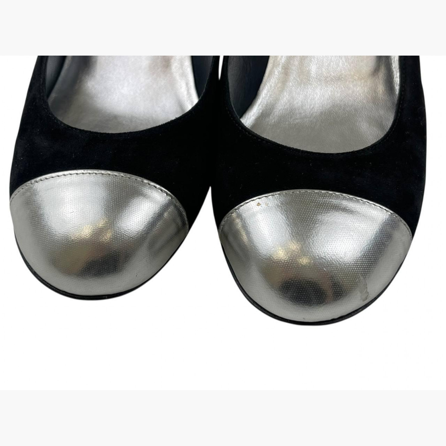 Чорні замшеві туфлі на танкетці з сріблястим носком. У дуже хорошому стані, є незначні сліди вжитку.