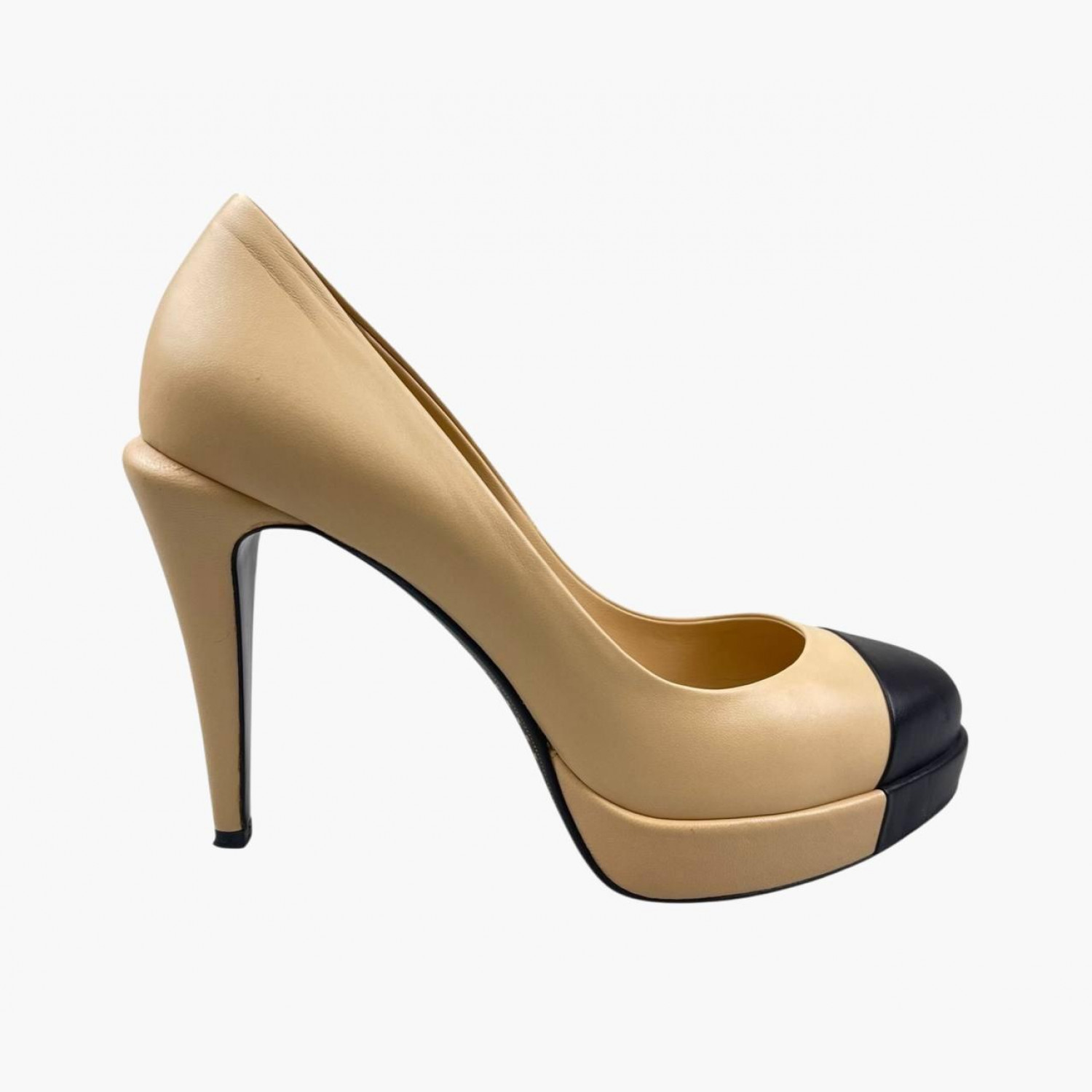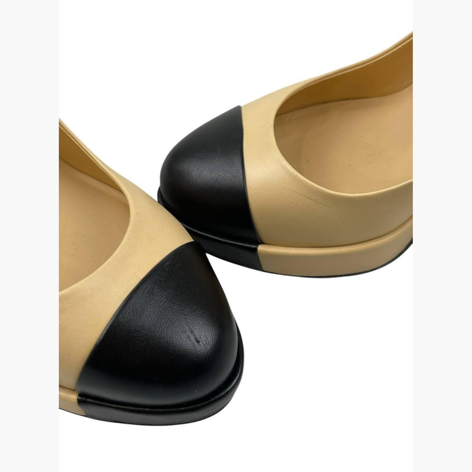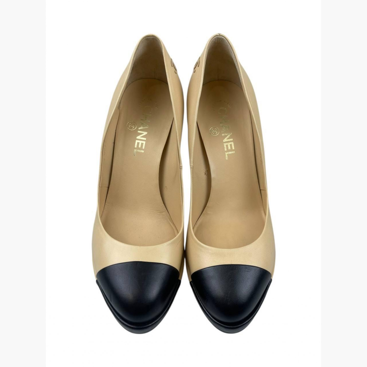 Бежеві шкіряні туфлі з круглим чорним носком. У хорошому стані, є сліди вжитку.
