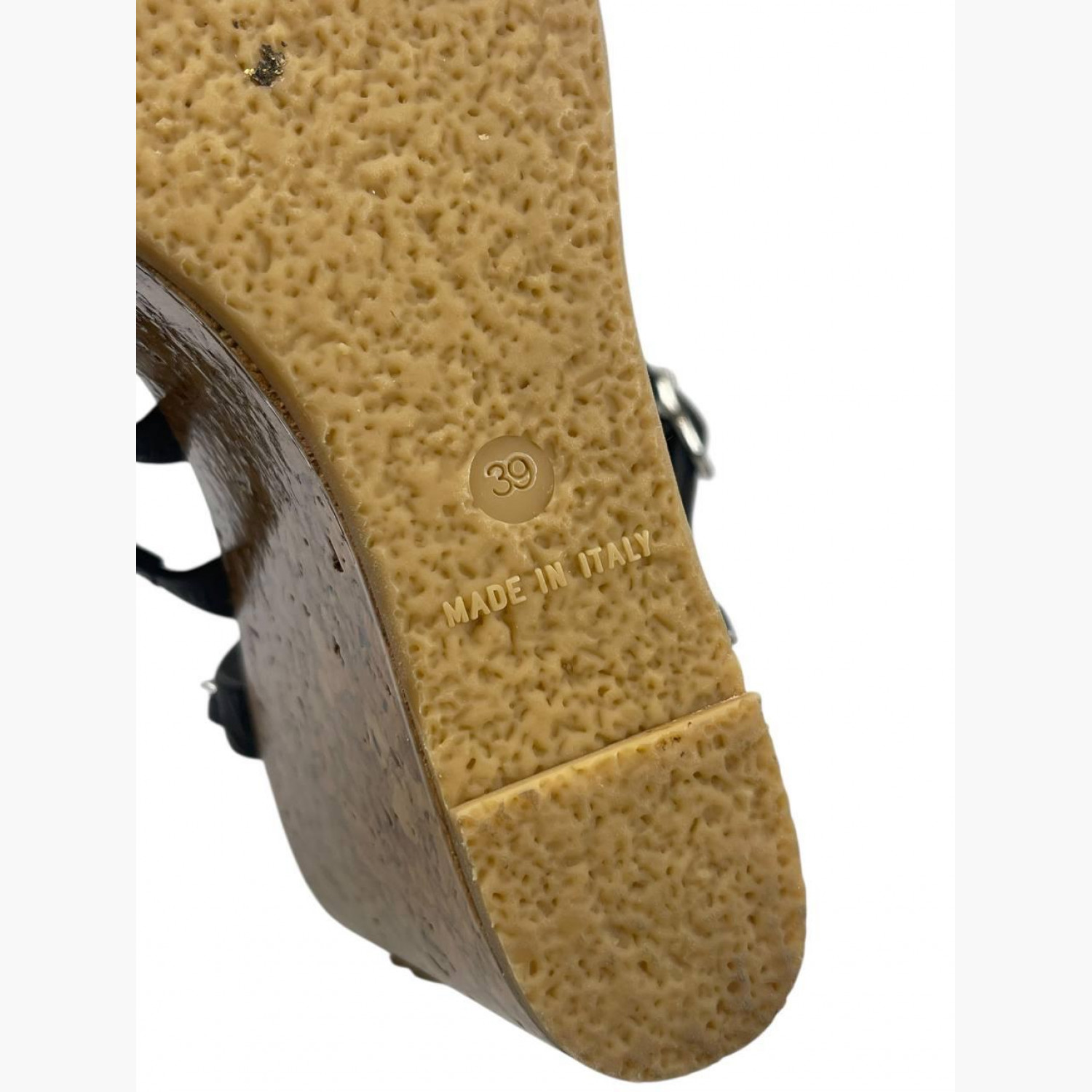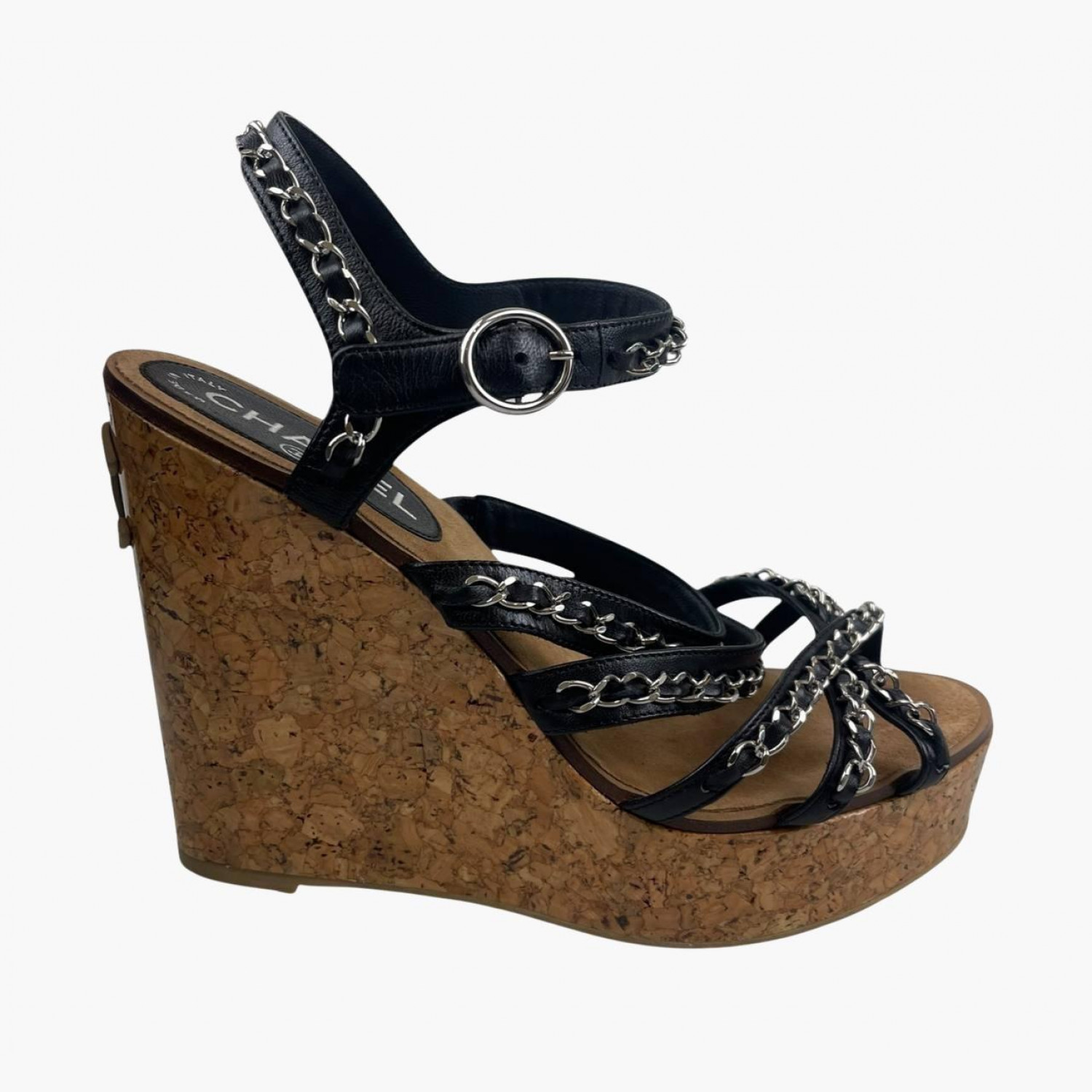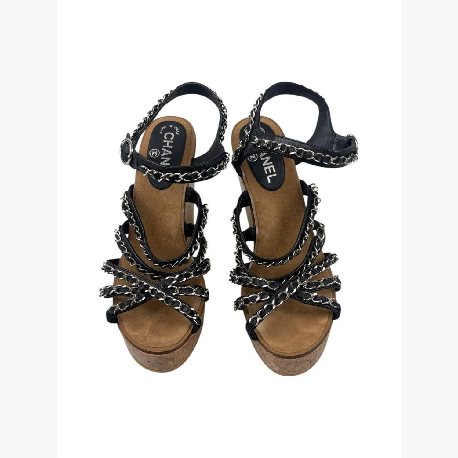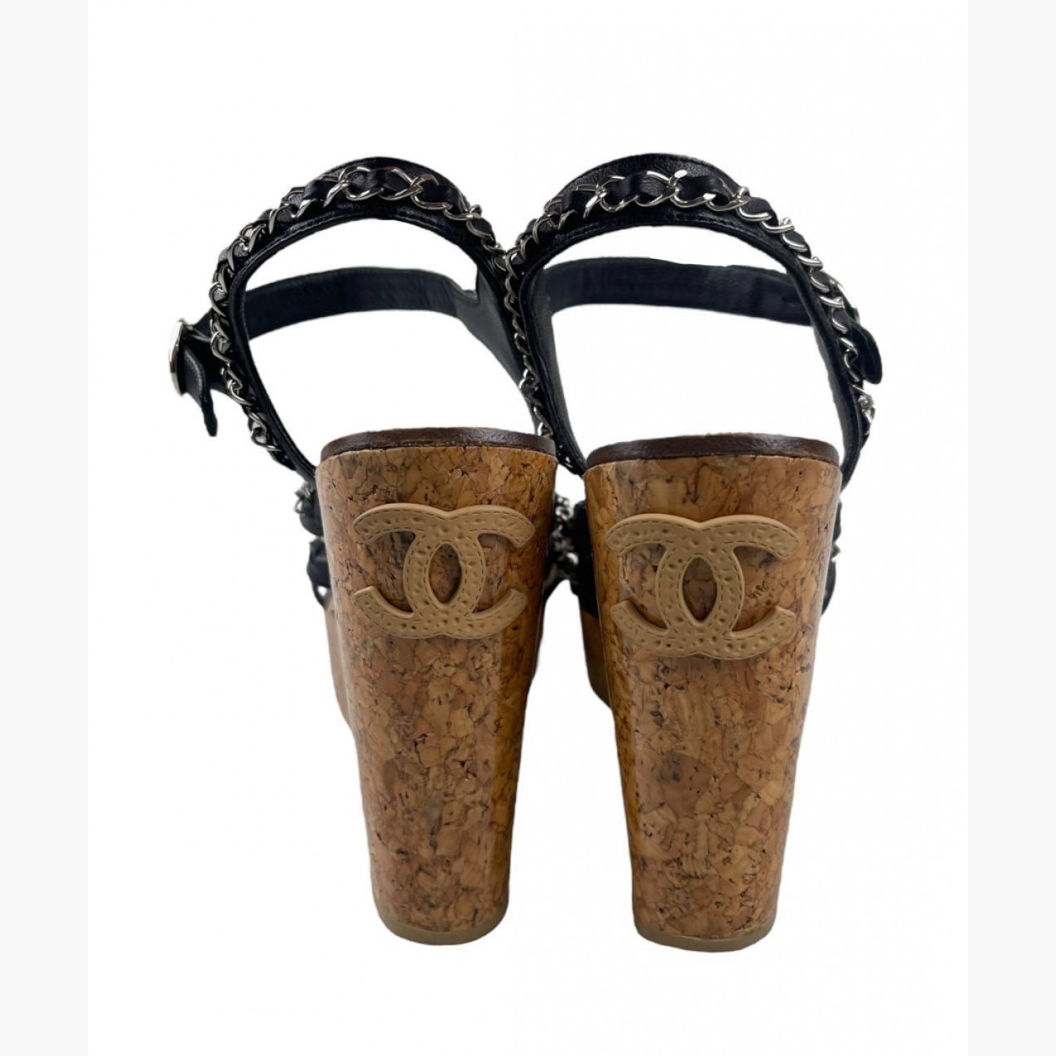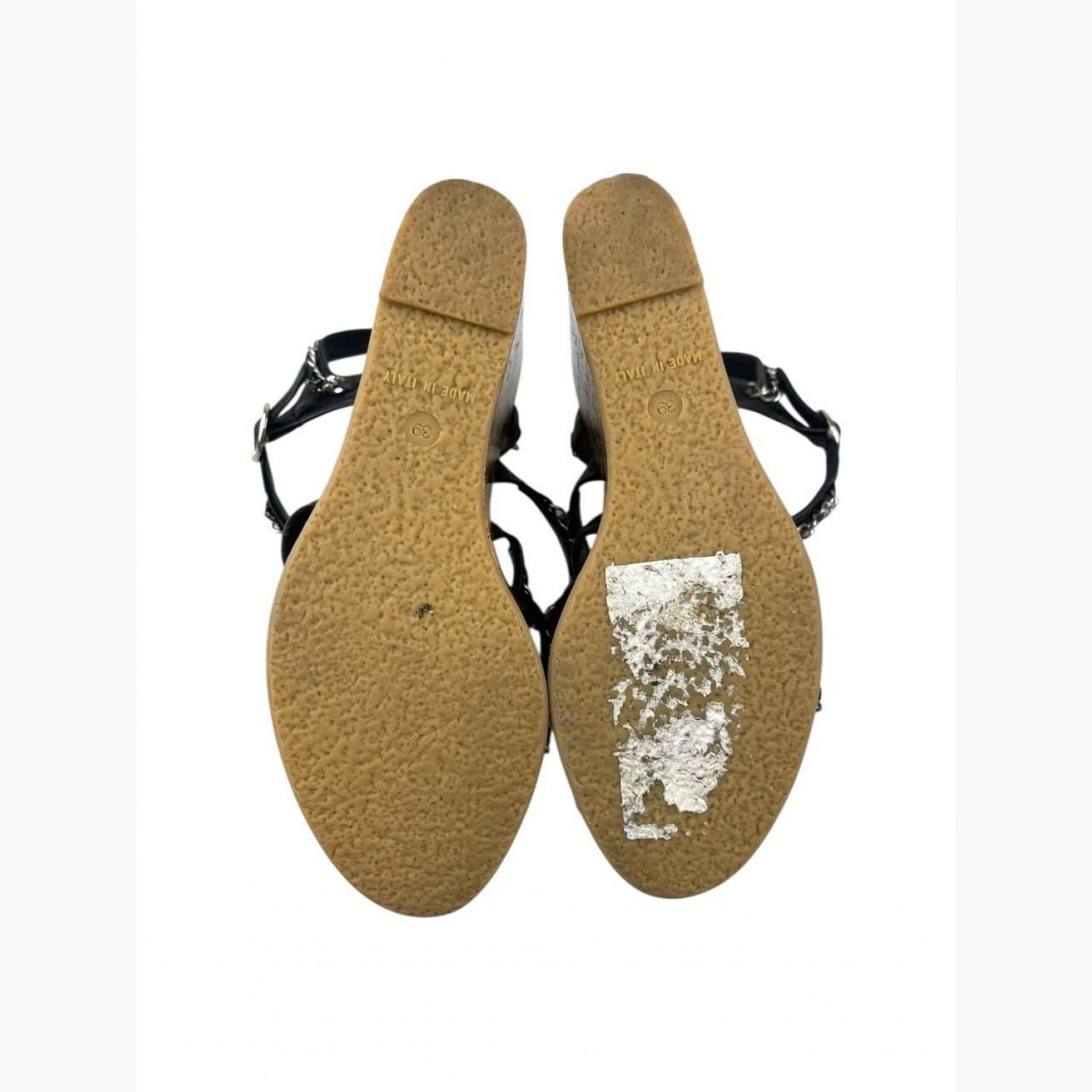Чорні шкіряні босоніжки на танкетці з чорними шкіряними пряжками у вигляді ланцюгів. У відмінному стані, без слідів вжитку.