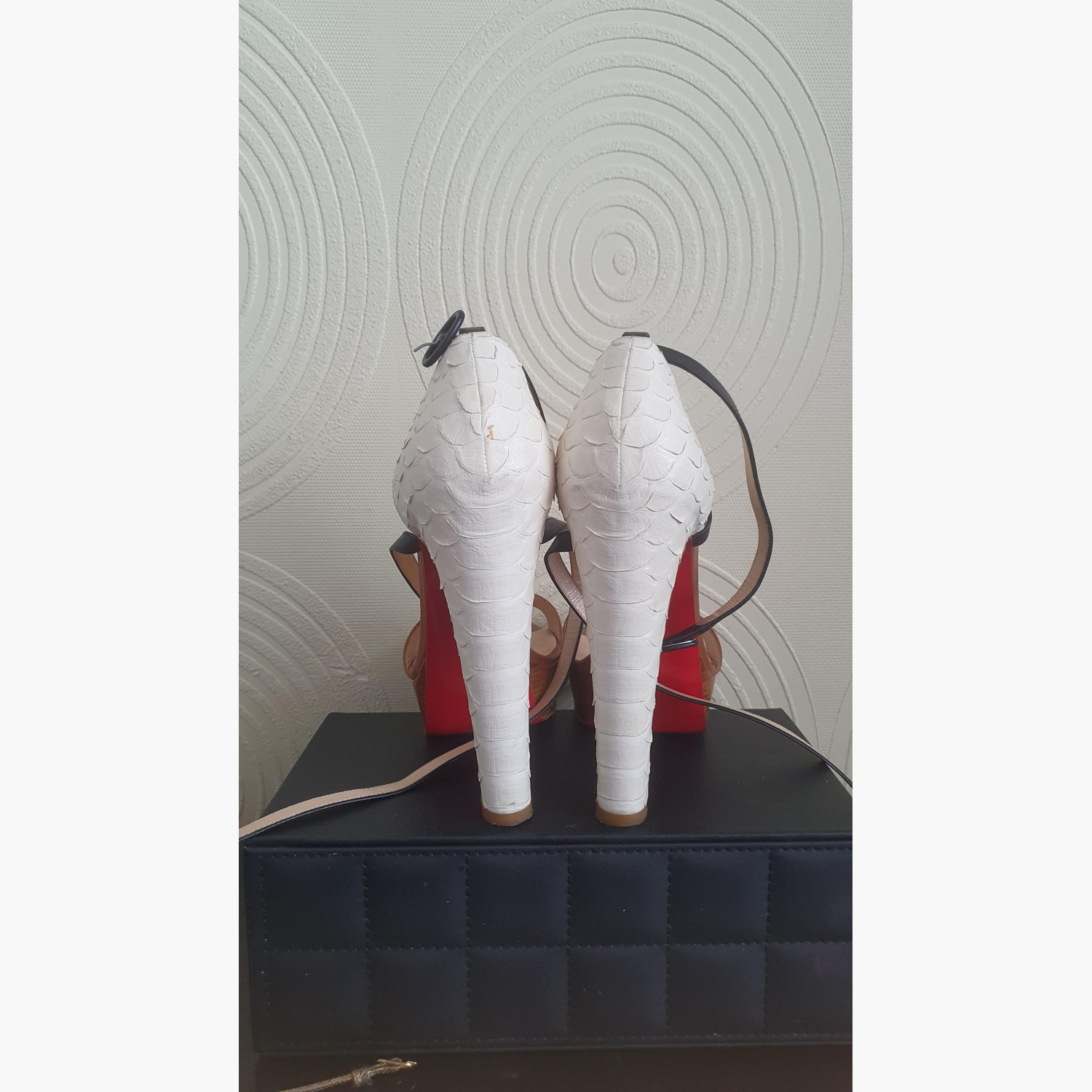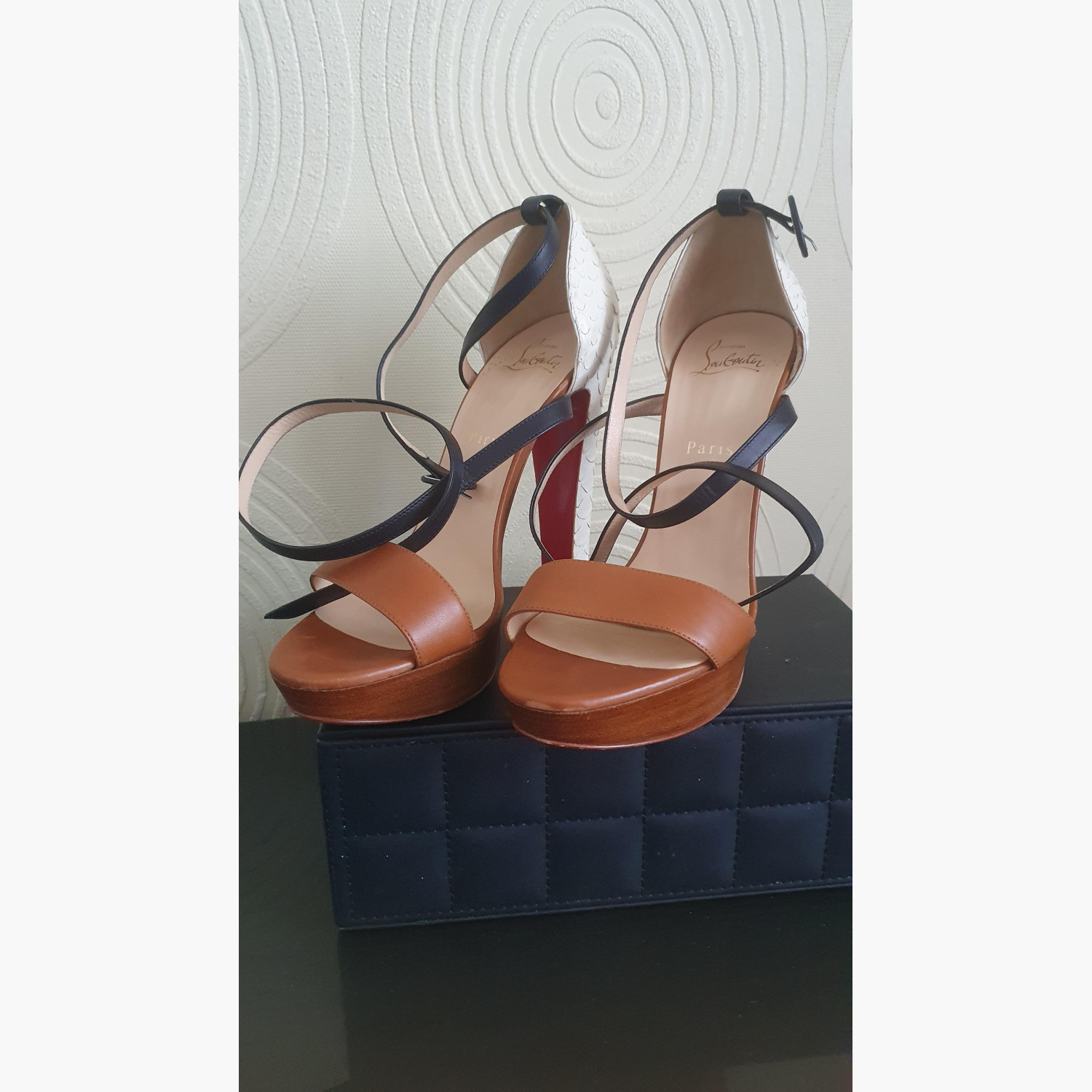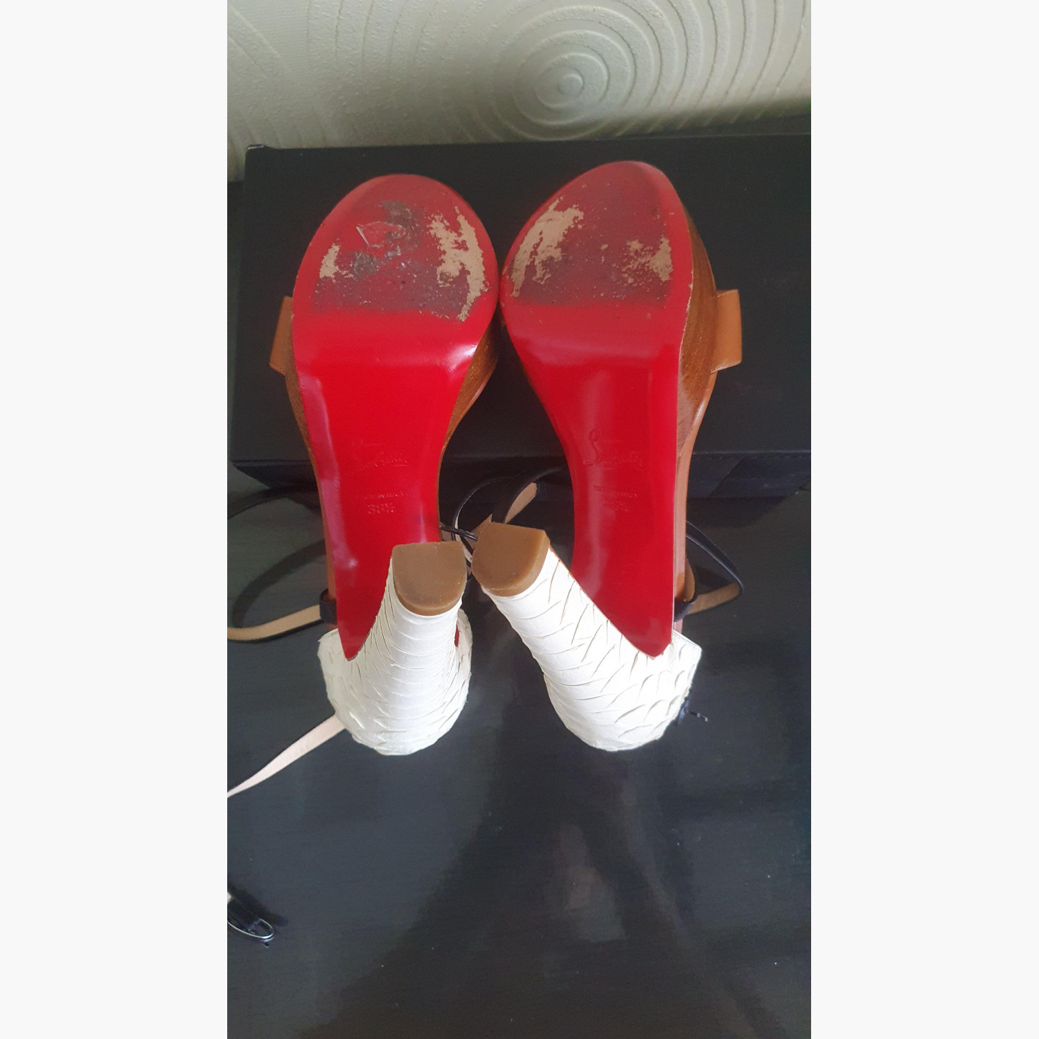 Коричневі шкіряні босоніжки на ремінцях з відкритим носком і білим шкіряним підбором у вигляді луски.У гарному стані.