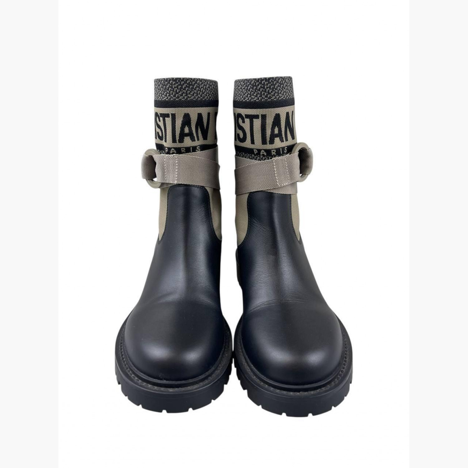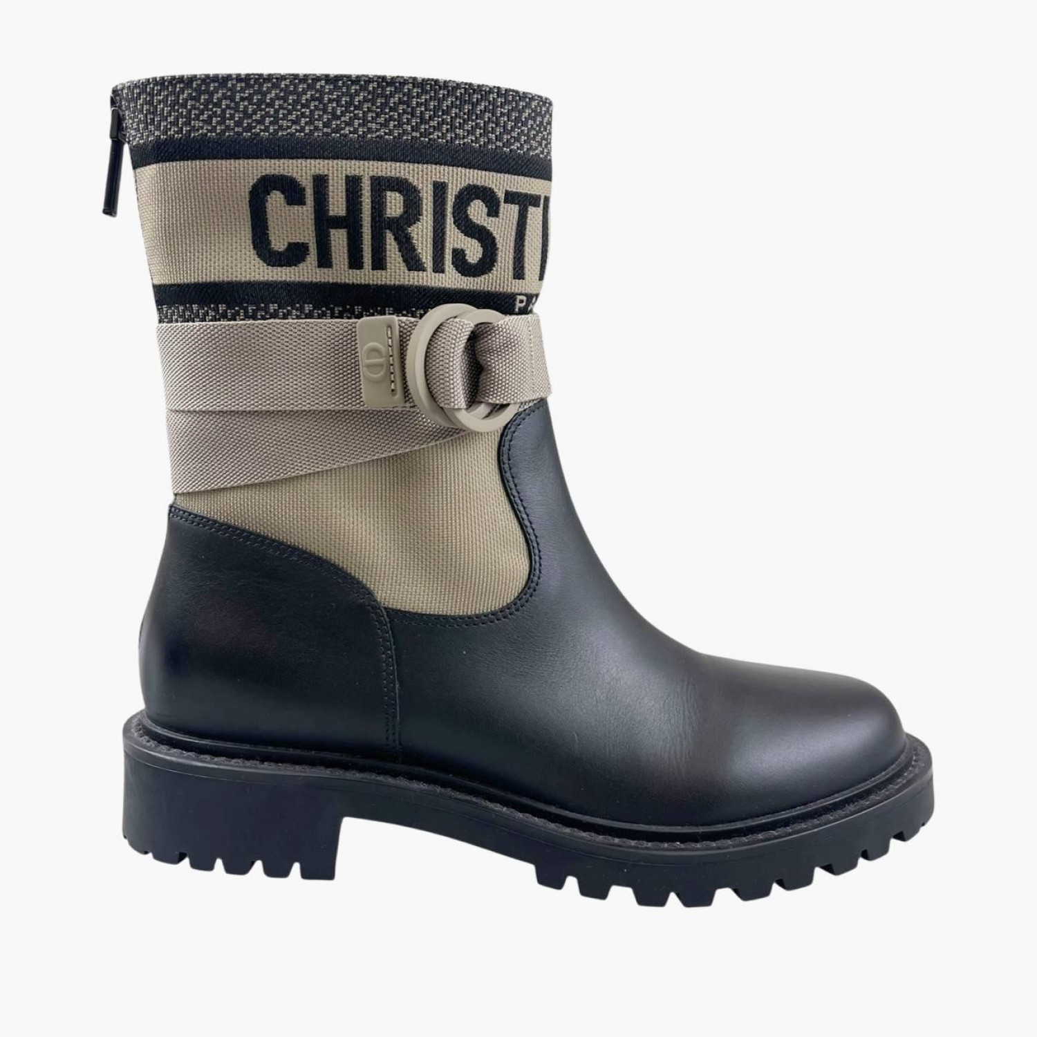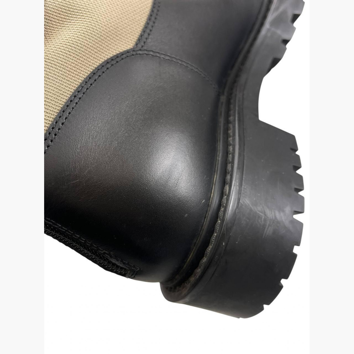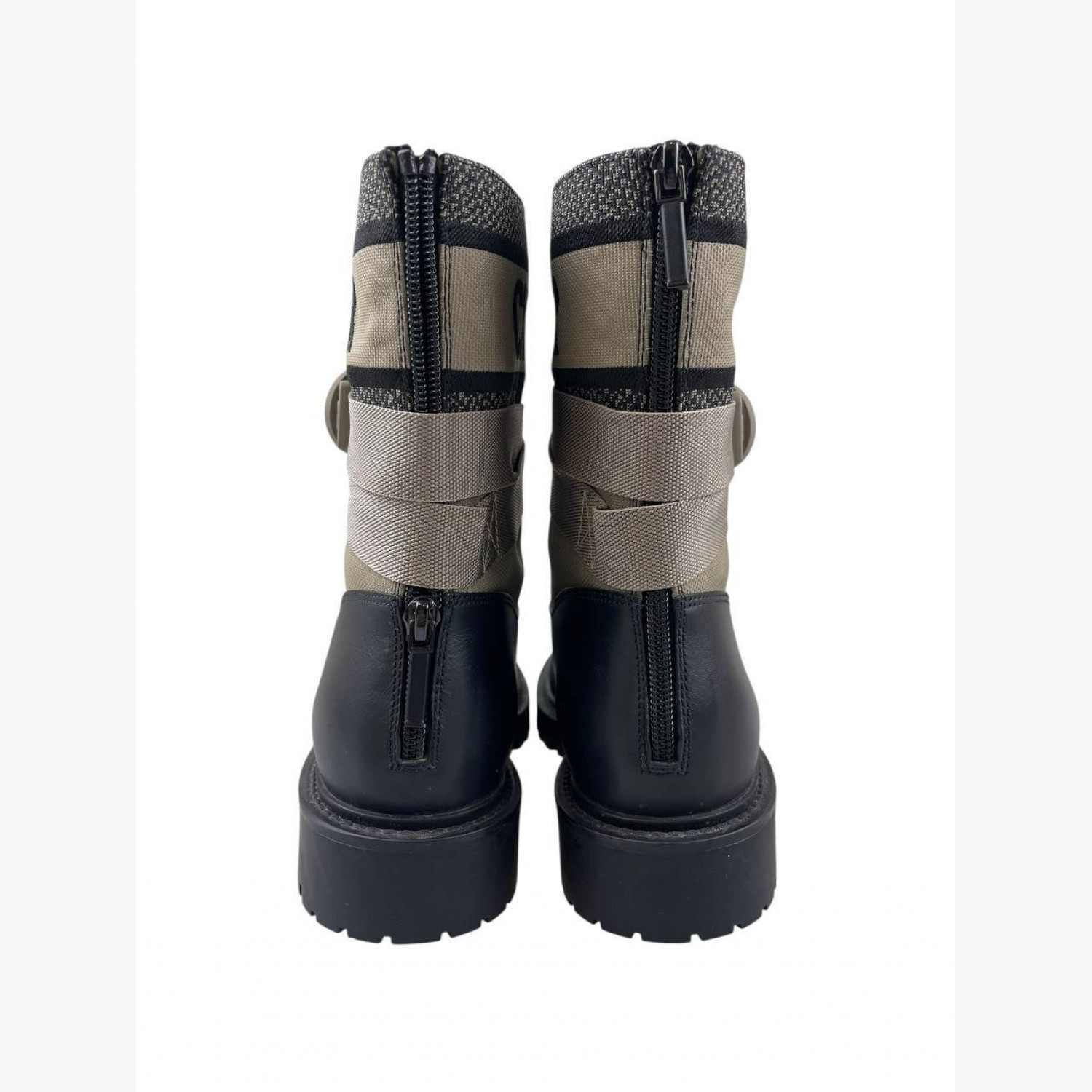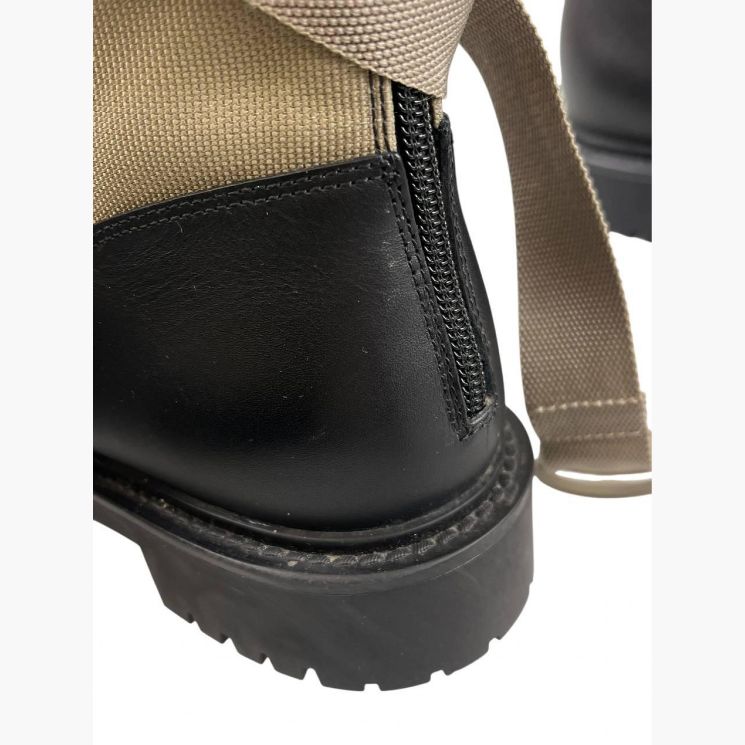 Бежеві текстильні черевики з шкіряними вставками, ремінною стрічкою та блискавкою ззаду. У відмінному стані, є незначні сліди вжитку.