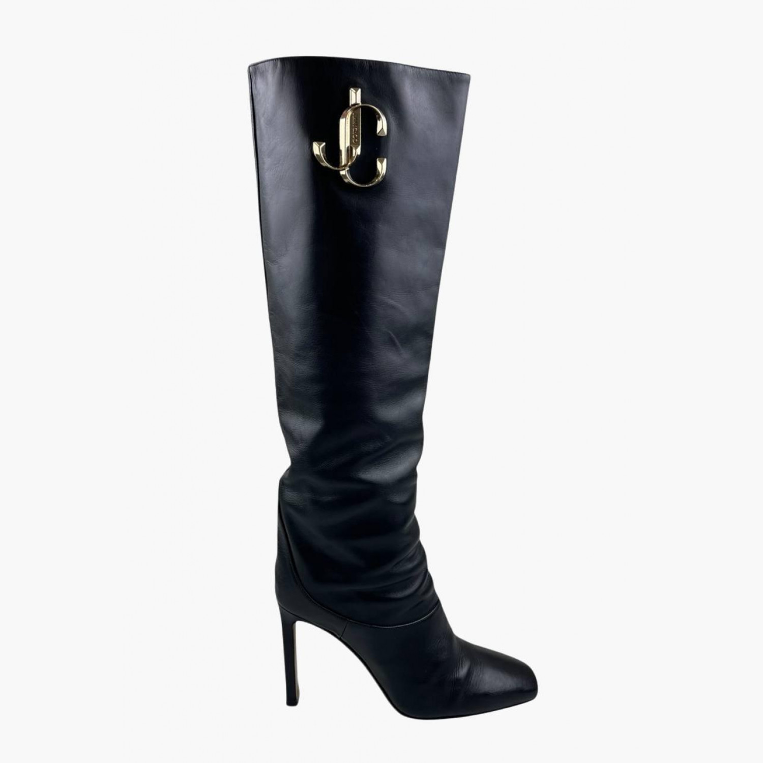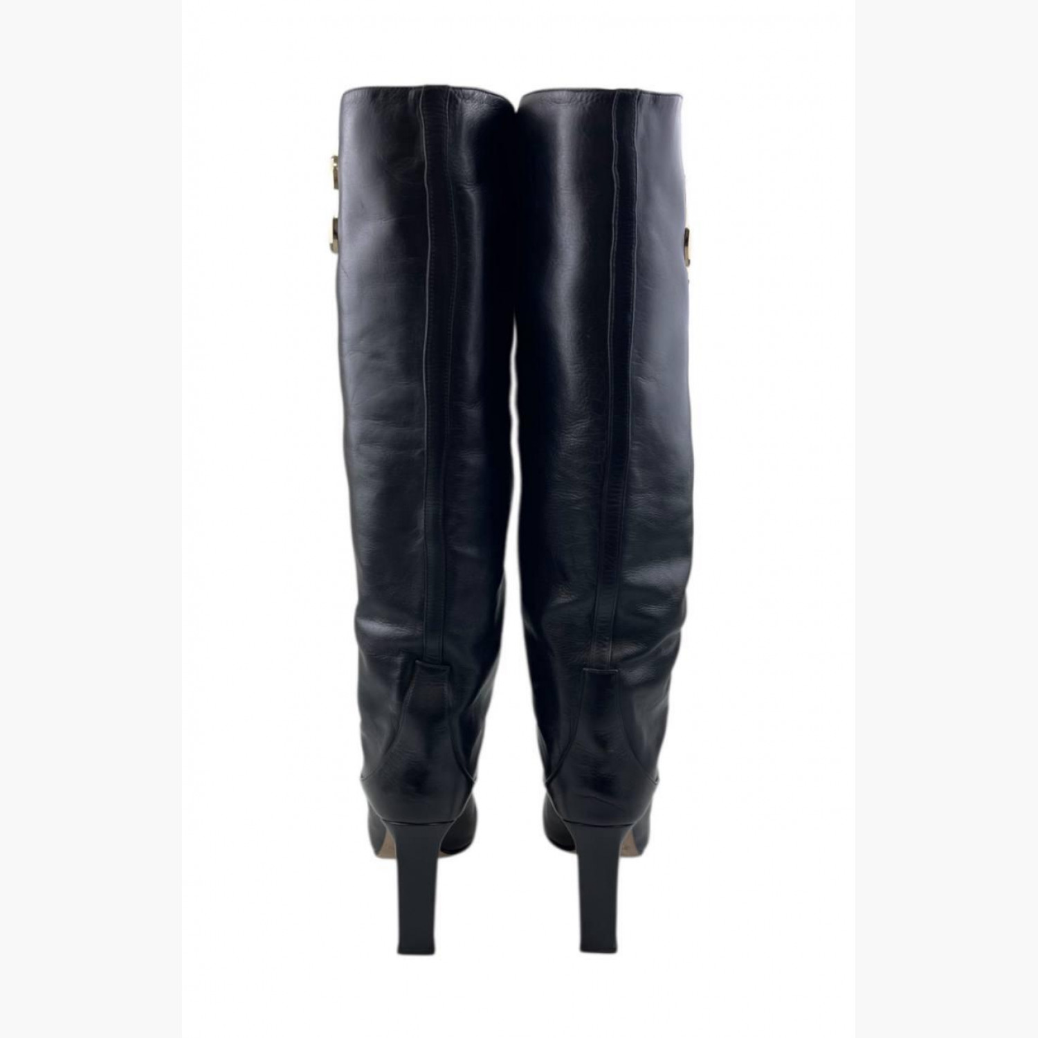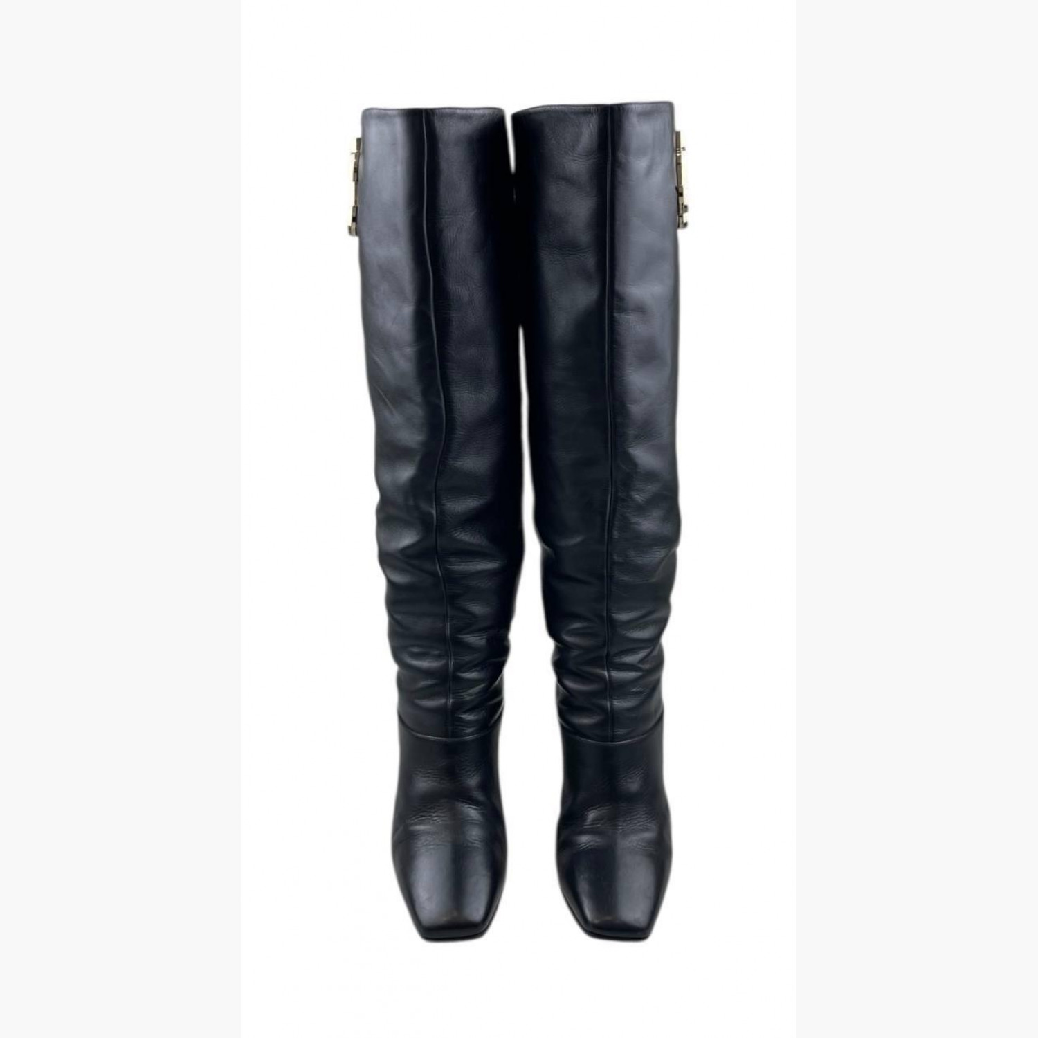 Чорні шкіряні ботфорти на високому каблуку з металевим логотипом золотого кольору. У відмінному стані, є незначні сліди вжитку.