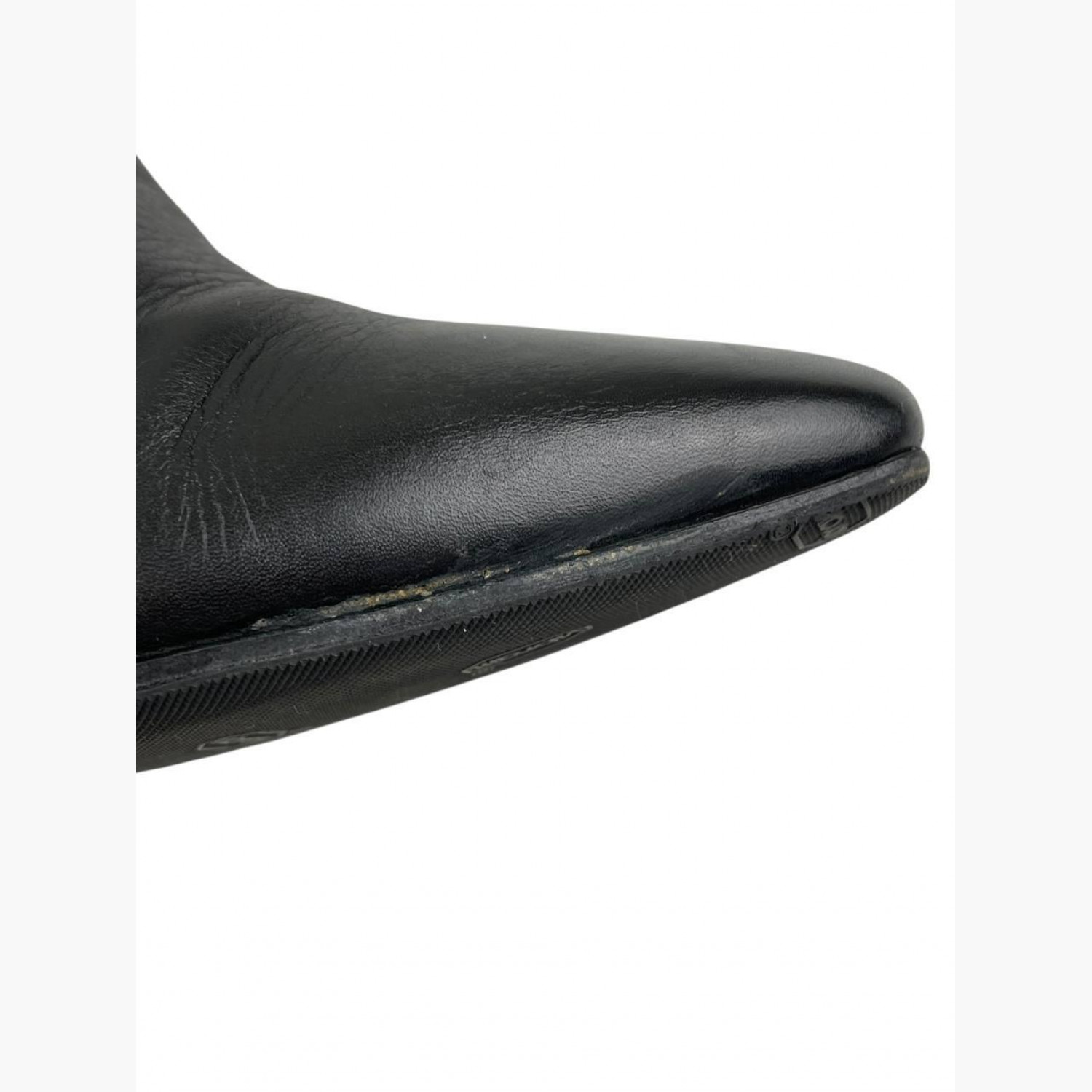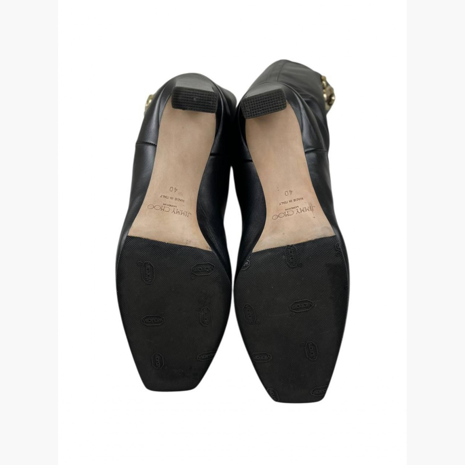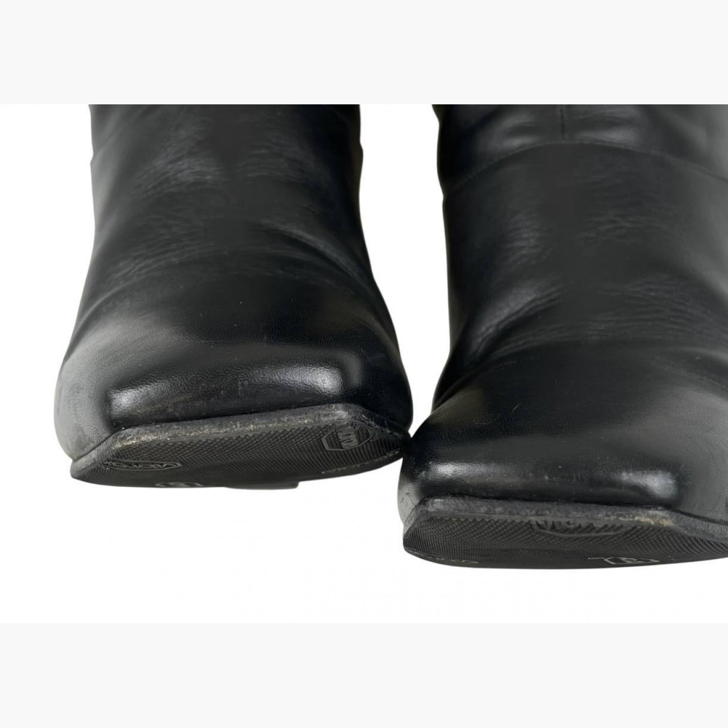 Чорні шкіряні ботфорти на високому каблуку з металевим логотипом золотого кольору. У відмінному стані, є незначні сліди вжитку.