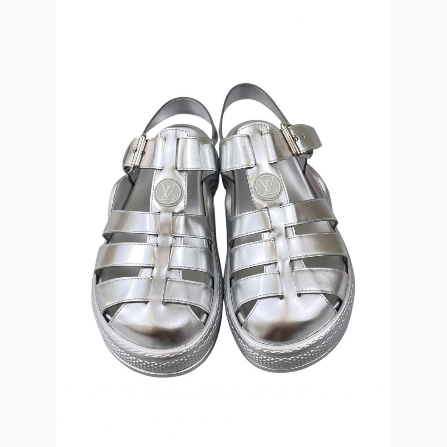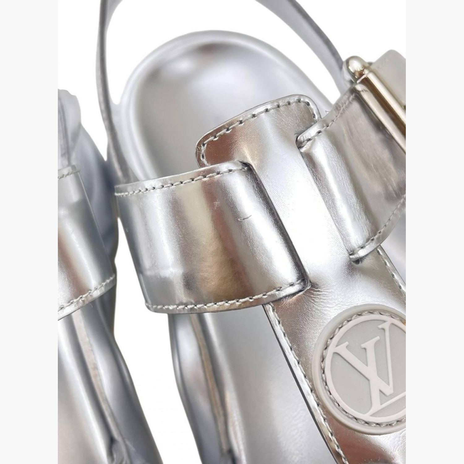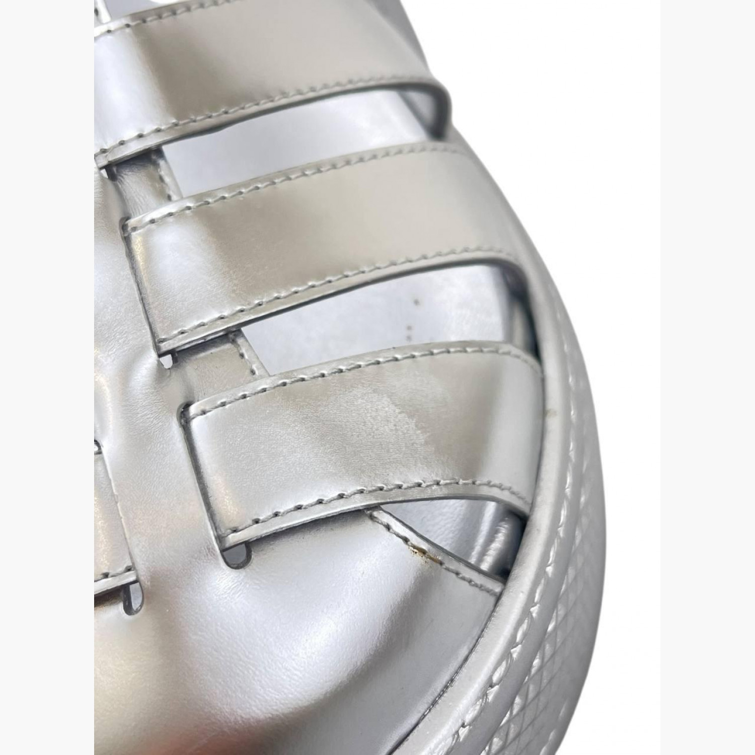 Сріблясті сандалії з лакованої шкіри на ремінці. У хорошому стані, є незначні сліди вжитку.