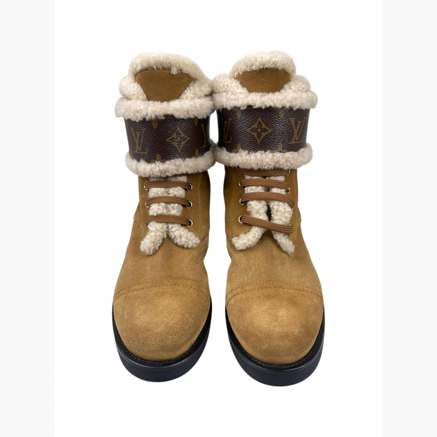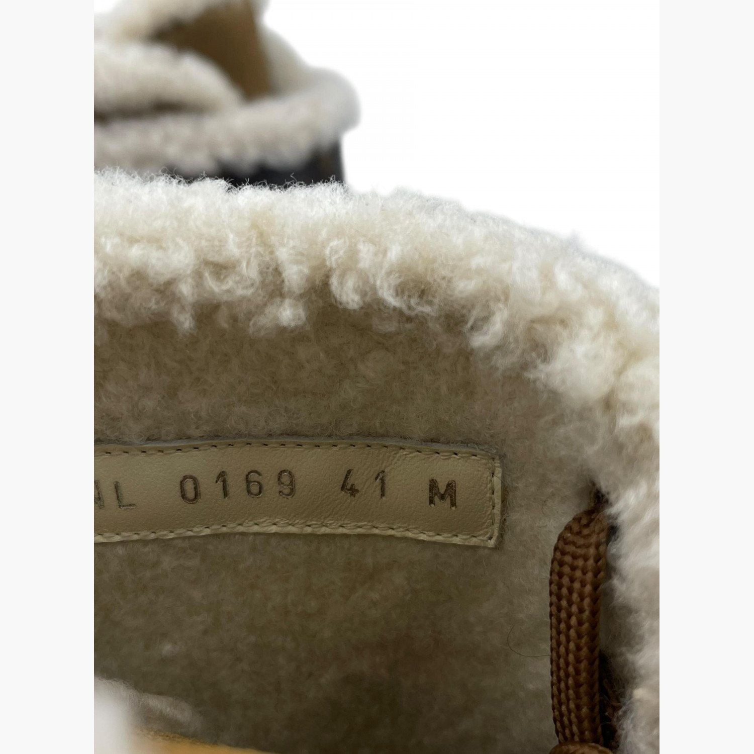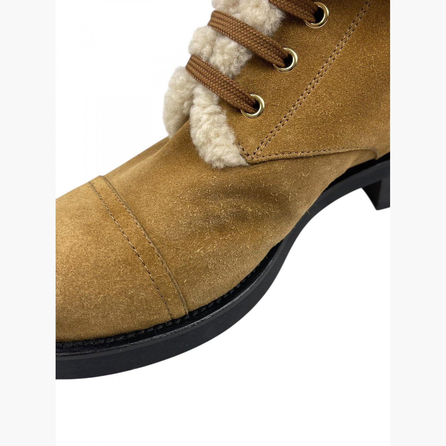 Коричневі замшеві черевики на білому хутрі зі знімним ремінцем з канви та хутра. У відмінному стані, є незначні сліди вжитку.