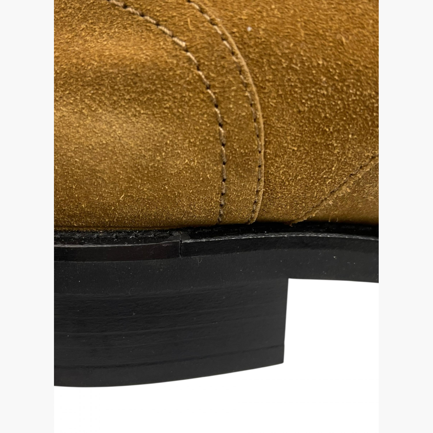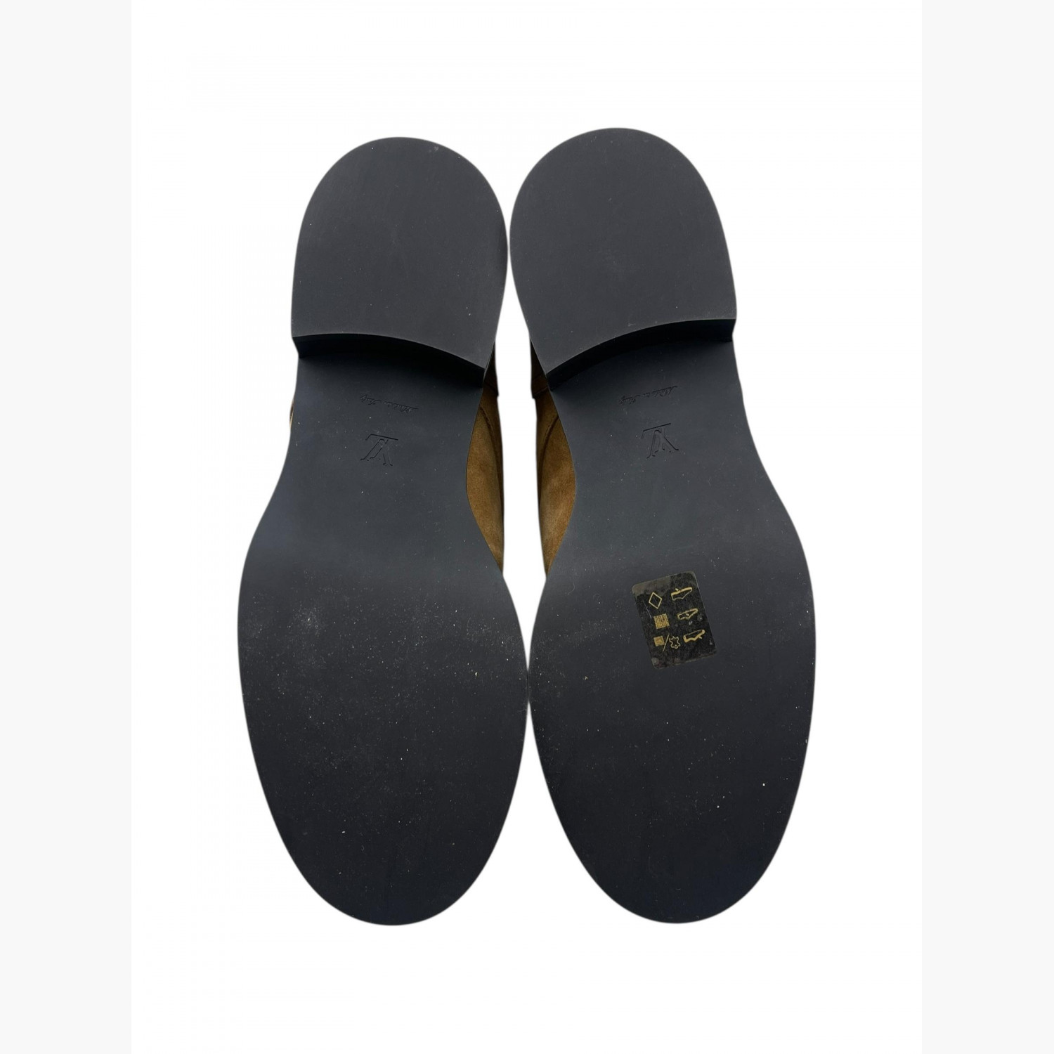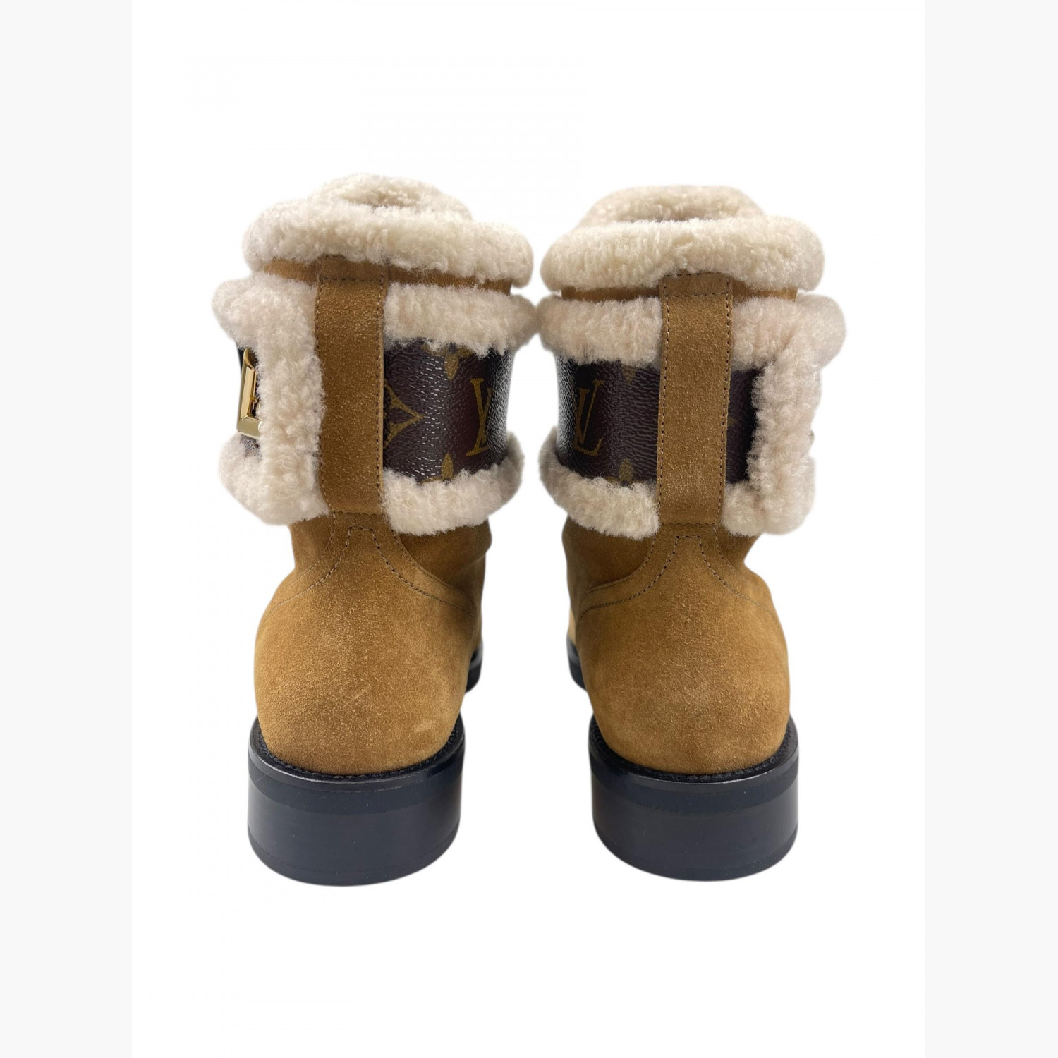 Коричневі замшеві черевики на білому хутрі зі знімним ремінцем з канви та хутра. У відмінному стані, є незначні сліди вжитку.