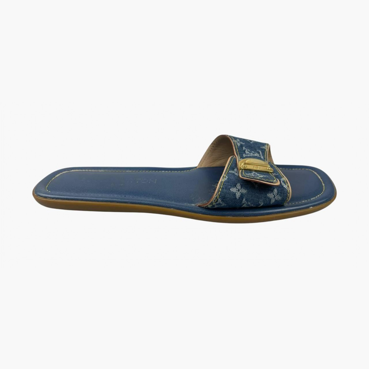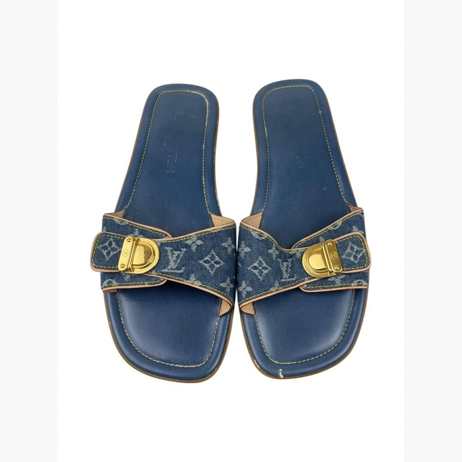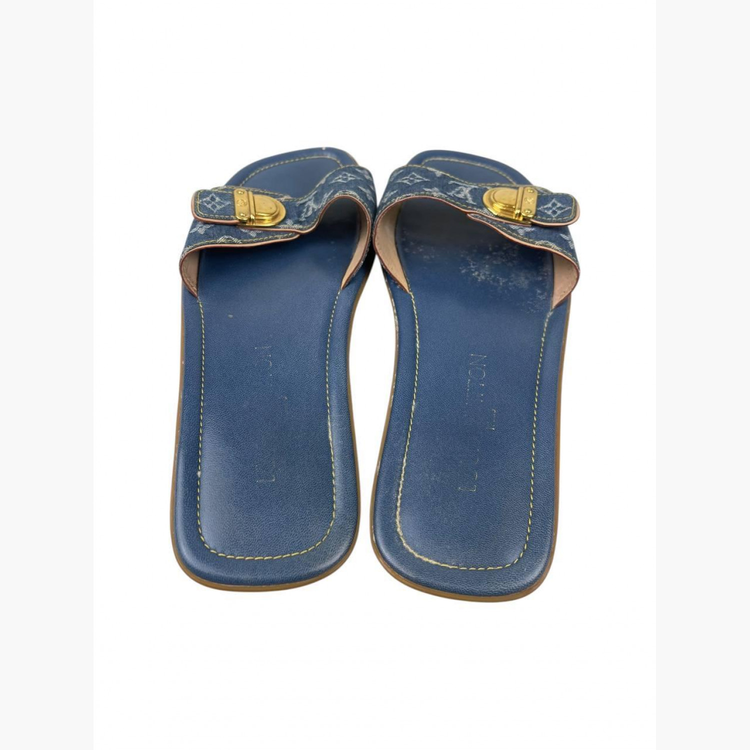 Сині джинсові шльопанці з монограмою, золотою фурнітурою та шкіряною синьою устілкою. У хорошому стані, є сліди вжитку.