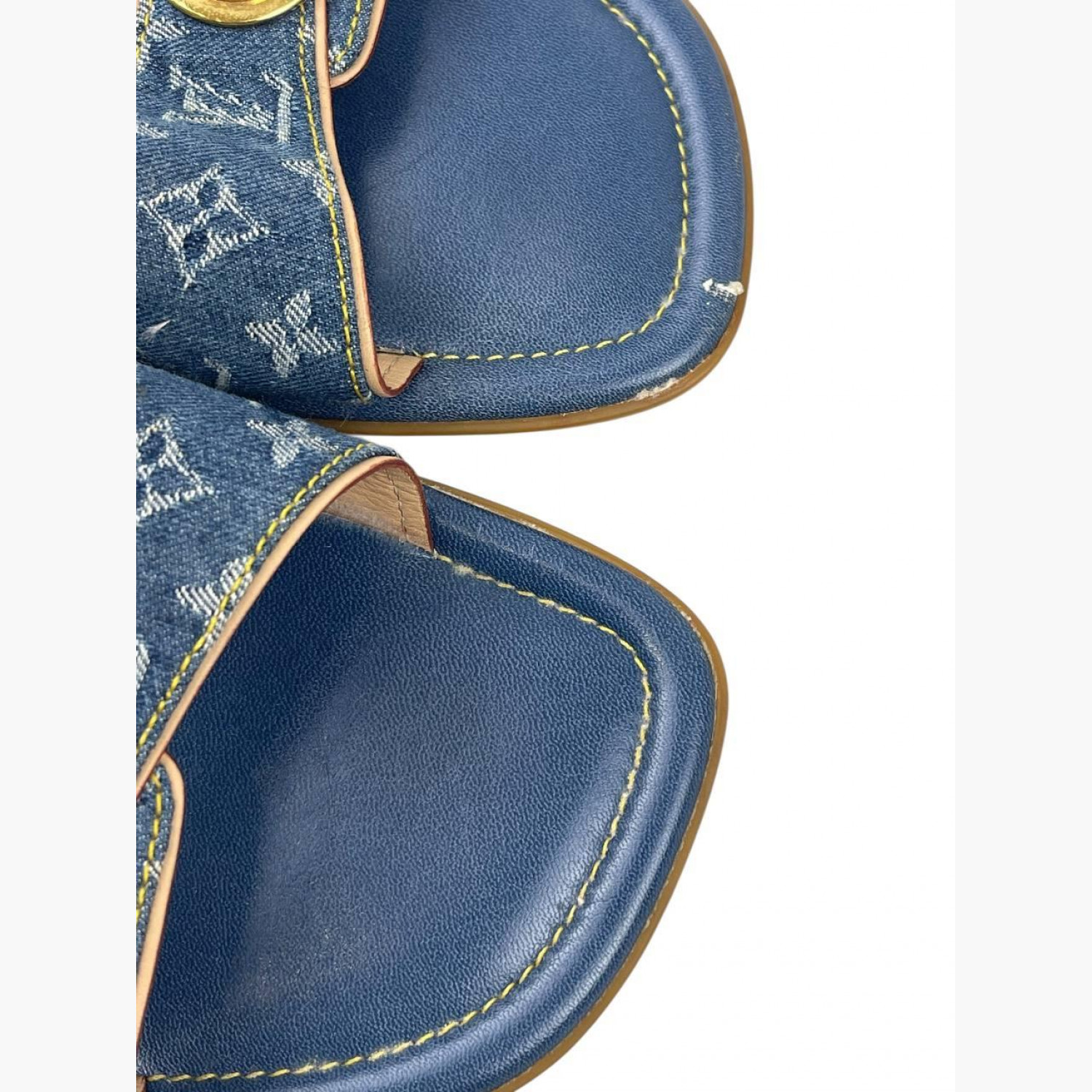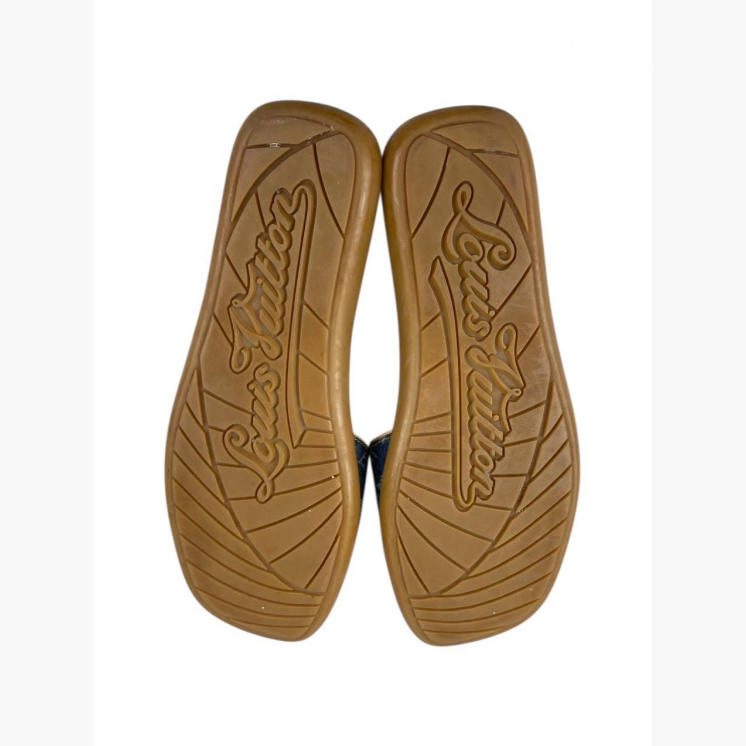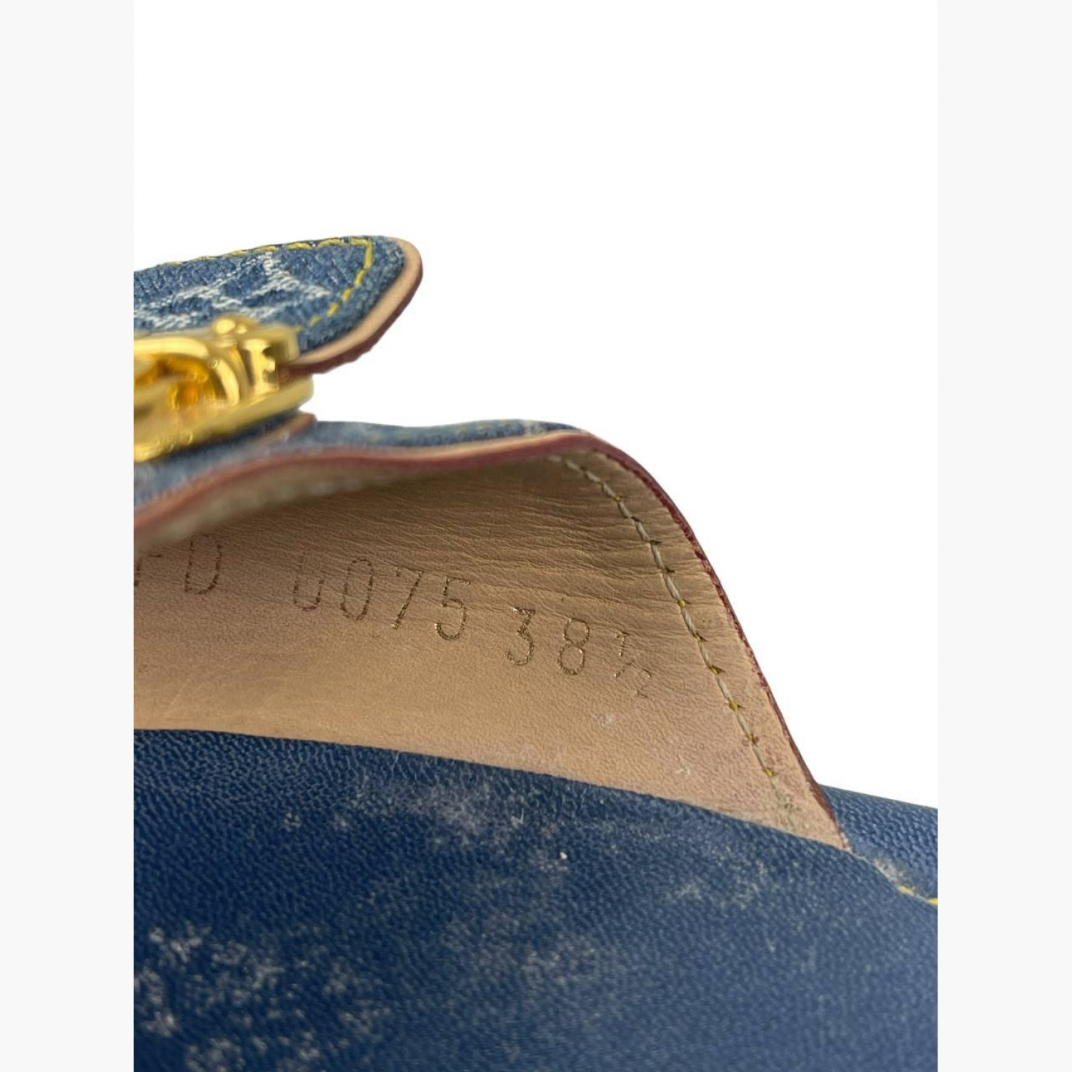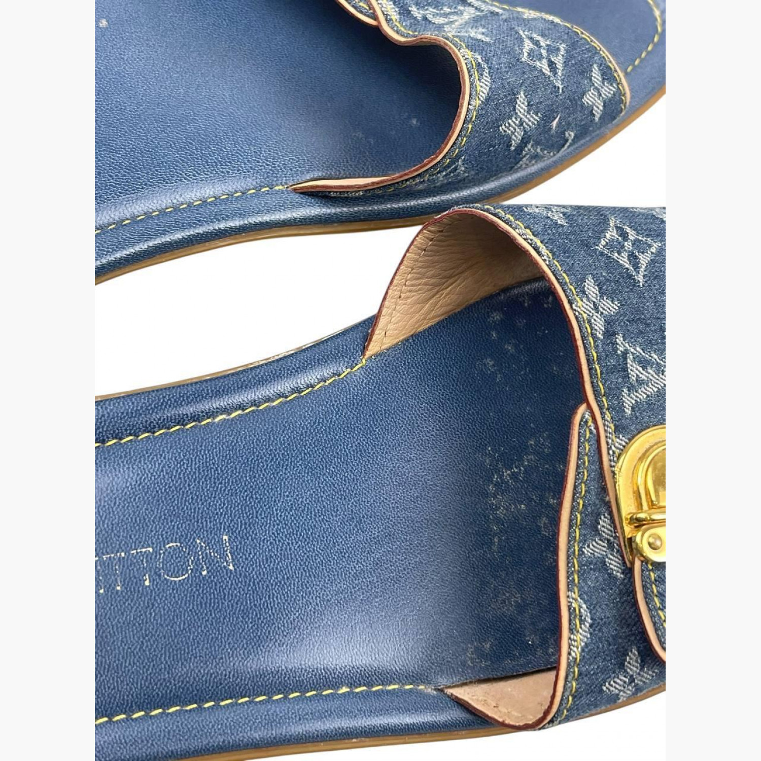Сині джинсові шльопанці з монограмою, золотою фурнітурою та шкіряною синьою устілкою. У хорошому стані, є сліди вжитку.