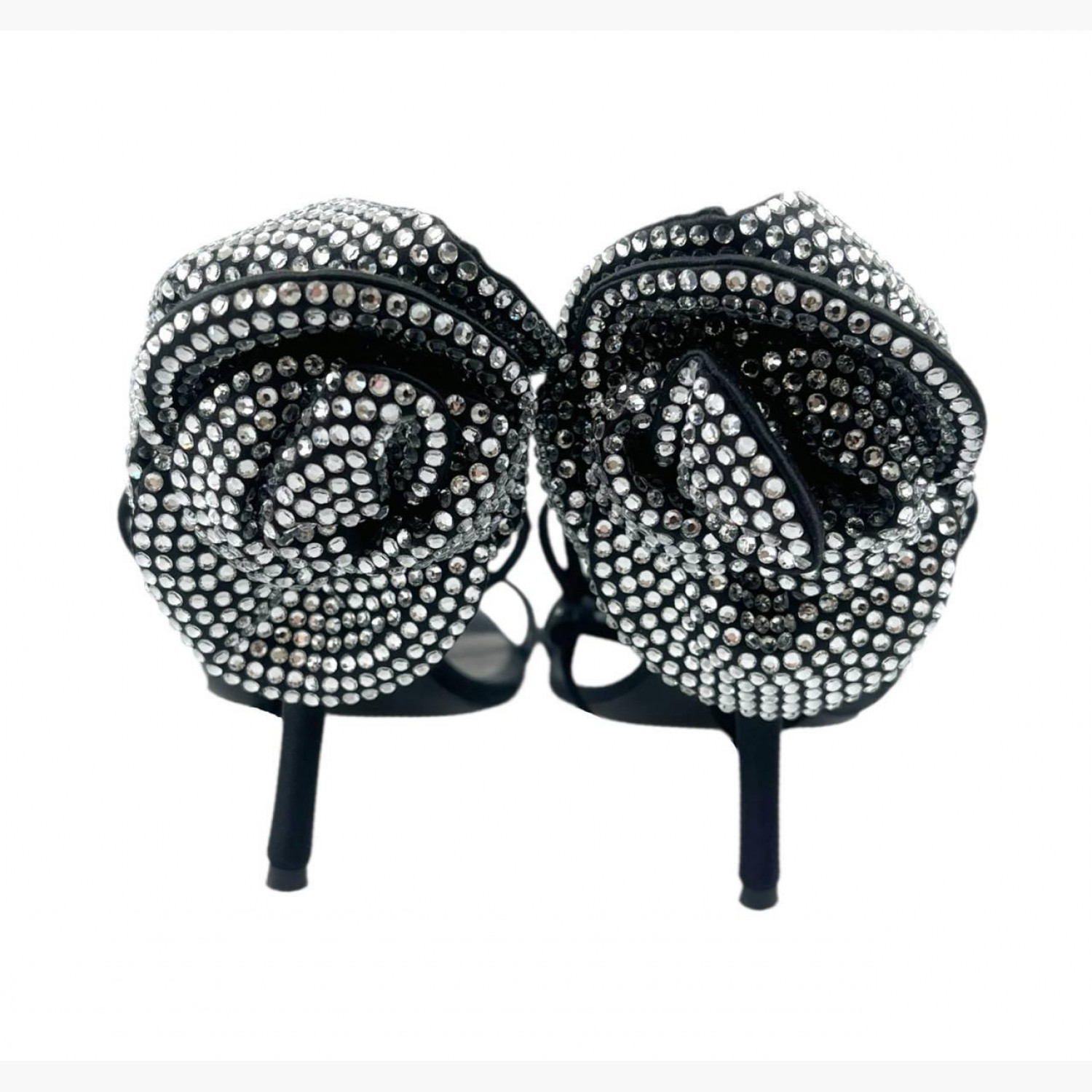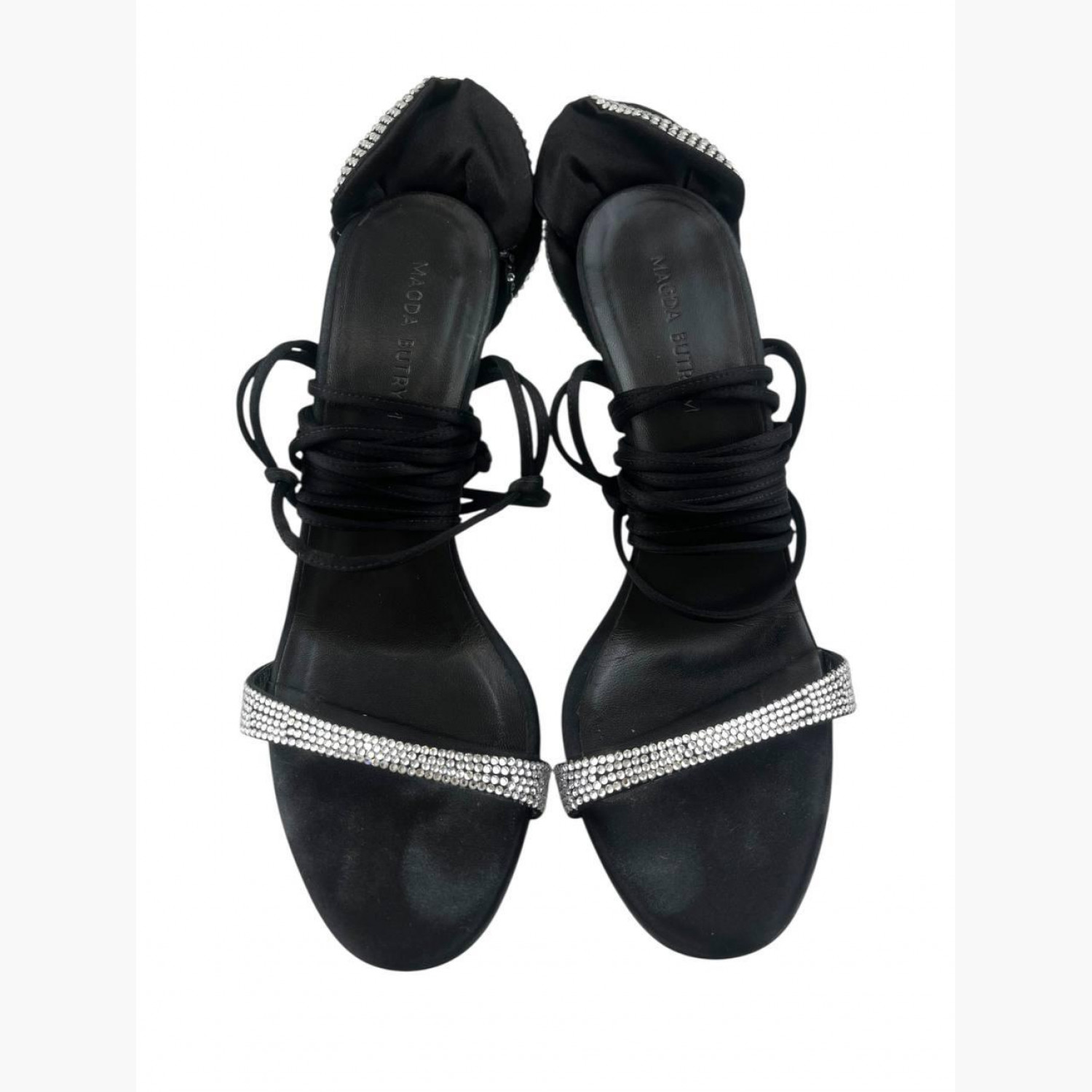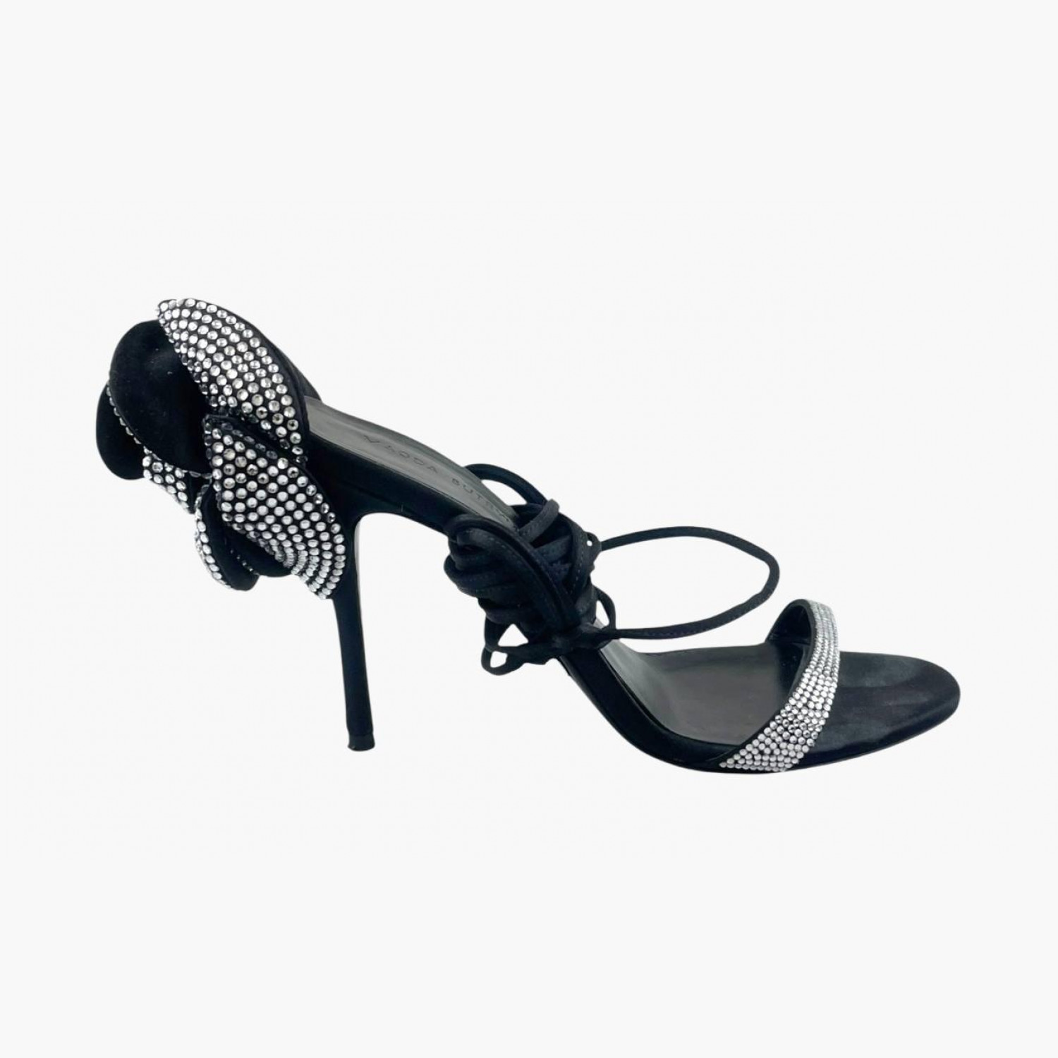 Чорні сатинові босоніжки з довгими зав’язками та квіткою зі стразів на п’ятках. У дуже гарному стані, є сліди вжитку.