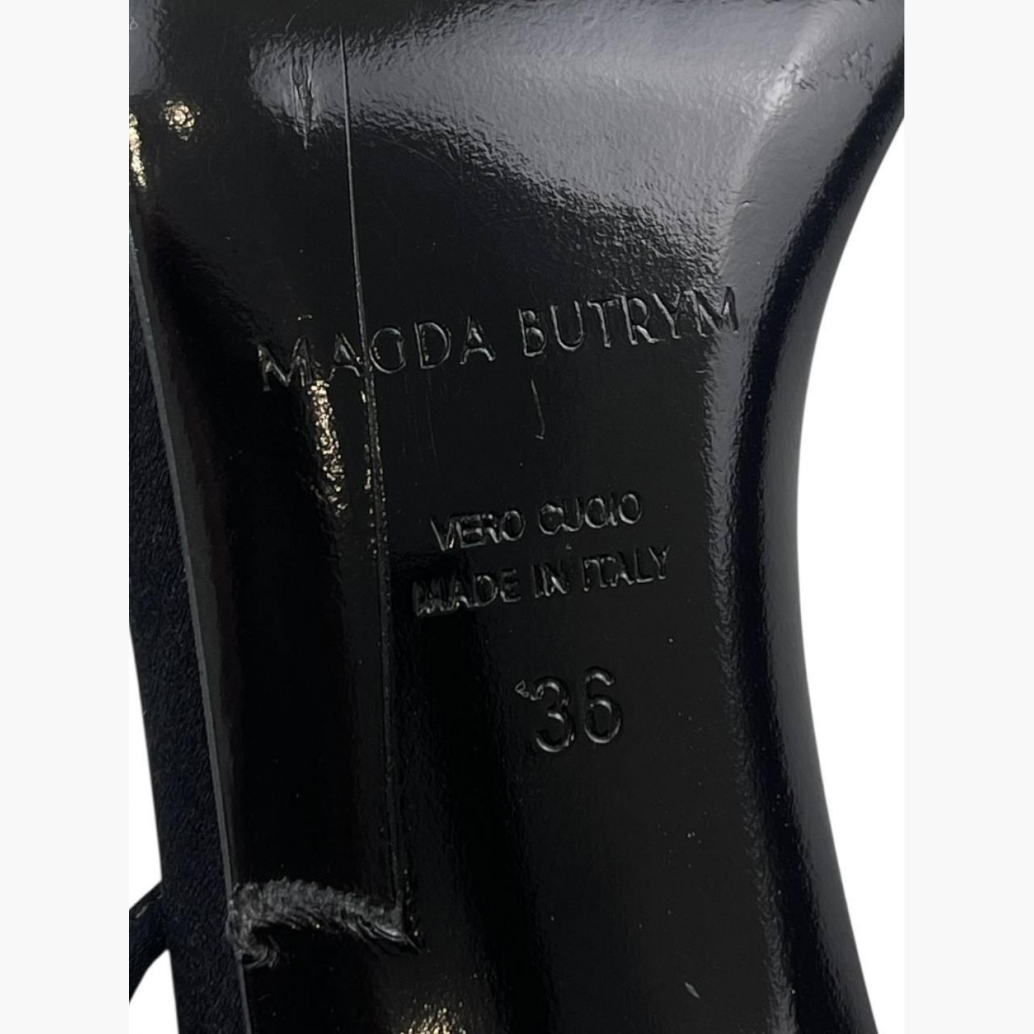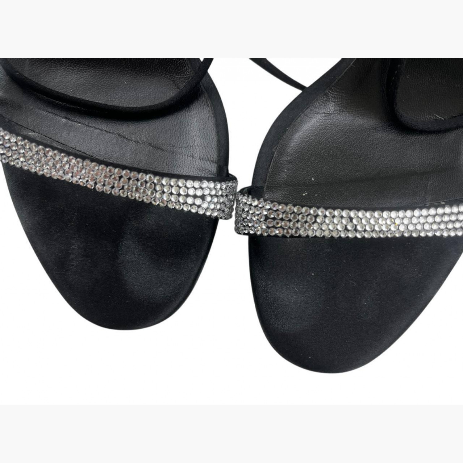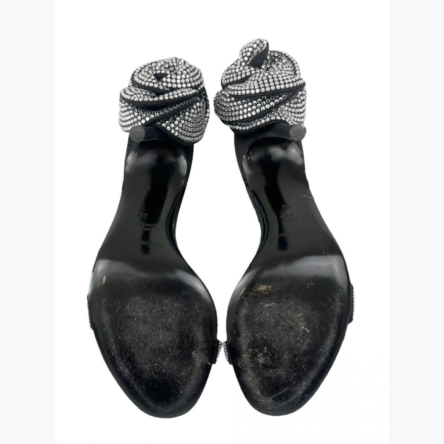 Чорні сатинові босоніжки з довгими зав’язками та квіткою зі стразів на п’ятках. У дуже гарному стані, є сліди вжитку.