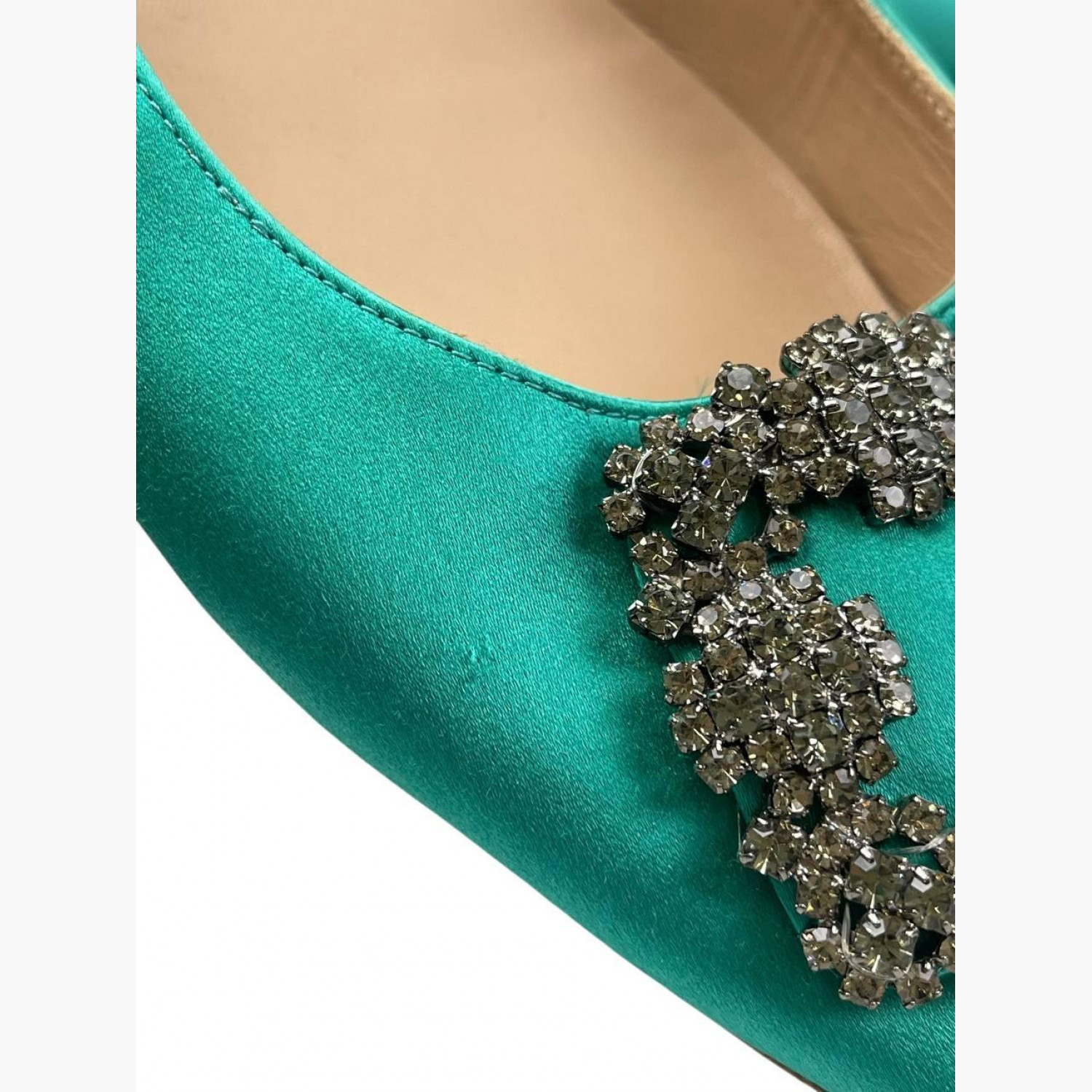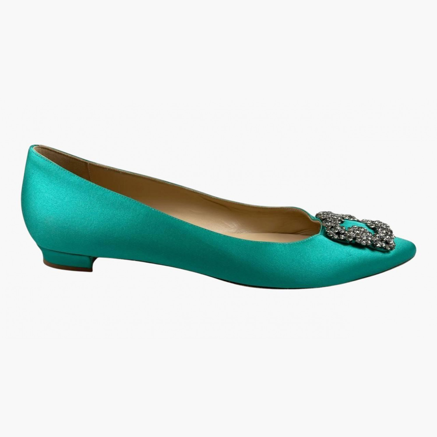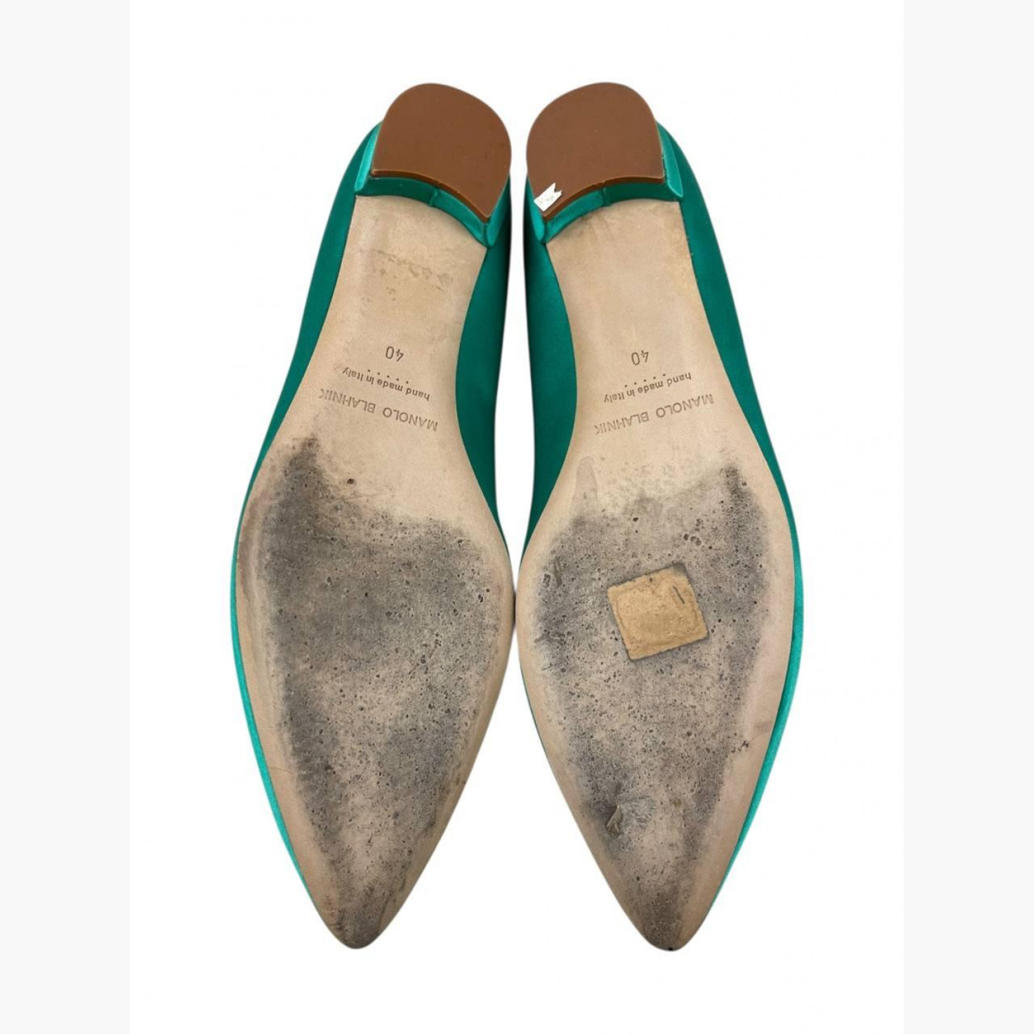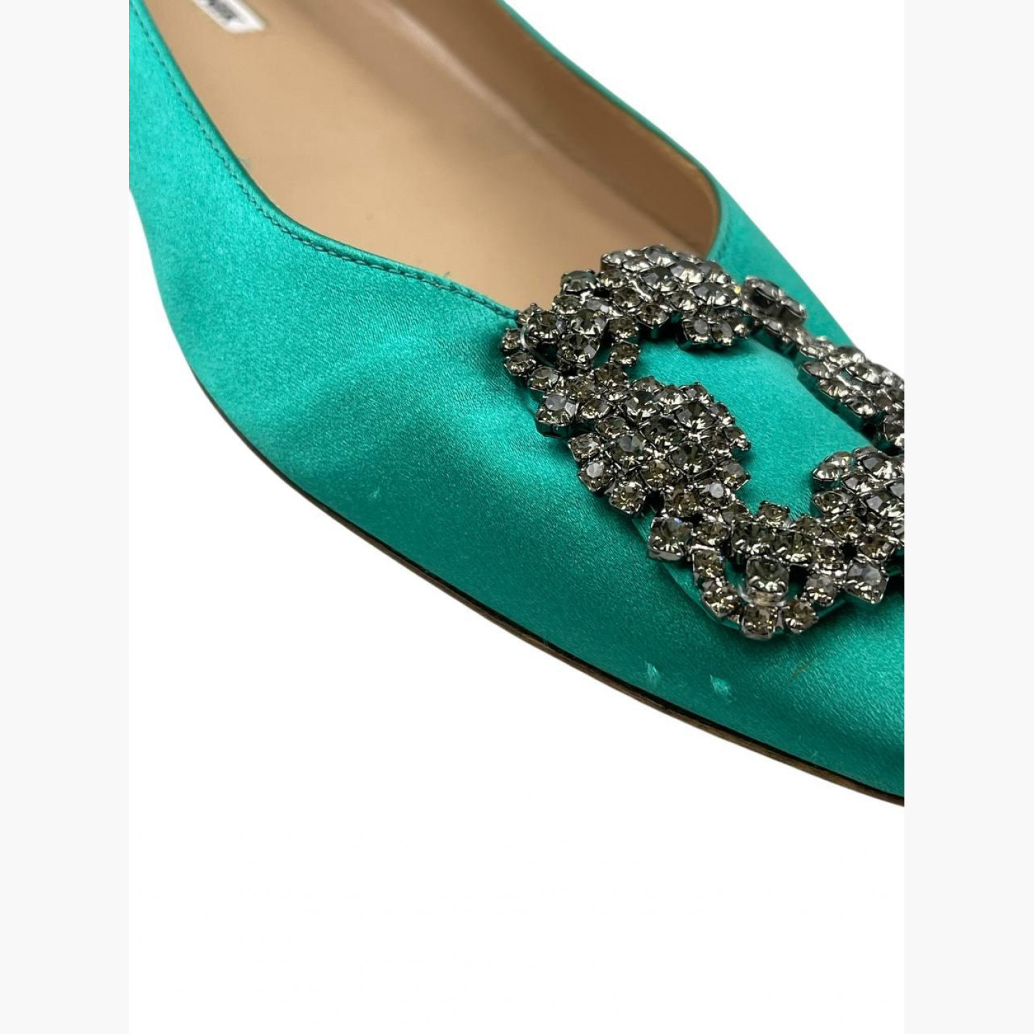 Сатинові зелені балетки з сріблястим декором на носку. У хорошому стані, є зачіпки та ледь помітна плямка.