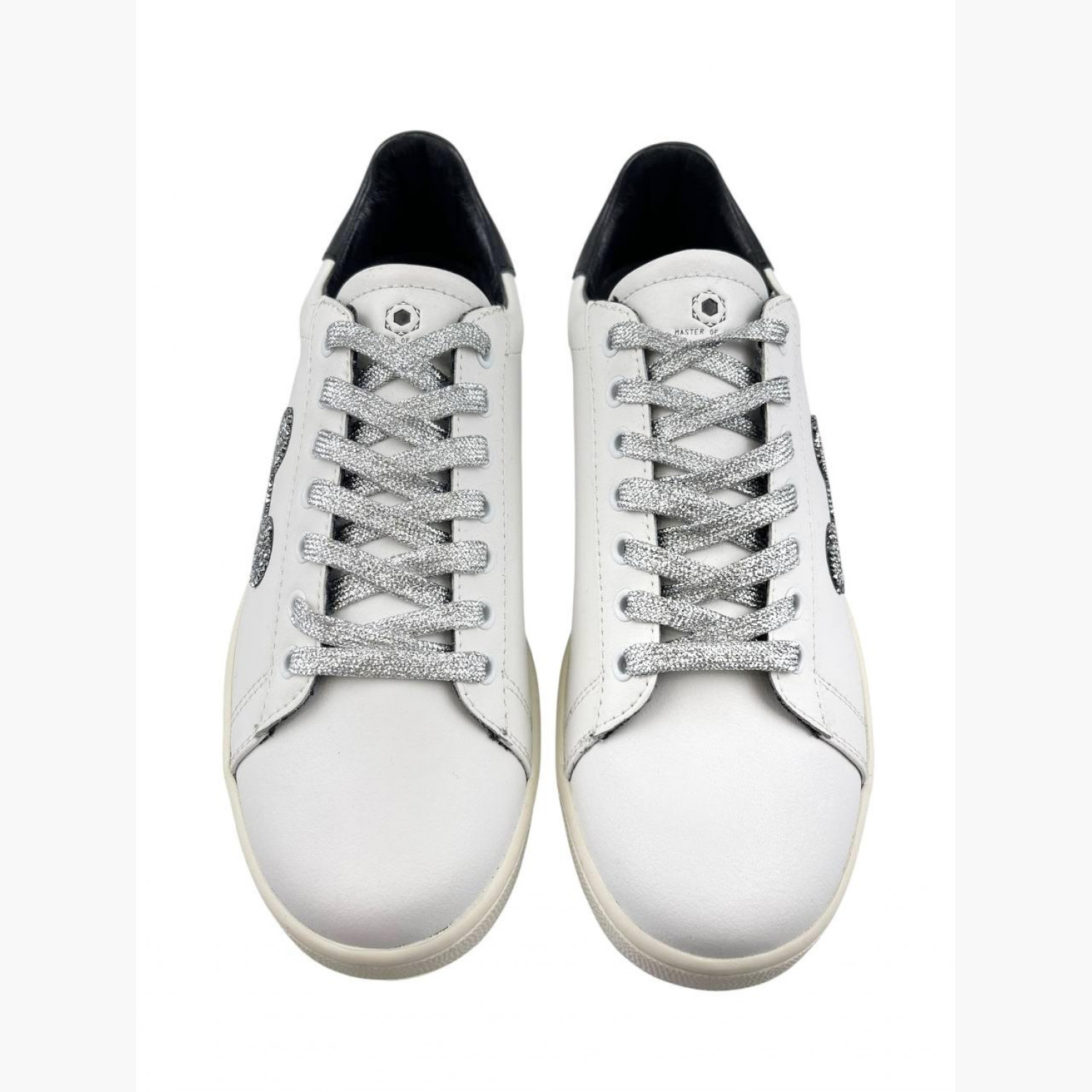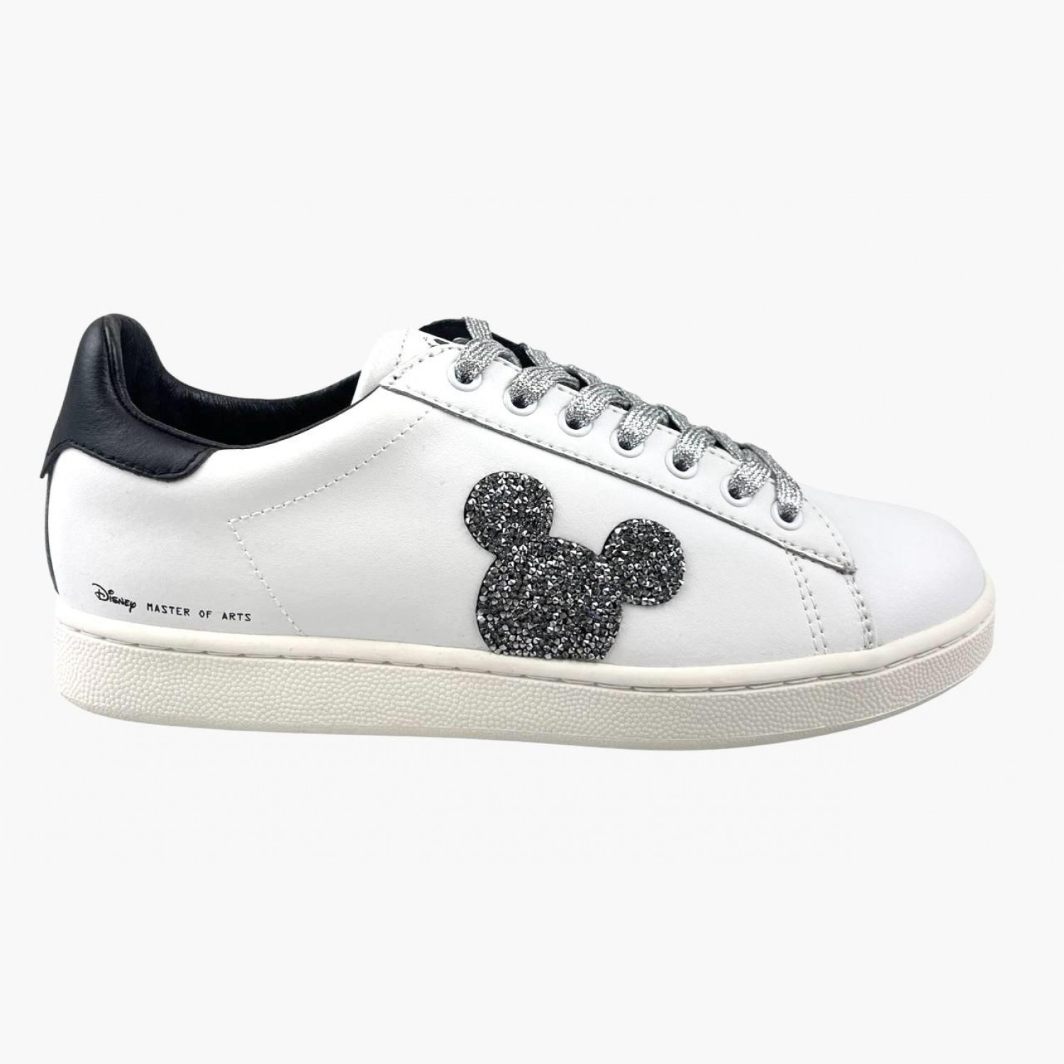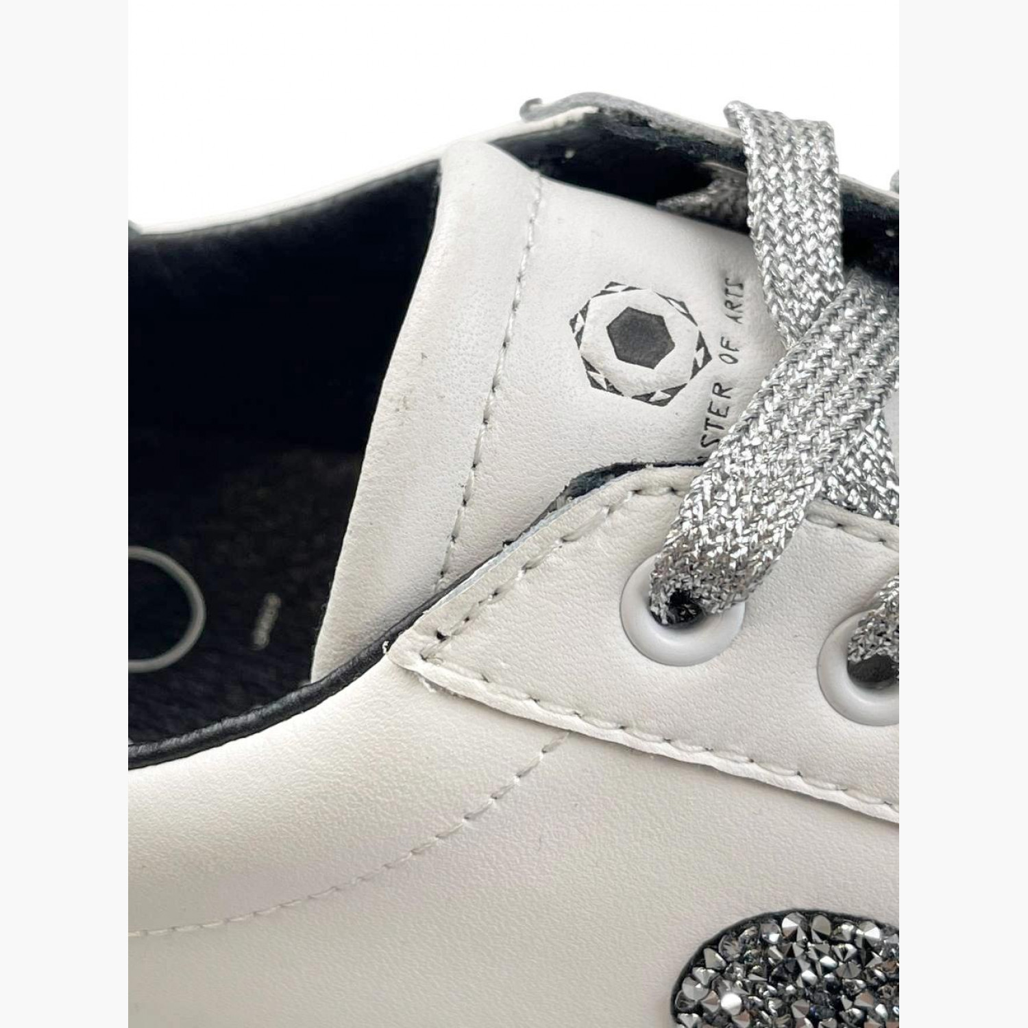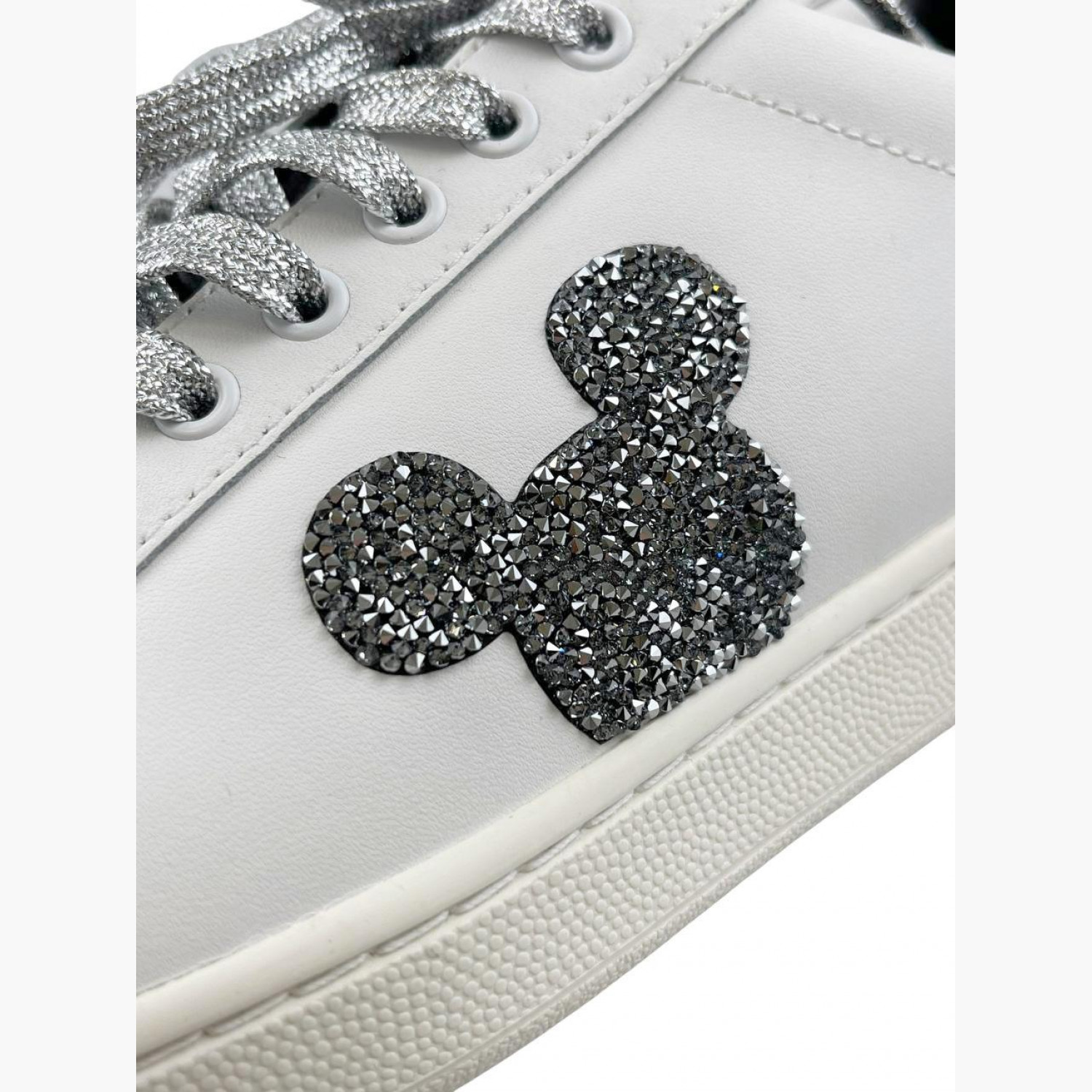 Шкіряні білі кеди з срібними шнурками та логотипом Міккі Мауса, виконаним із чорних блискучих каменів. У відмінному стані, є незначні сліди вжитку.