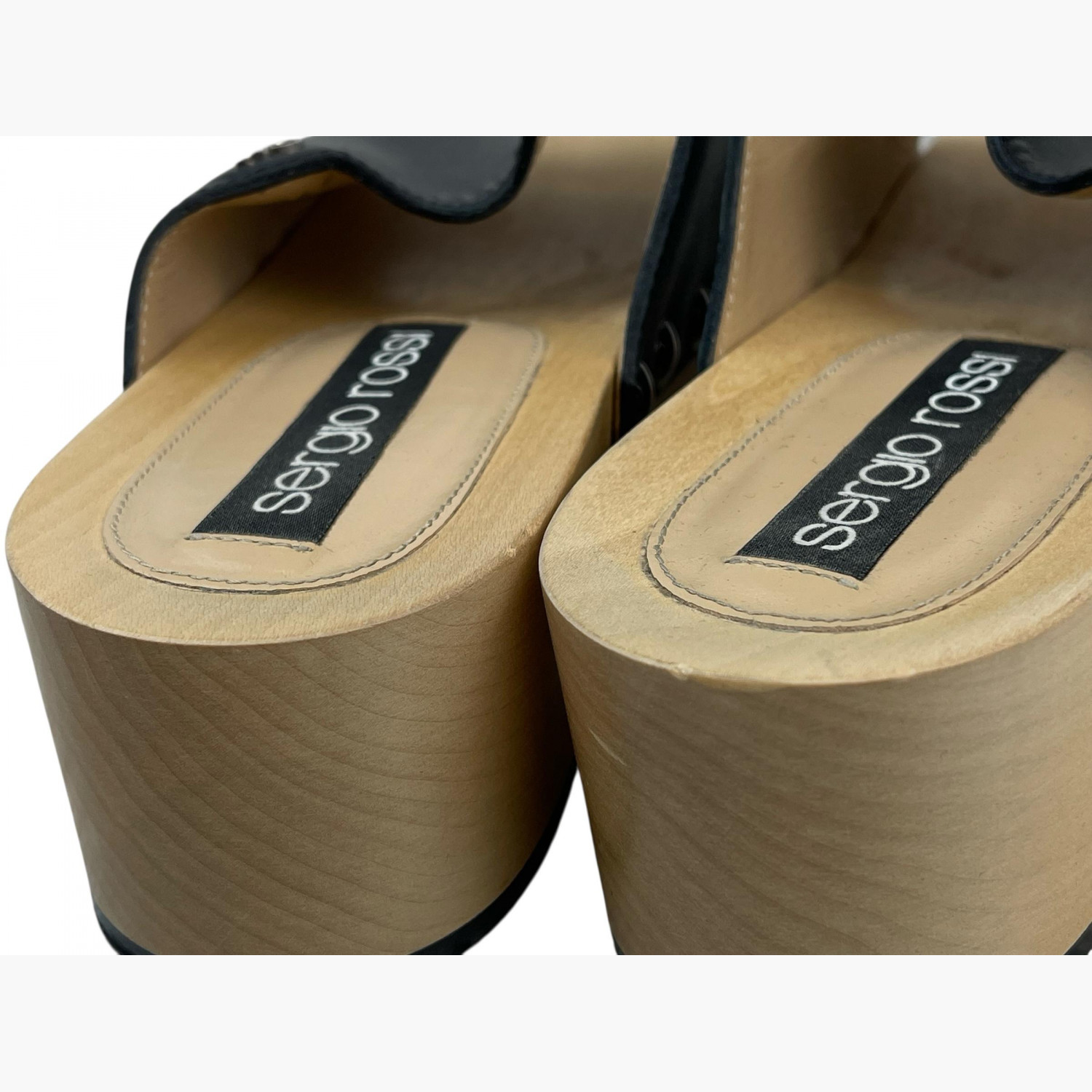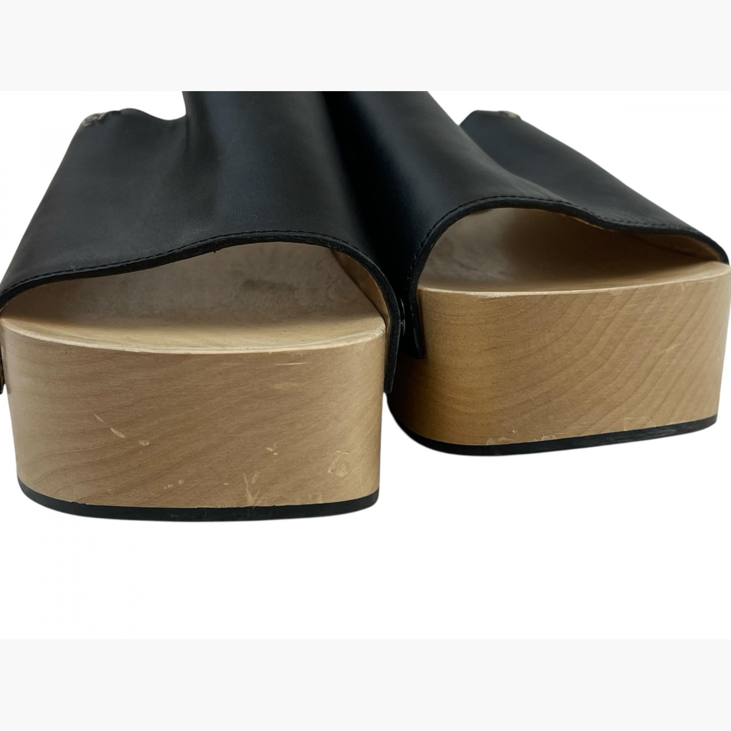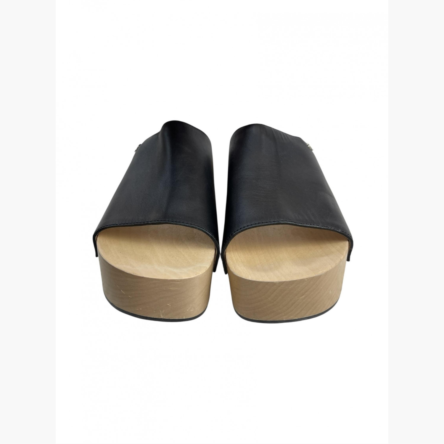 Чорні шкіряні клоги з металевою декоративною фурнітурою срібного кольору на світлій дерев’яній платформі.У відмінному стані, є незначні потертості на платформі.