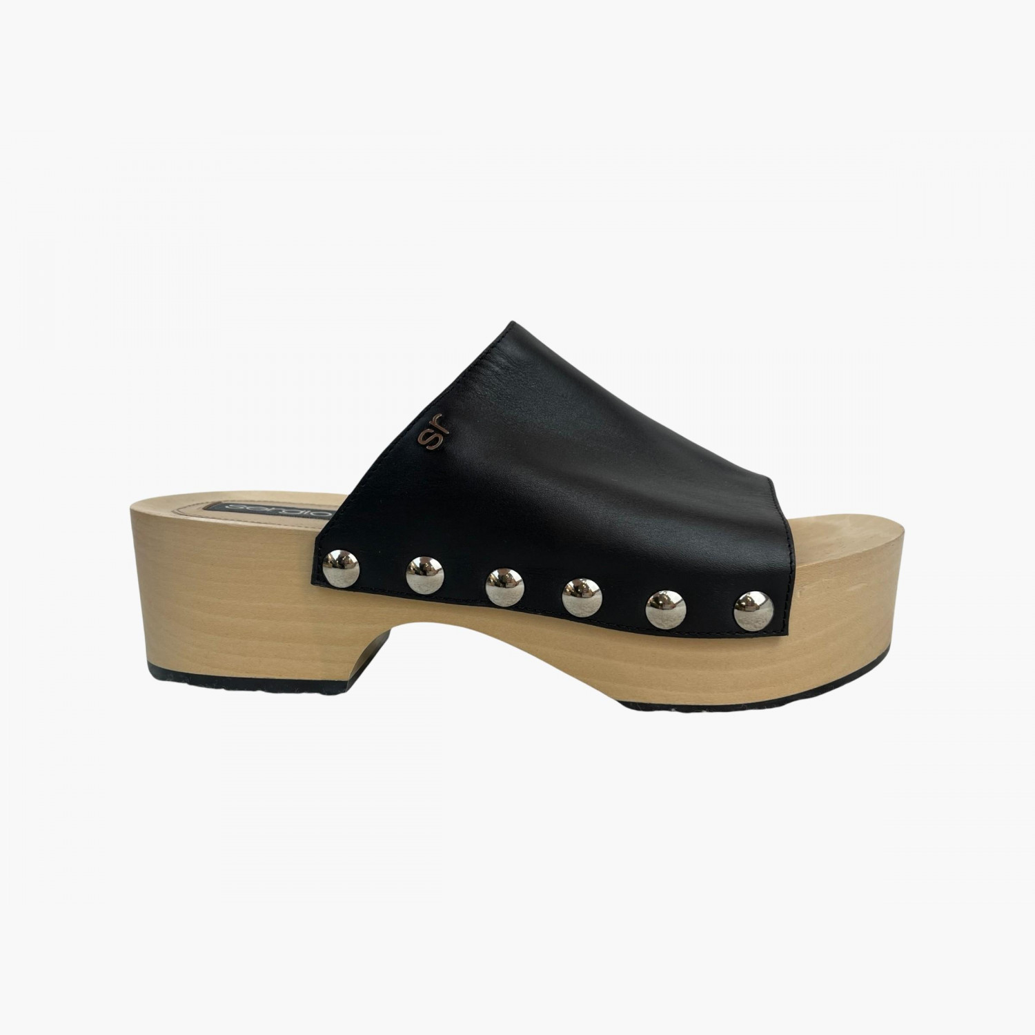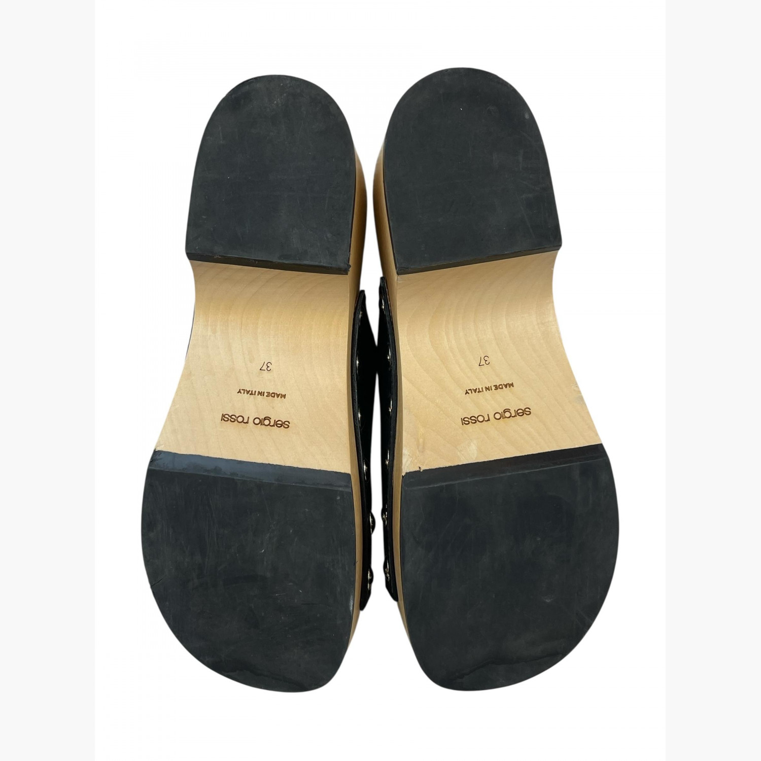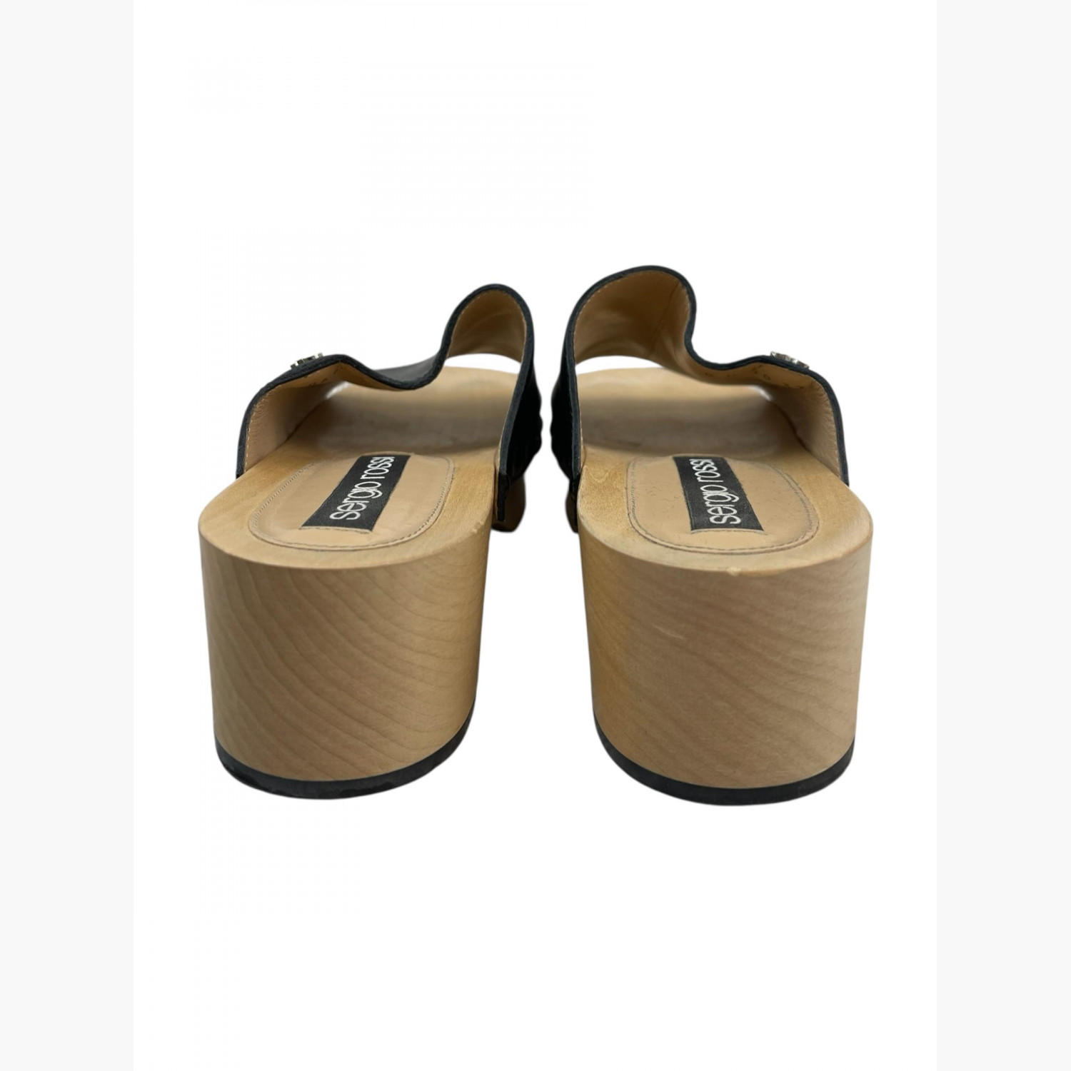 Чорні шкіряні клоги з металевою декоративною фурнітурою срібного кольору на світлій дерев’яній платформі.У відмінному стані, є незначні потертості на платформі.