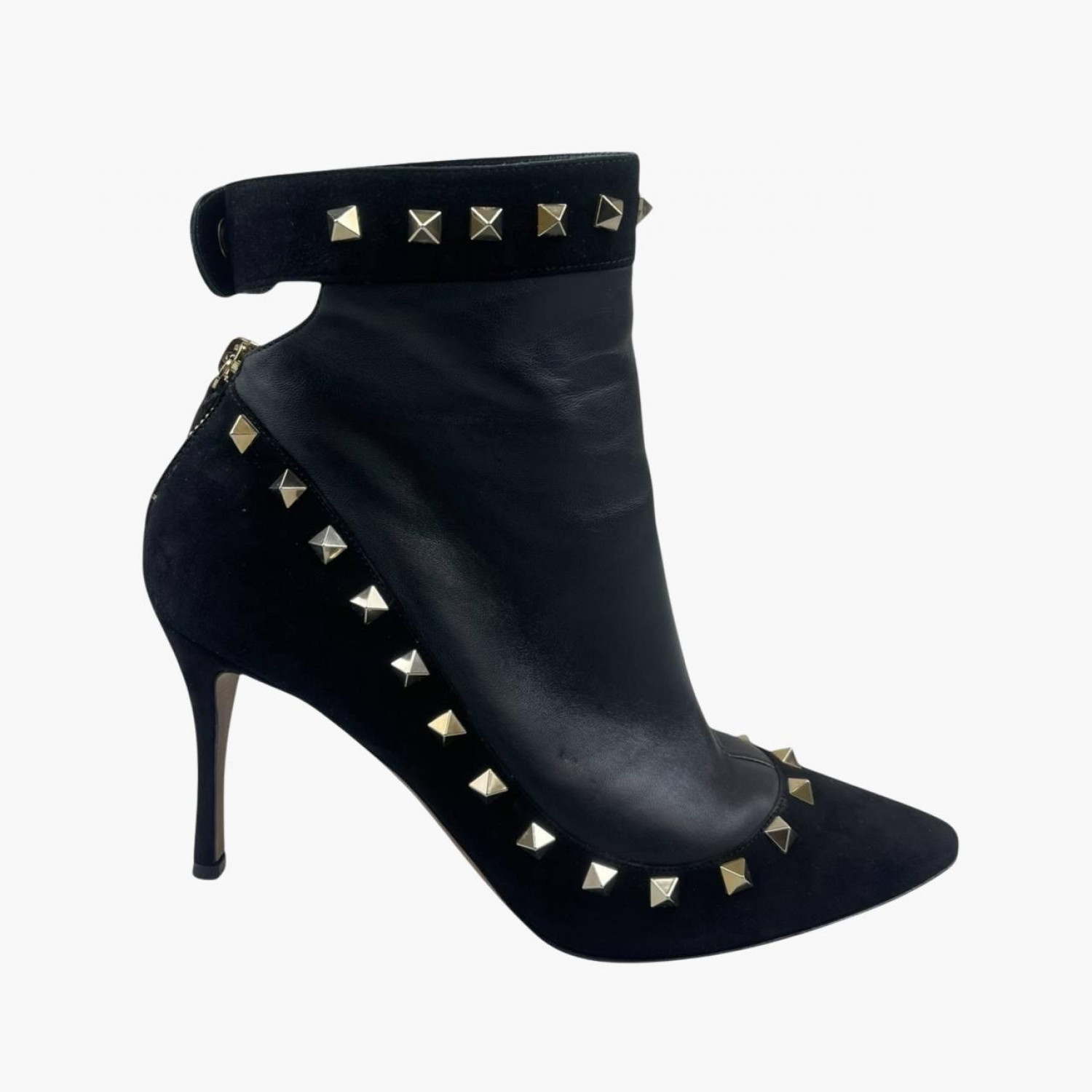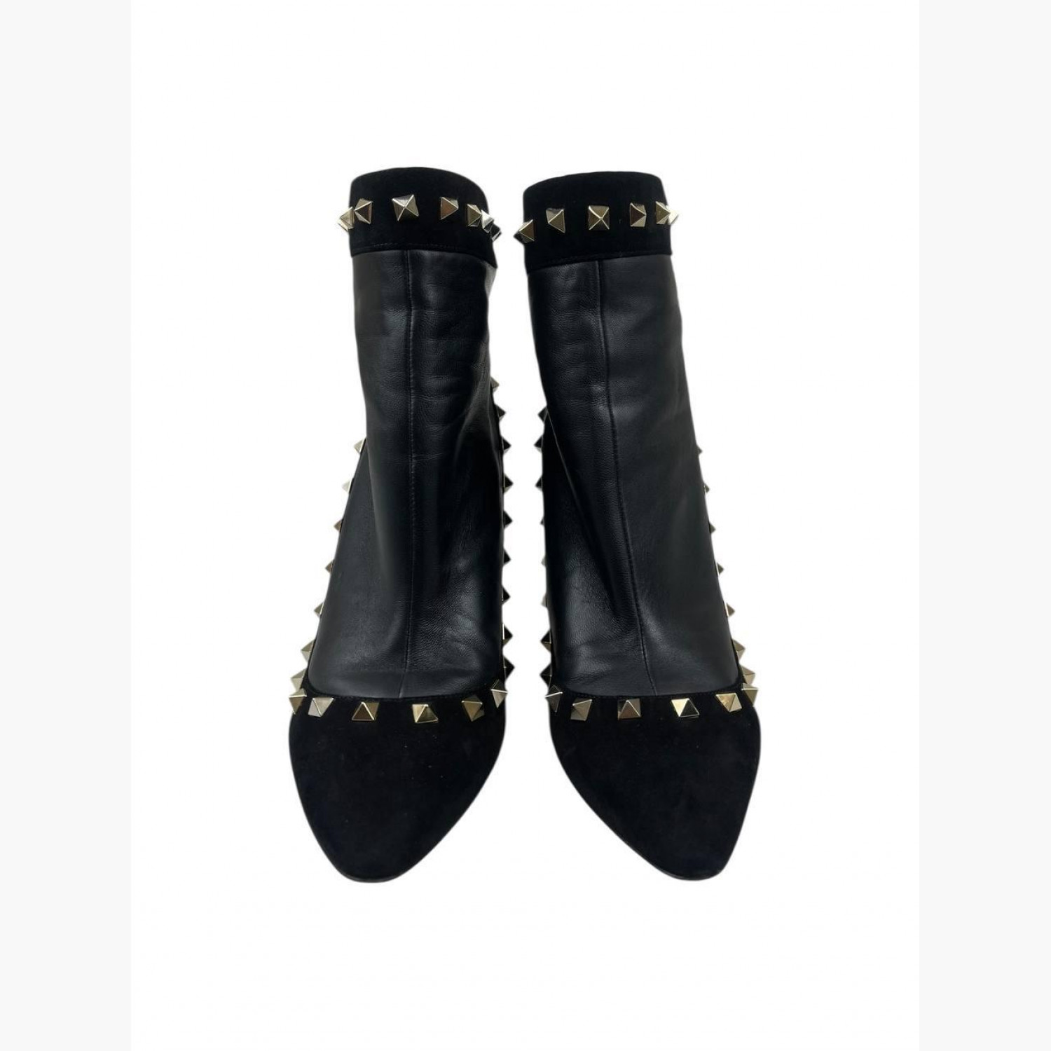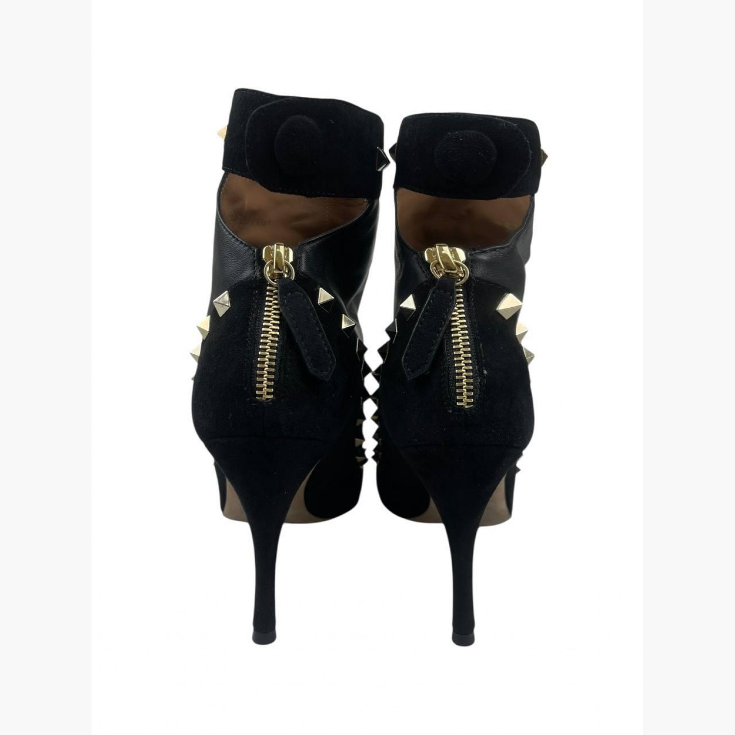 Чорні шкіряні ботильйони з замшевими вставками, золотими металевими шипами та блискавкою на п’ятці. У відмінному стані, є незначні сліди вжитку.