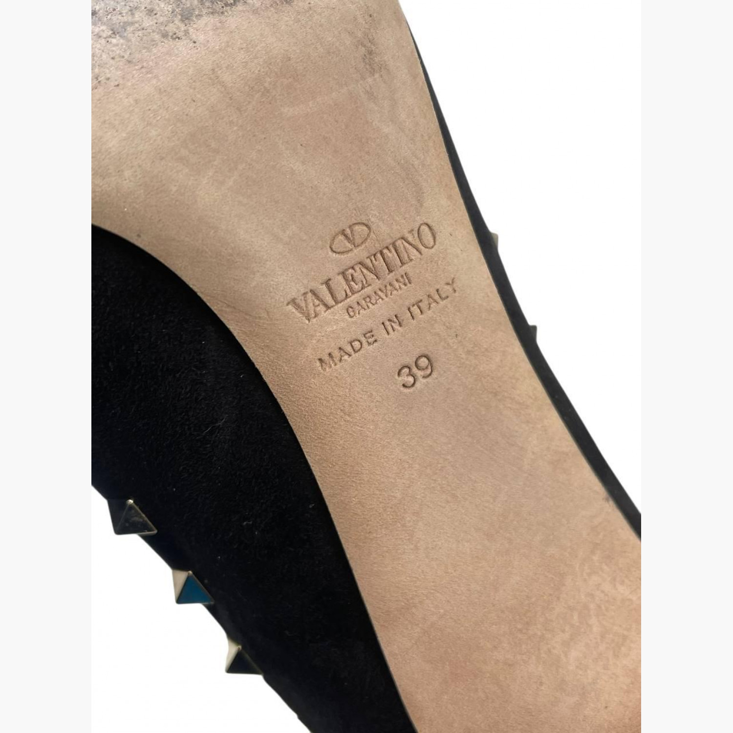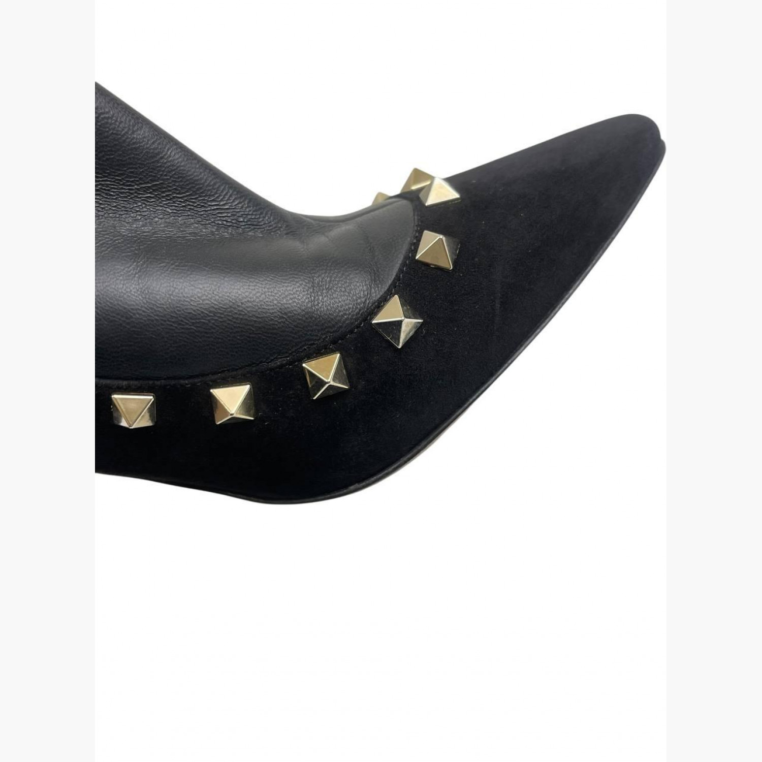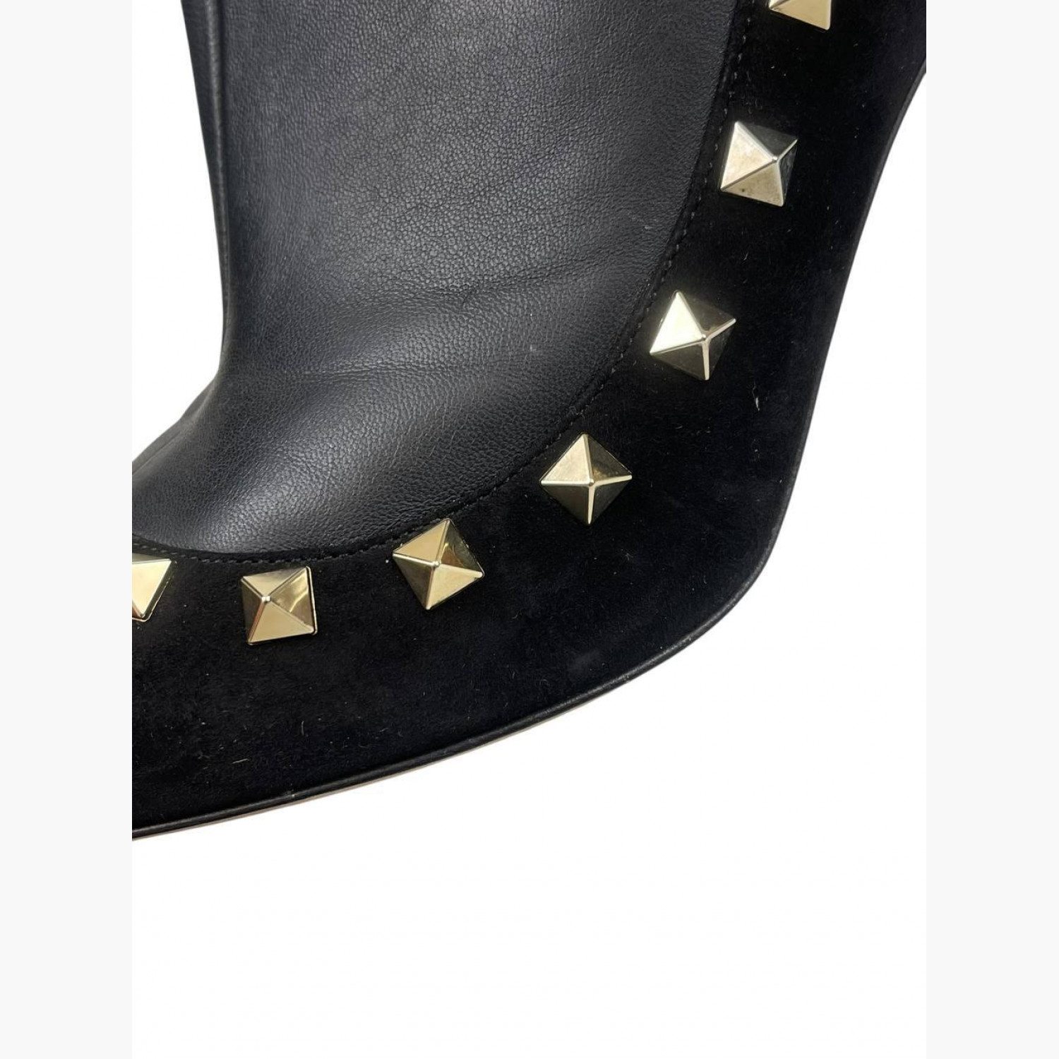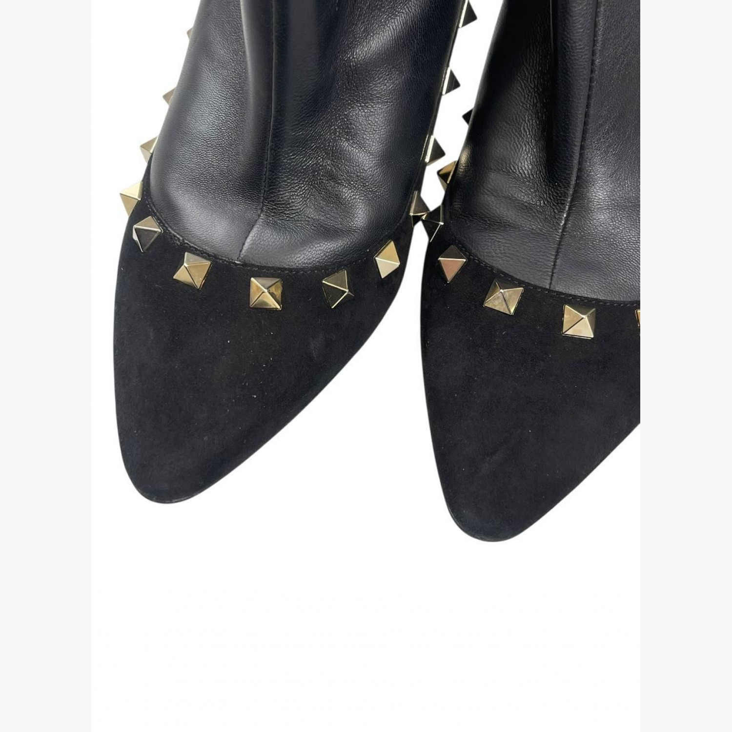 Чорні шкіряні ботильйони з замшевими вставками, золотими металевими шипами та блискавкою на п’ятці. У відмінному стані, є незначні сліди вжитку.