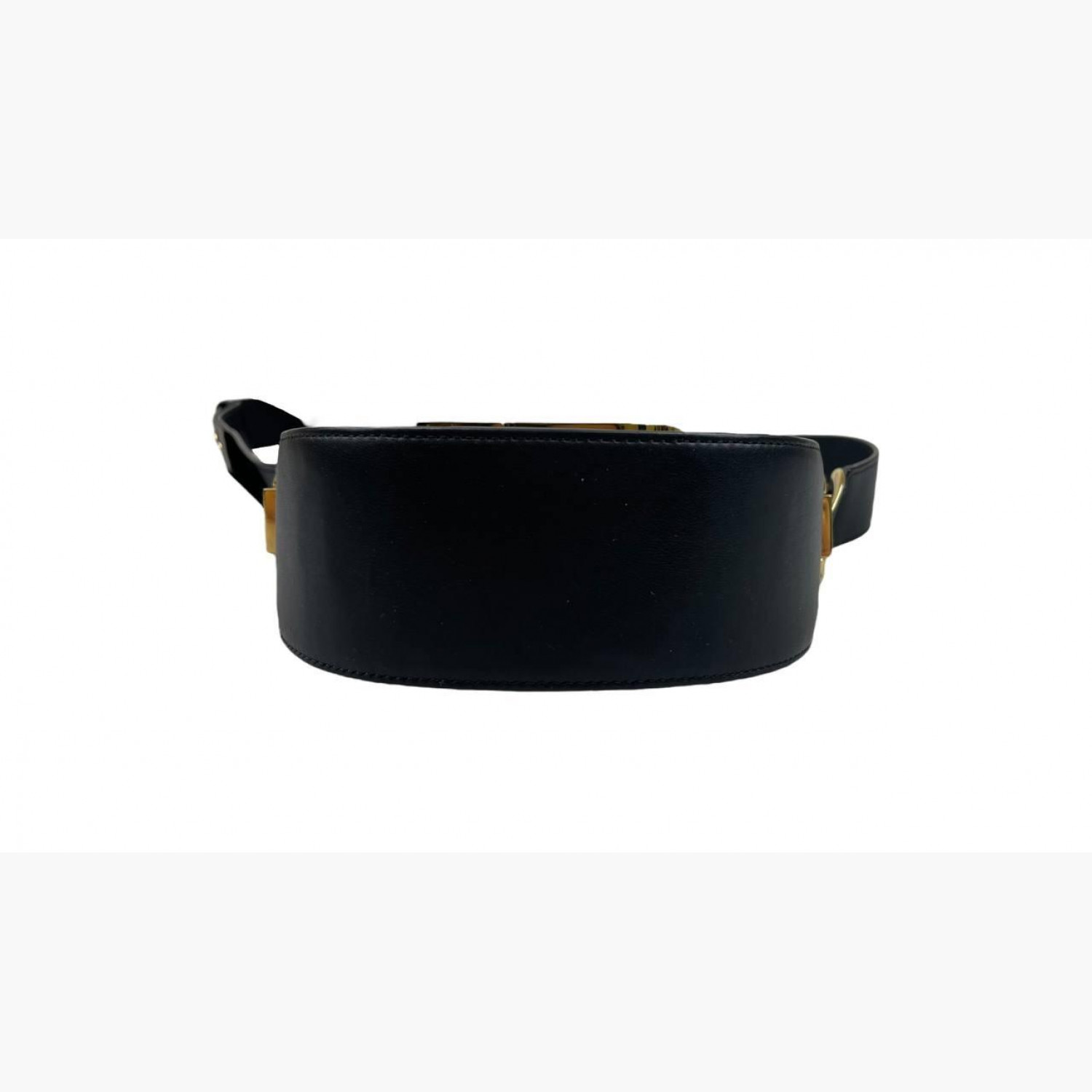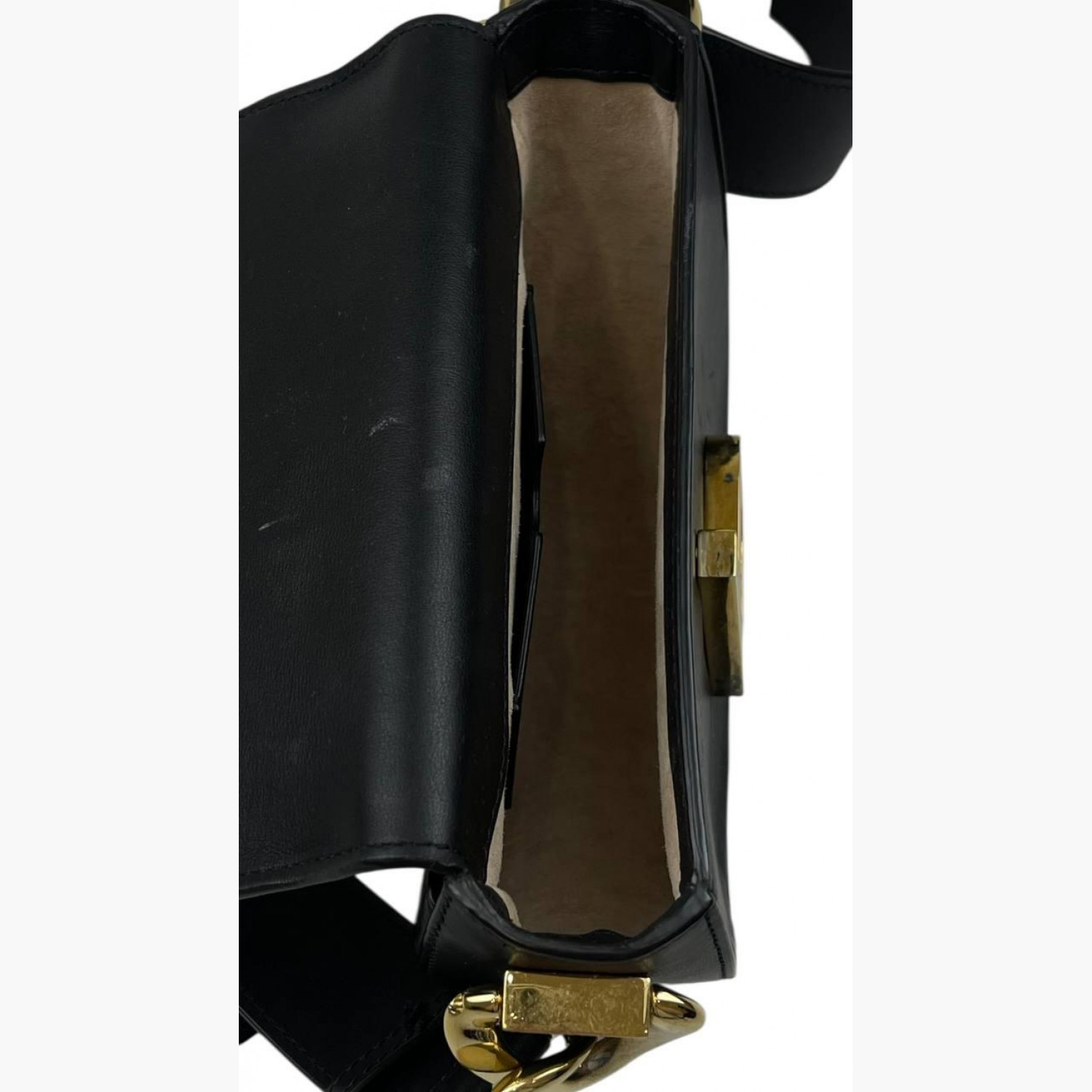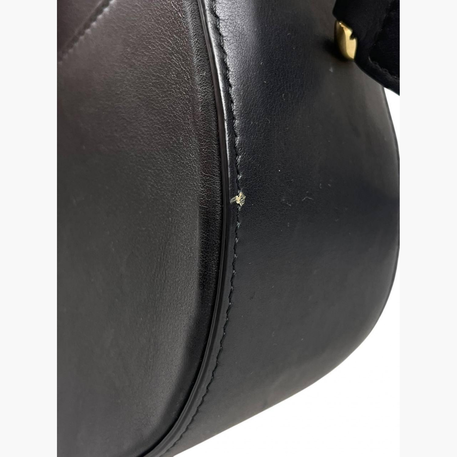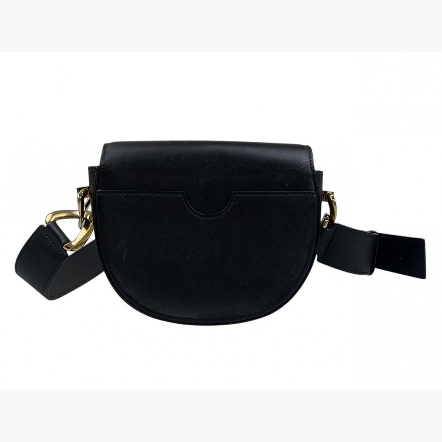Чорна шкіряна сумка круглої форми з регульованим ремінцем. Усередині одне основне відділення з відкритою кишенею, а також відкрита кишеня на задній стороні сумки. У хорошому стані, є сліди вжитку.