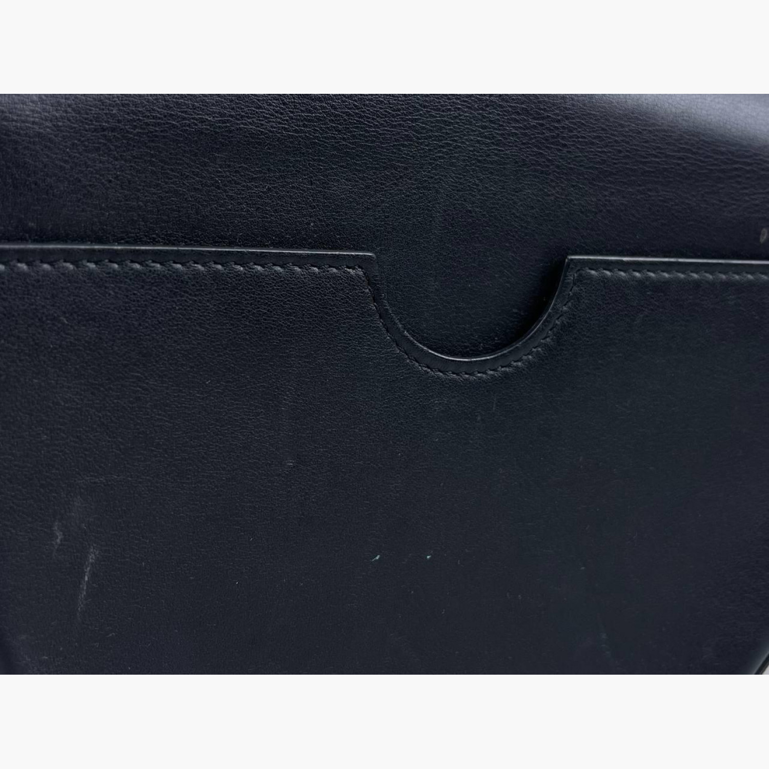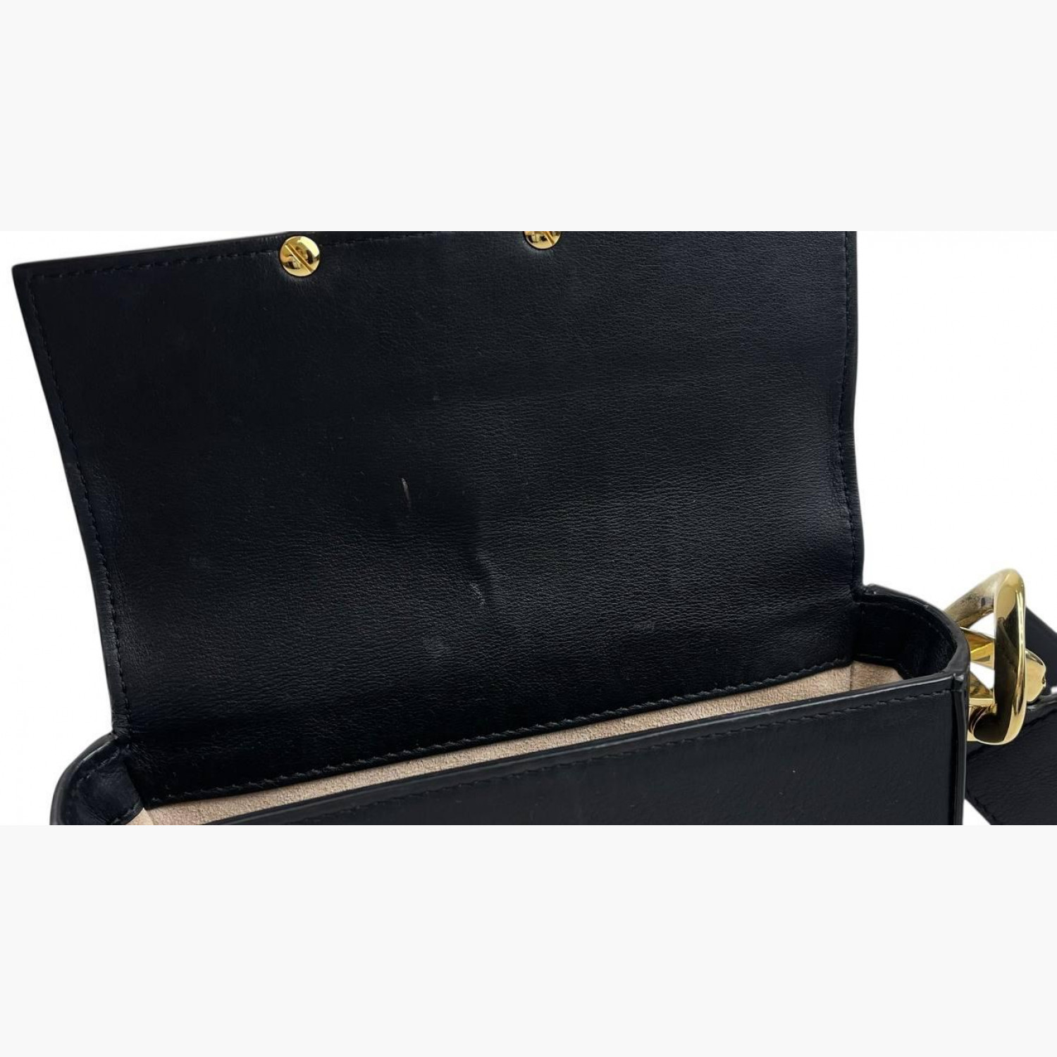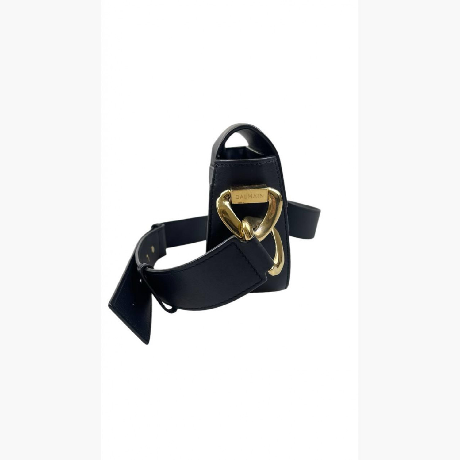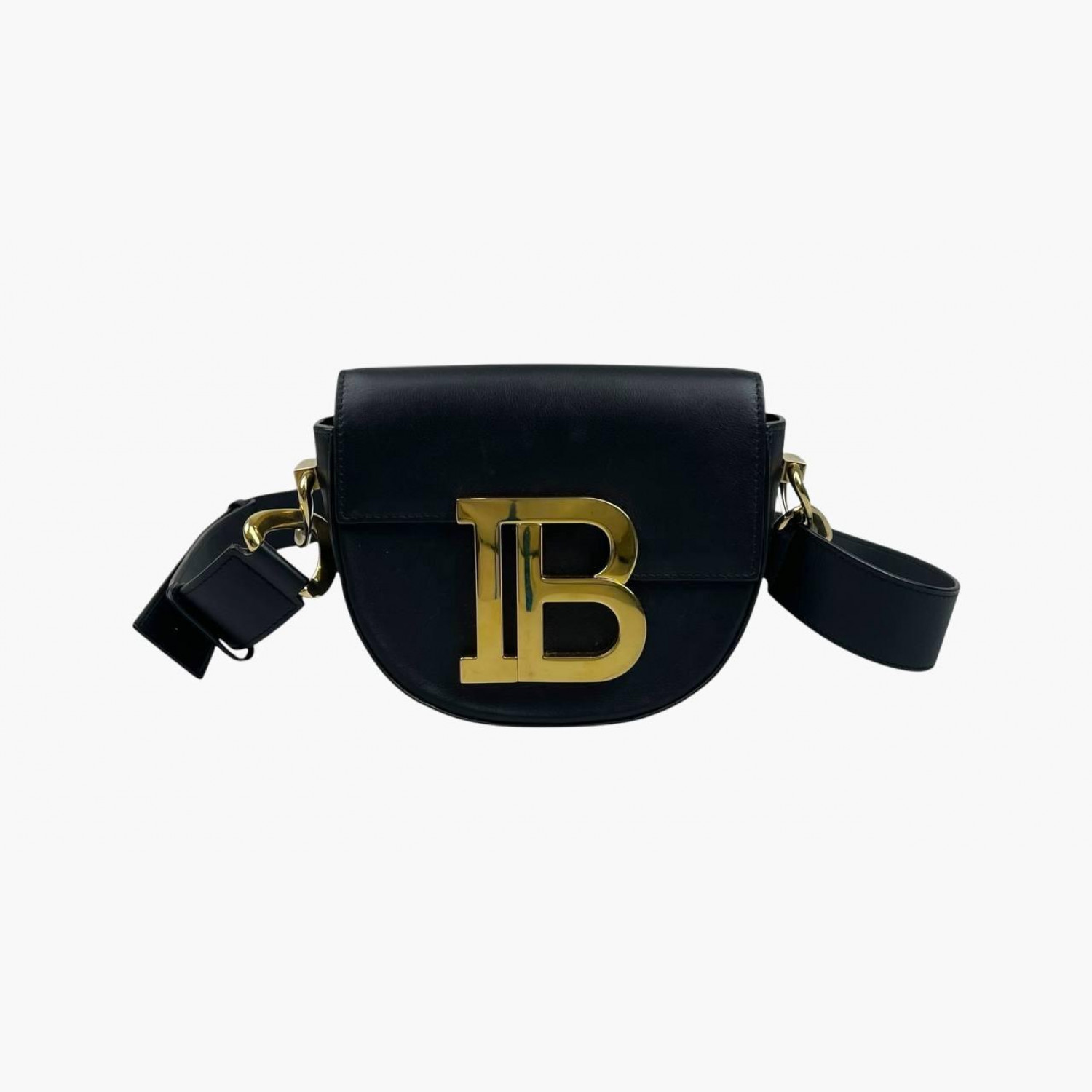Чорна шкіряна сумка круглої форми з регульованим ремінцем. Усередині одне основне відділення з відкритою кишенею, а також відкрита кишеня на задній стороні сумки. У хорошому стані, є сліди вжитку.