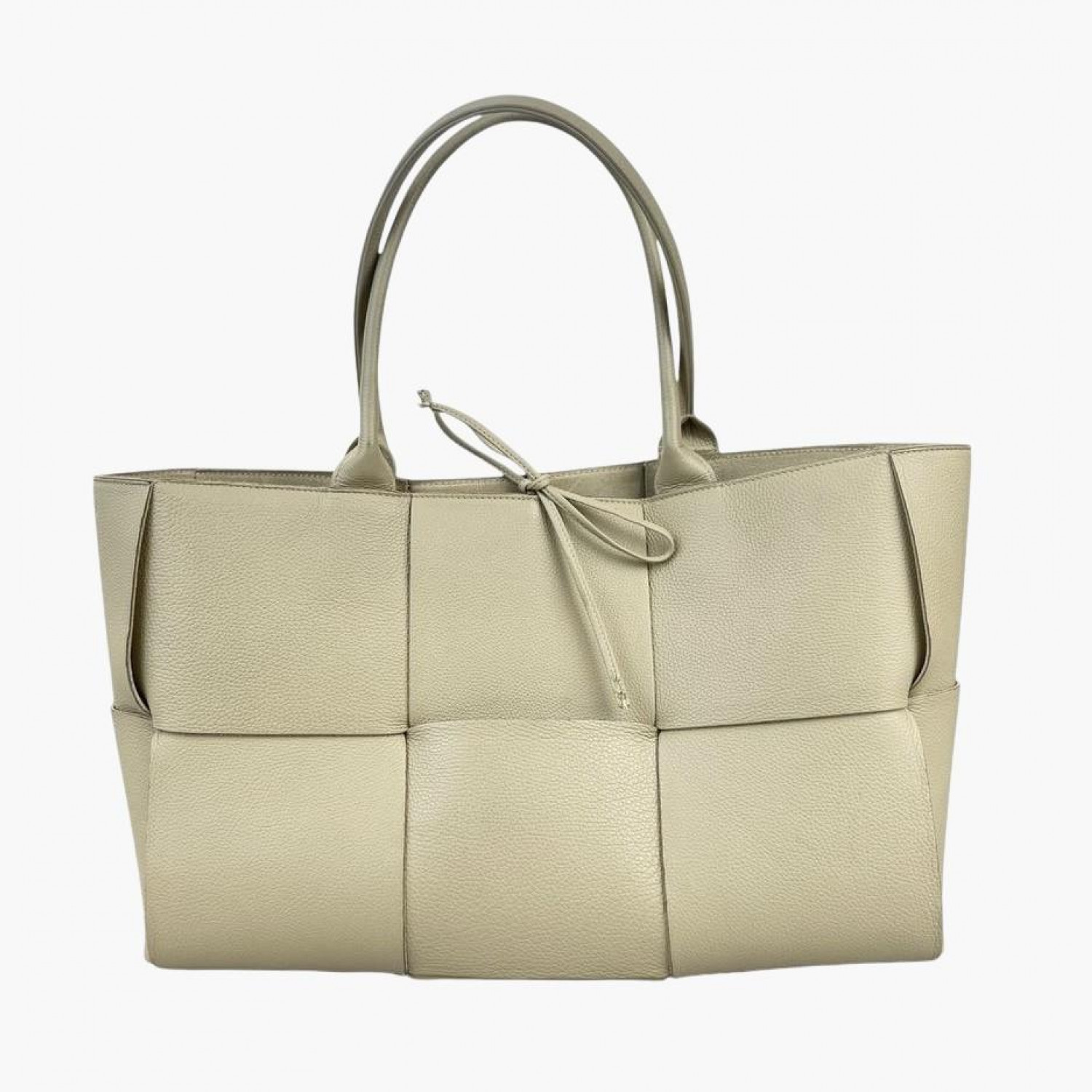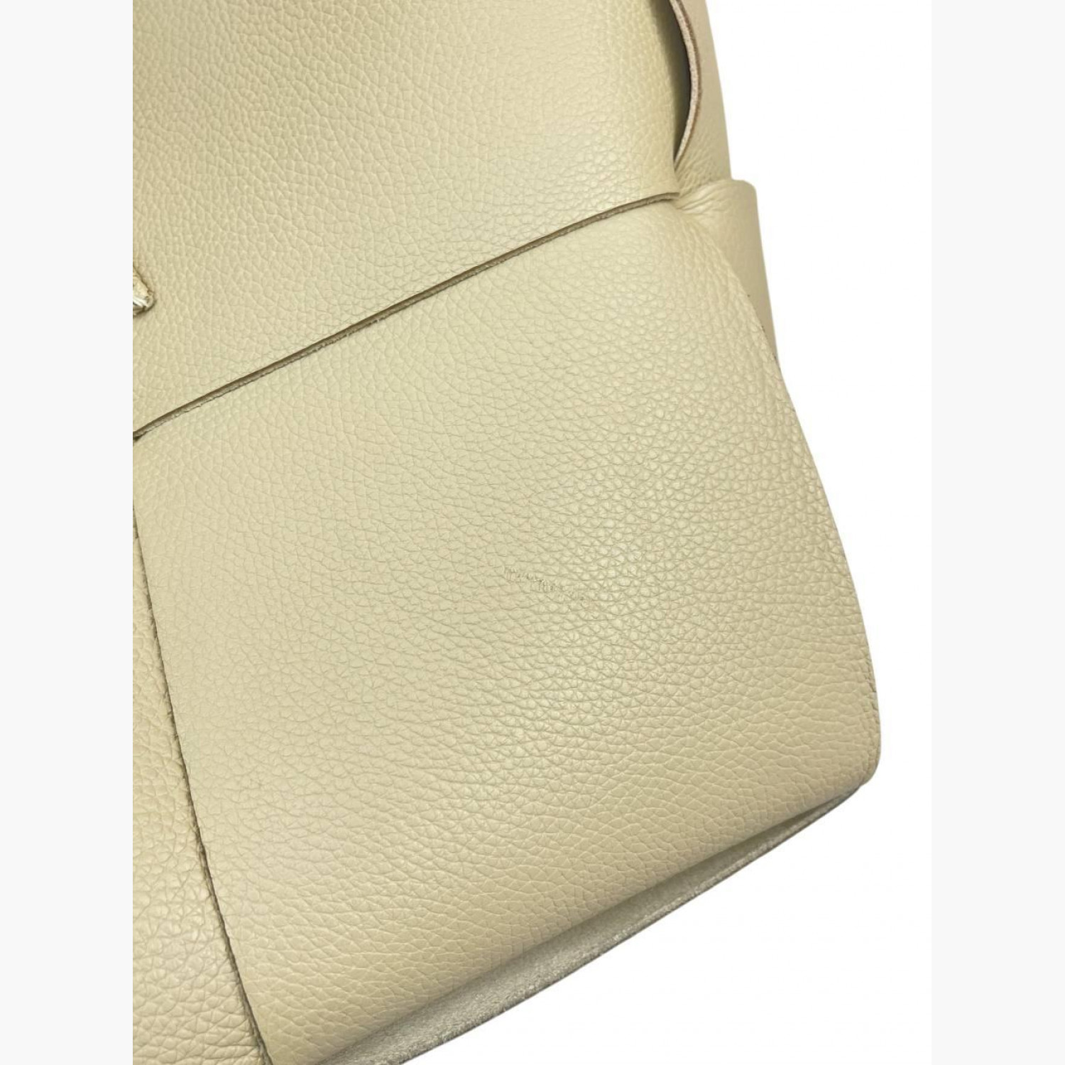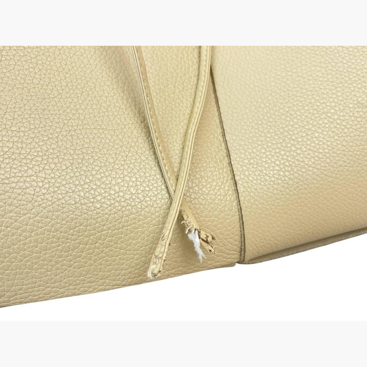 Шкіряна сумка великого плетіння молочного кольору на зав’язках. Усередині одне основне відділення зі знімною кишенею на блискавці на ремінці. У хорошому стані, є плями, пошкоджені кінці зав’язок та потертості.