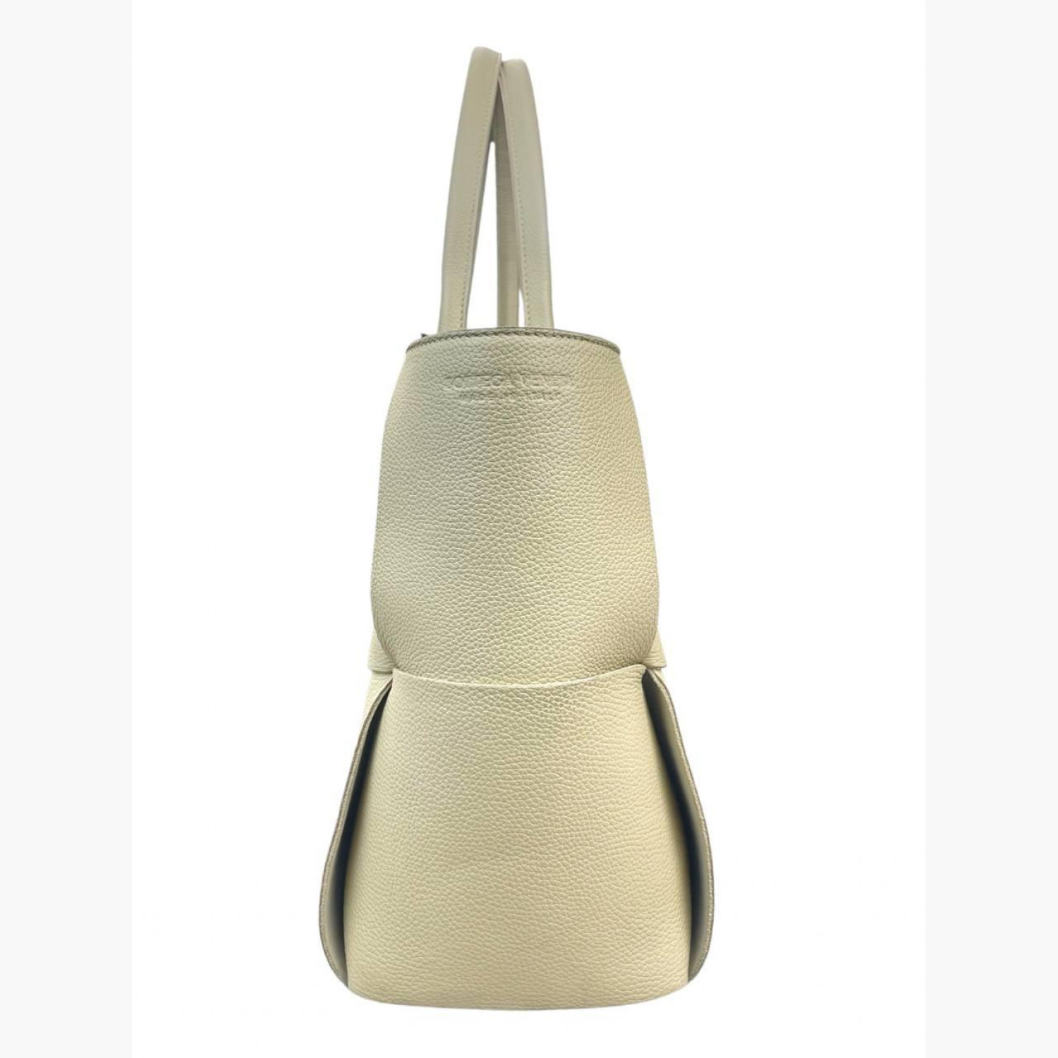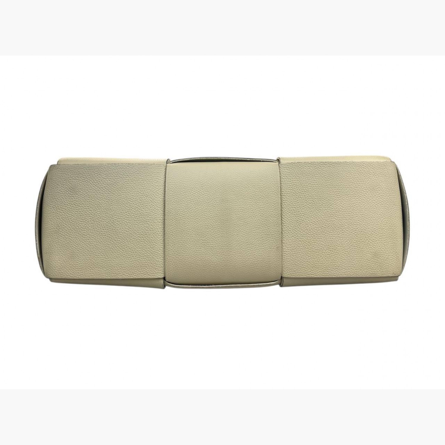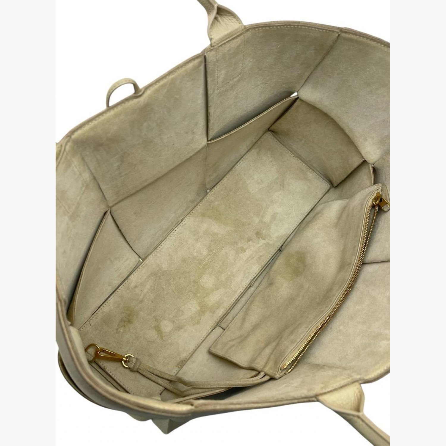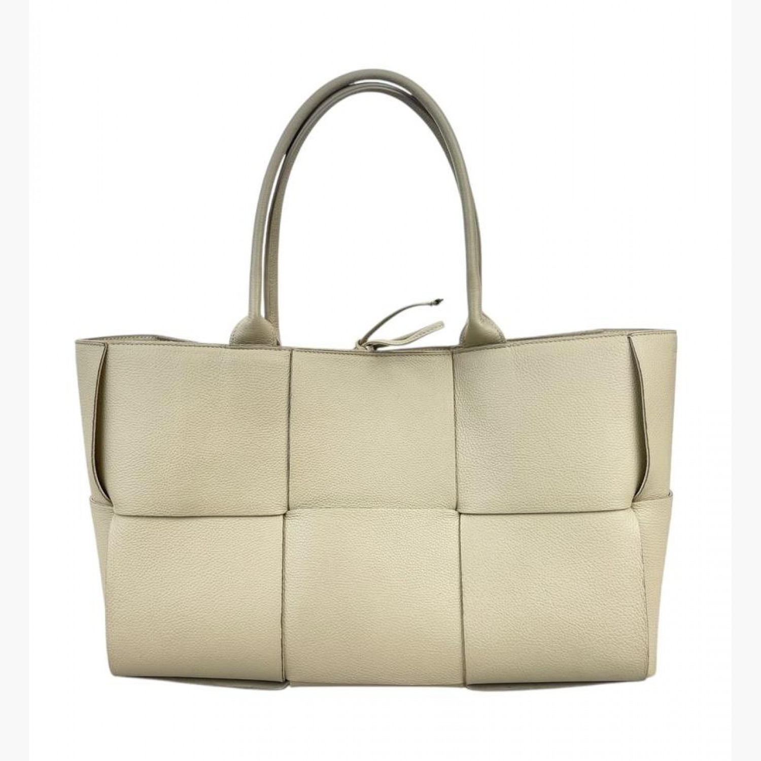 Шкіряна сумка великого плетіння молочного кольору на зав’язках. Усередині одне основне відділення зі знімною кишенею на блискавці на ремінці. У хорошому стані, є плями, пошкоджені кінці зав’язок та потертості.