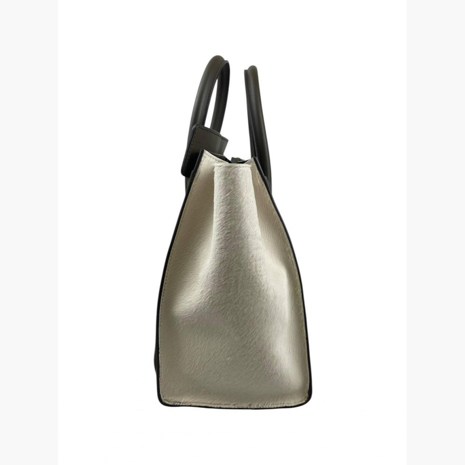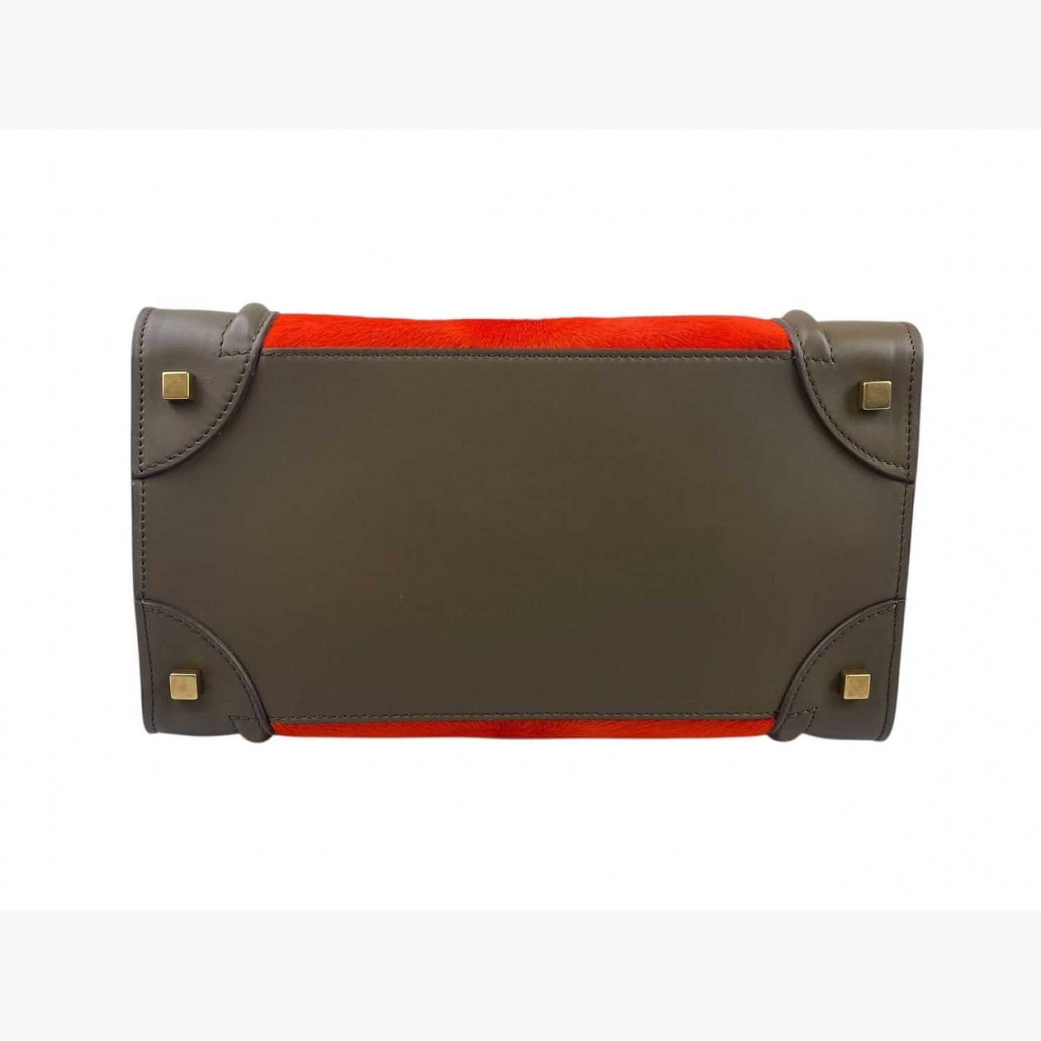 Триколірна сумка з понифарбованого хутра червоного кольору та шкіри. Всередині — одне основне відділення з кишенею на блискавці та подвійною відкритою кишенею, а також кишеня на блискавці на лицьовій стороні сумки. У відмінному стані, є незначні сліди вжитку.