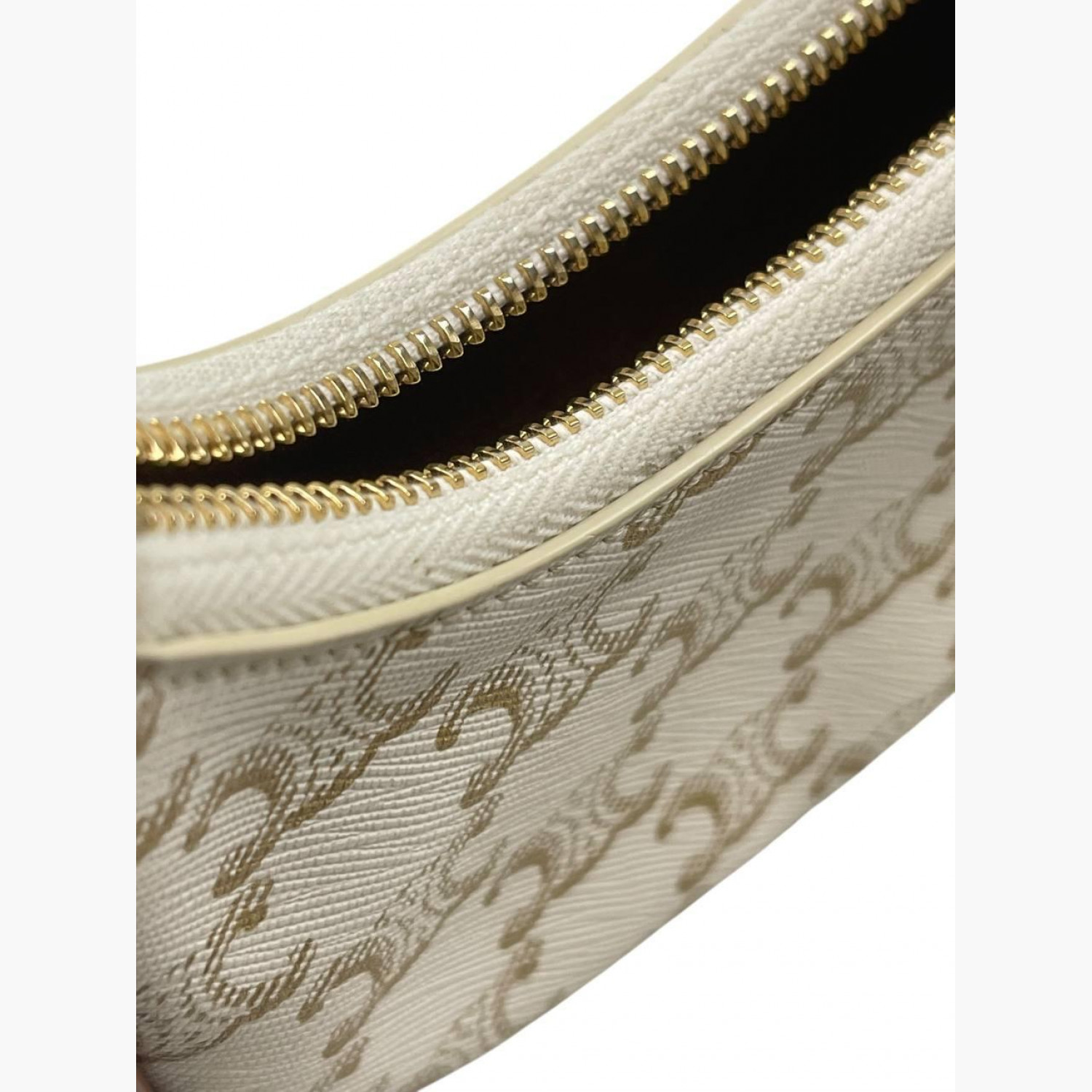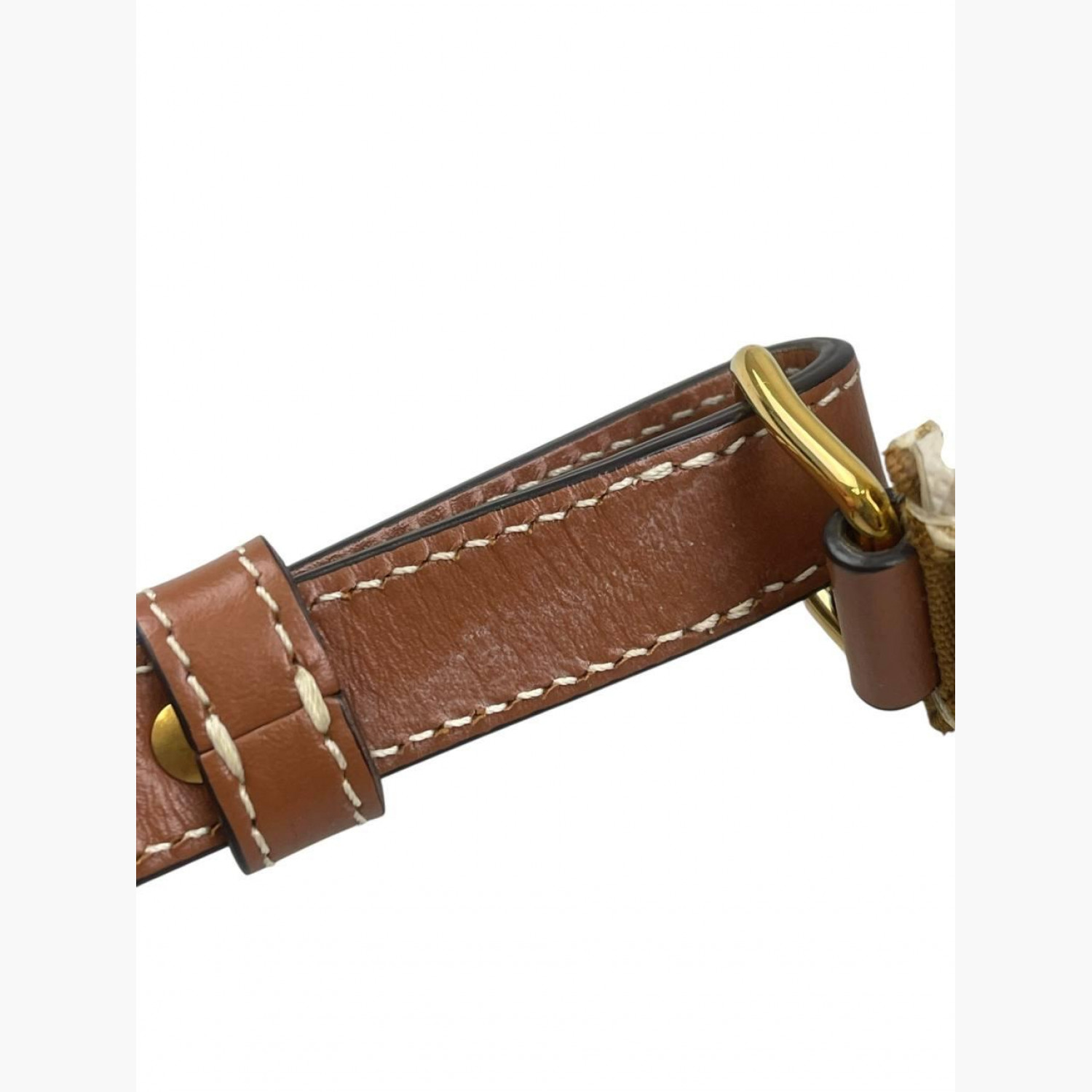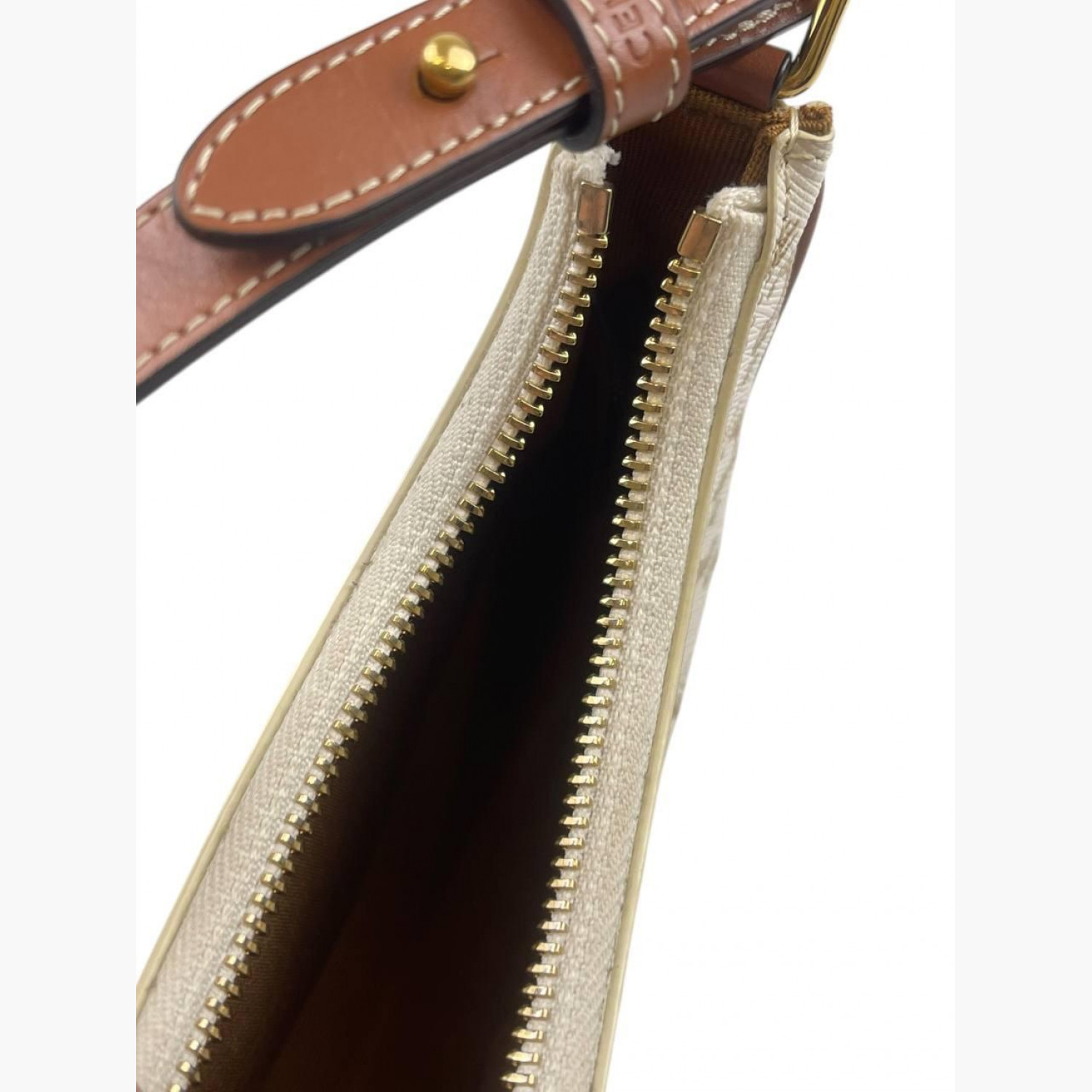 Мінісумка молочного кольору з логотипом, виготовлена з канви з шкіряною регульованою ручкою. Усередині одне основне відділення без кишень. У відмінному стані, є ледь помітні сліди вжитку.