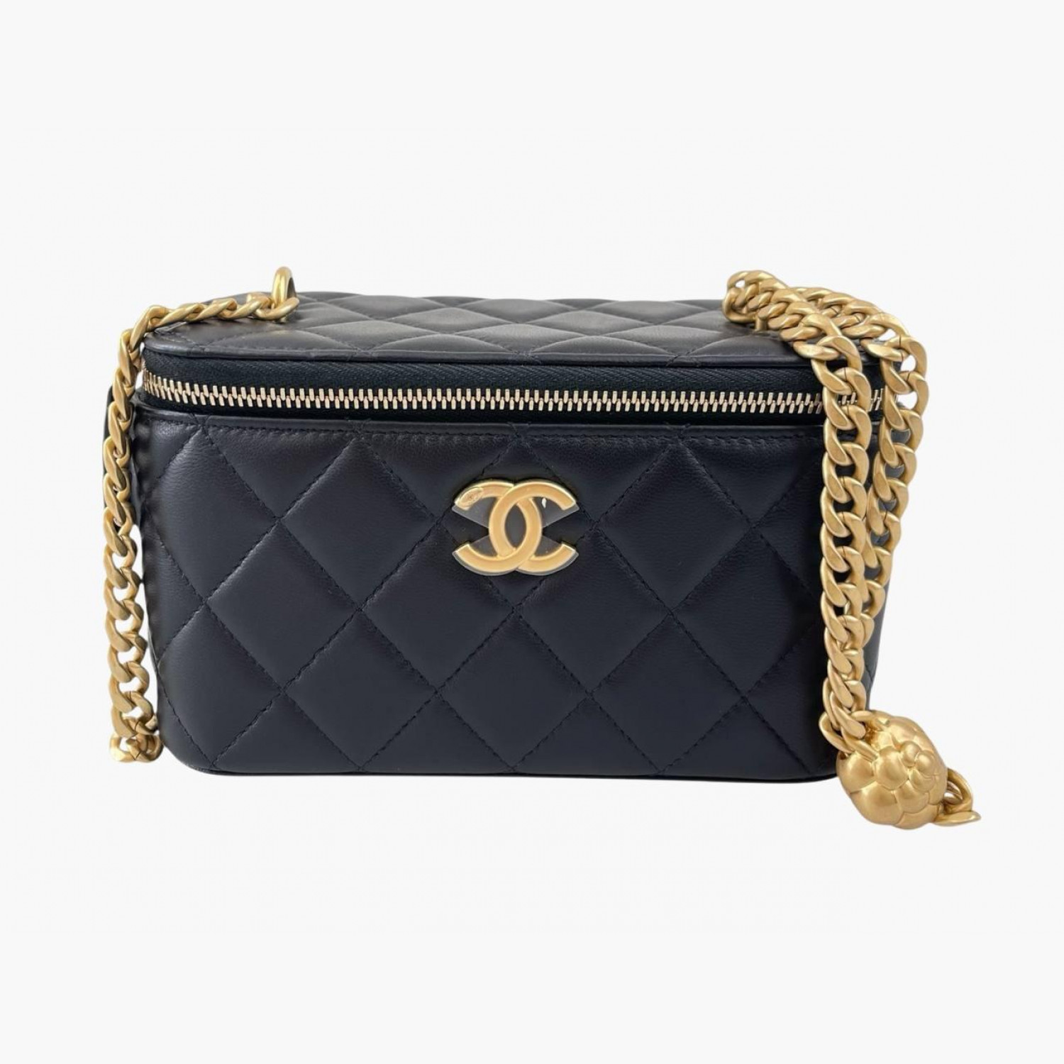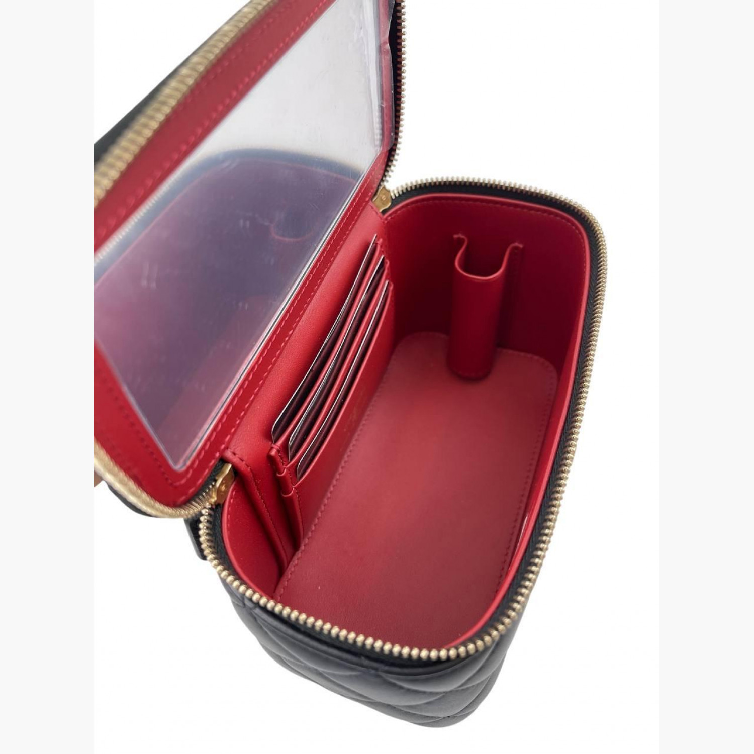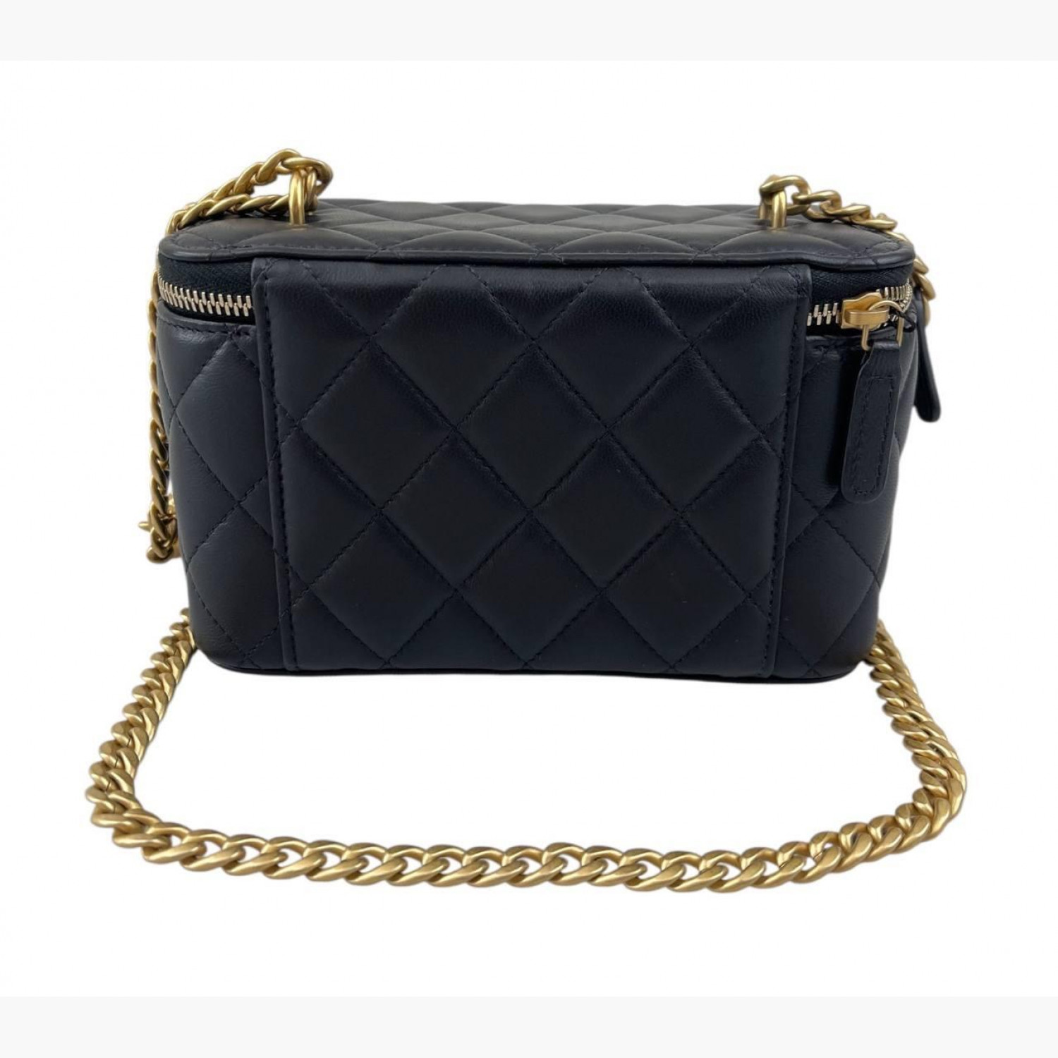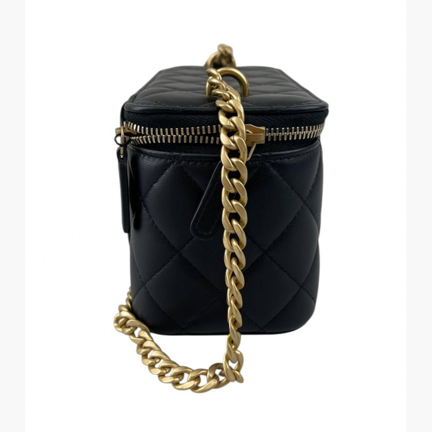 Чорна шкіряна сумка квадратної форми з золотою ланцюжком. Всередині — одне основне відділення з кишенями для кардхолдерів. Абсолютно нова.