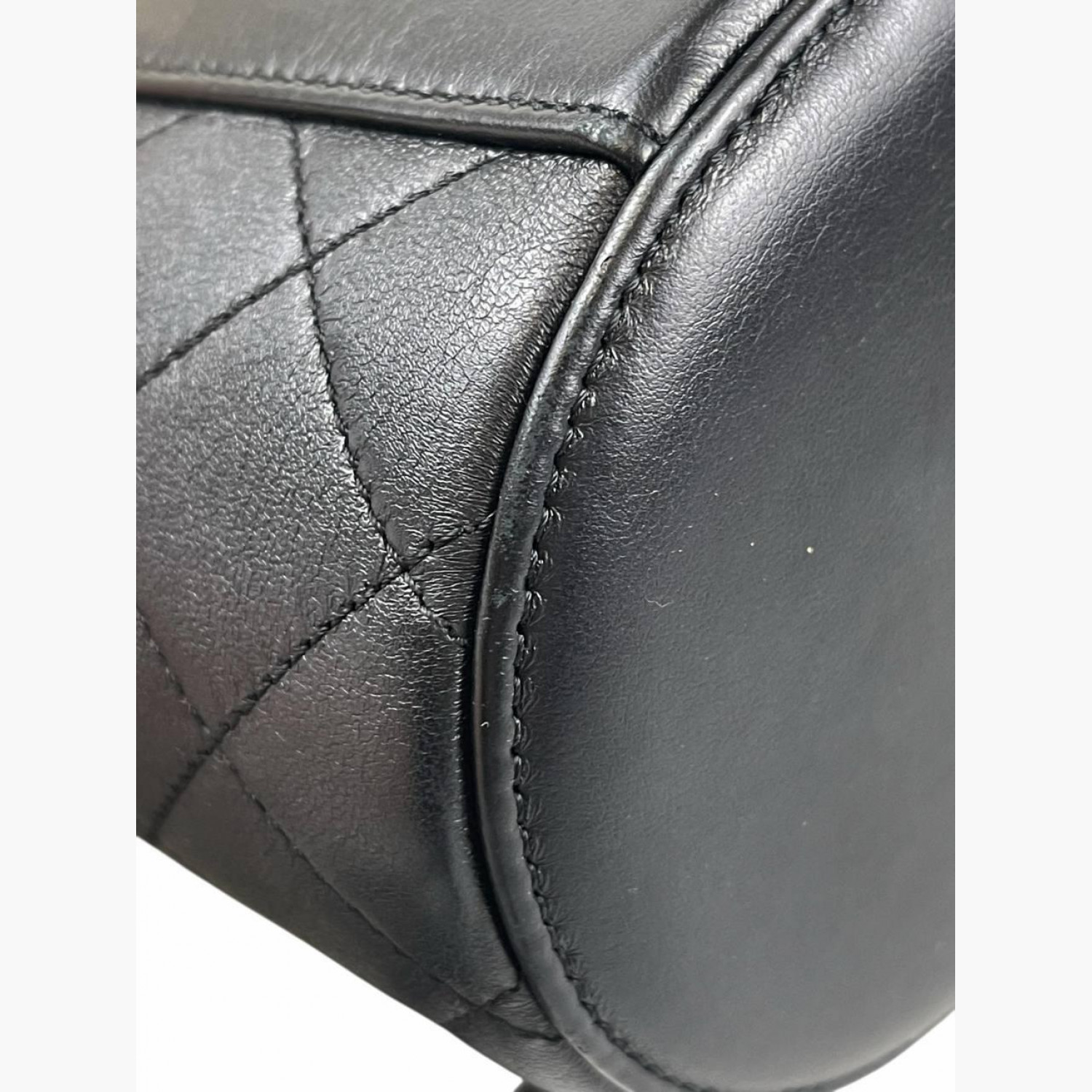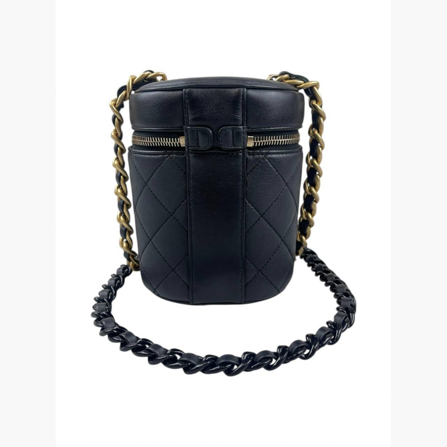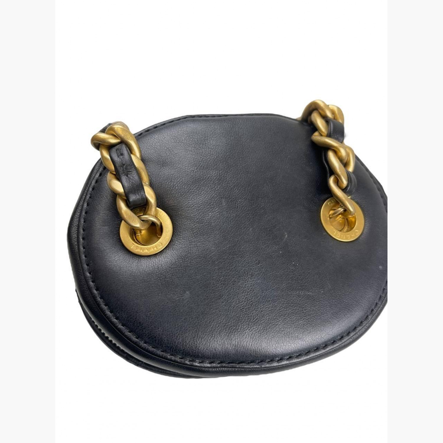 Стьобана шкіряна сумка чорного кольору у формі бочонка на довгому ланцюжку. Всередині — одне основне відділення з відкритою кишенею. У хорошому стані, без потертостей.