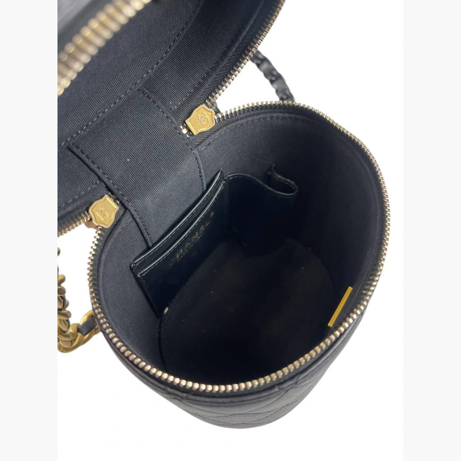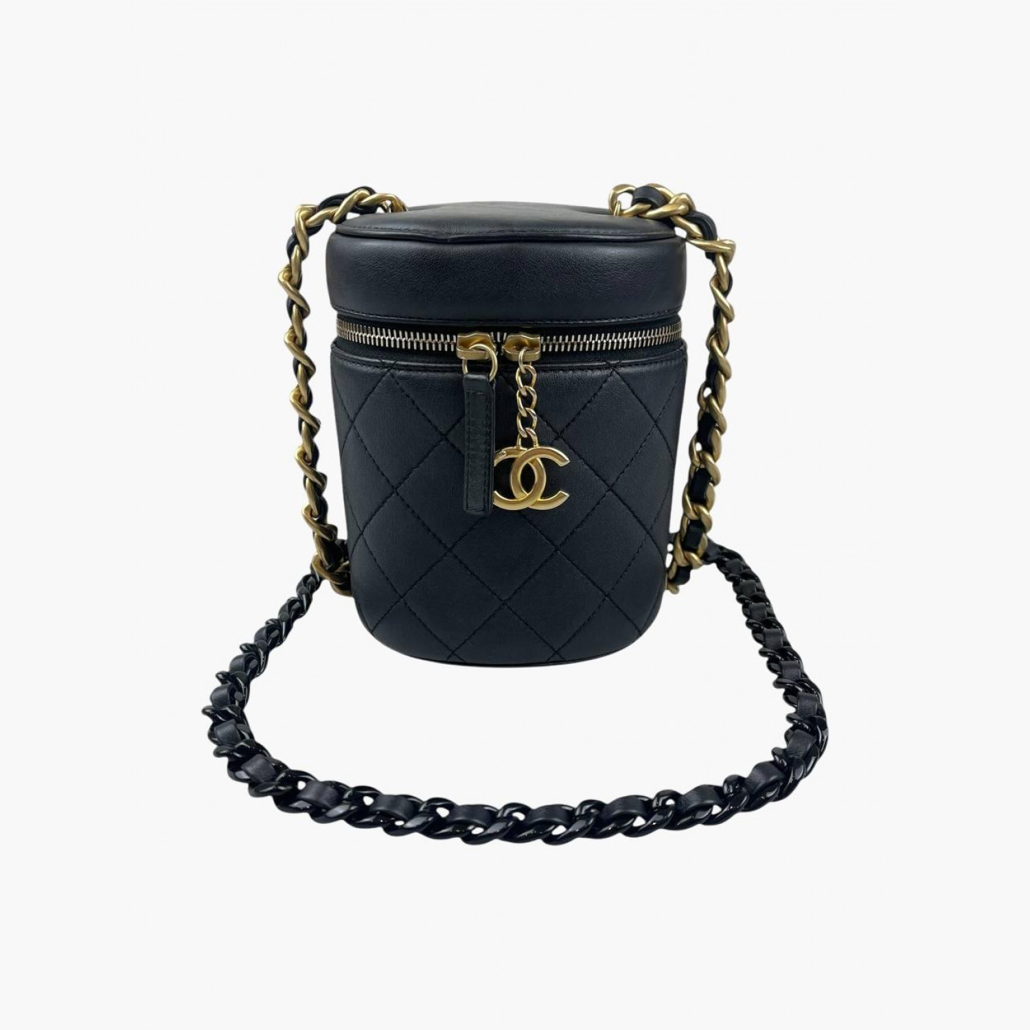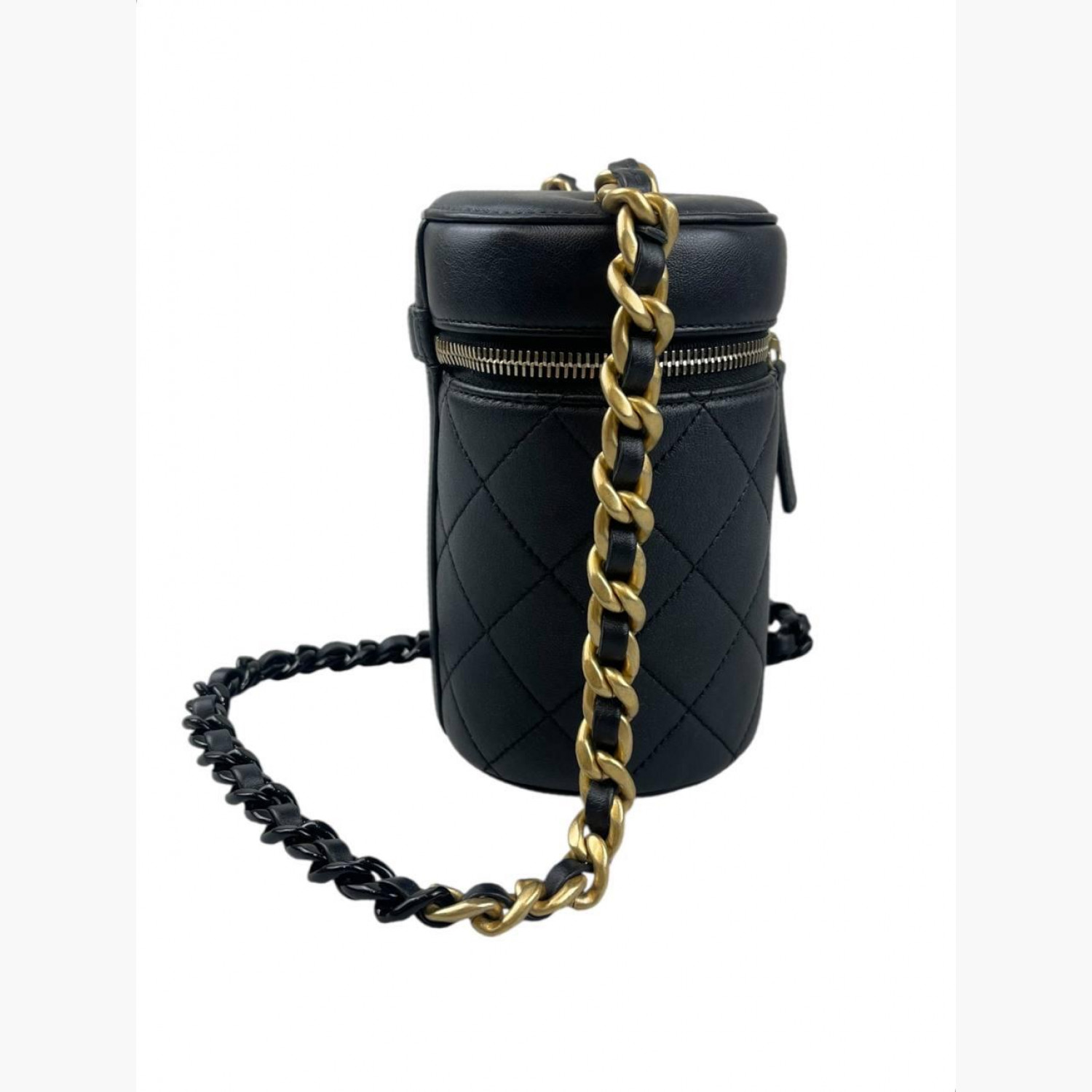 Стьобана шкіряна сумка чорного кольору у формі бочонка на довгому ланцюжку. Всередині — одне основне відділення з відкритою кишенею. У хорошому стані, без потертостей.