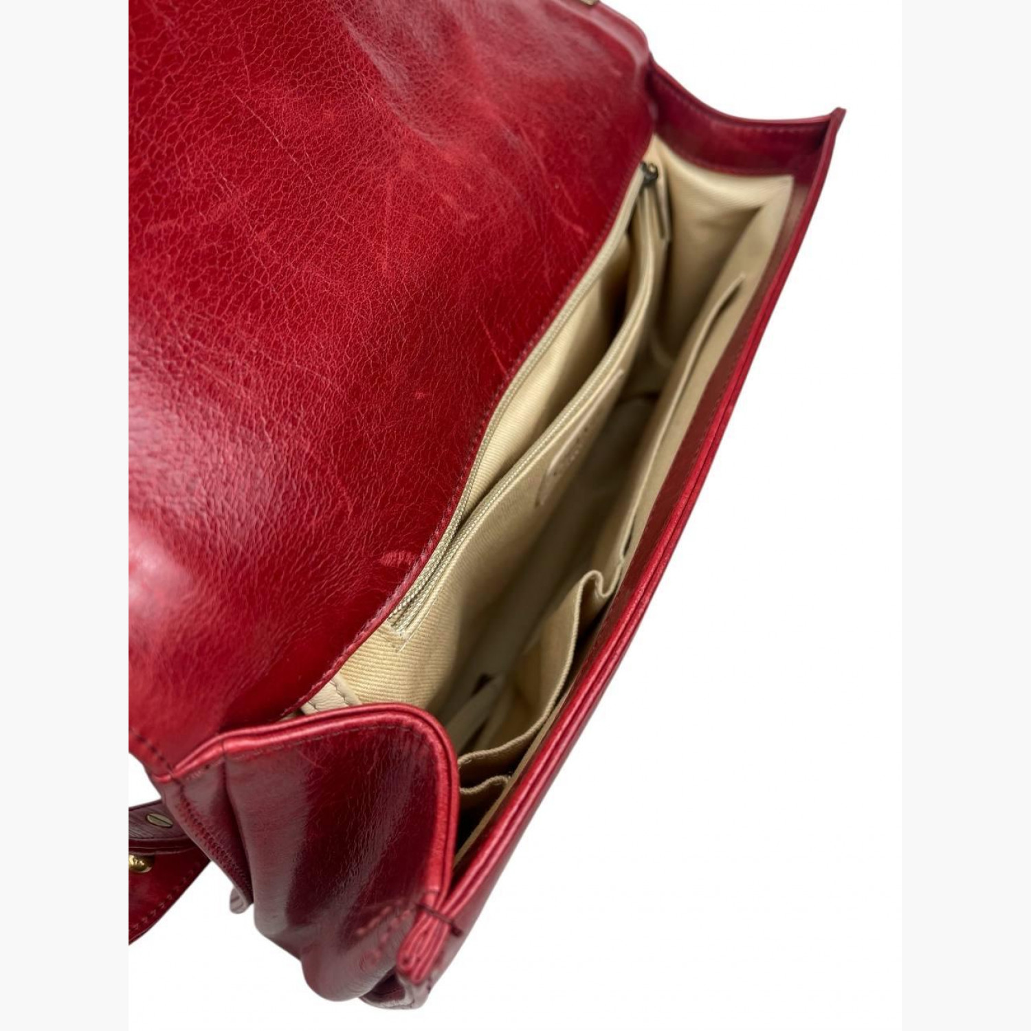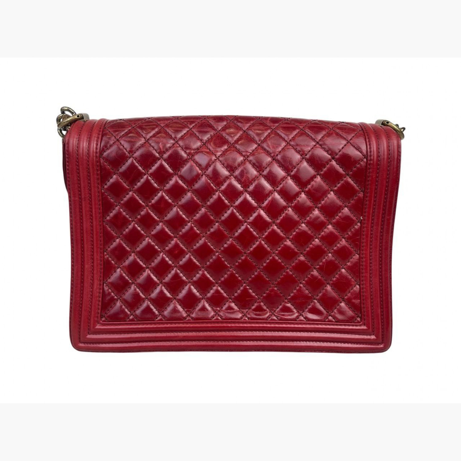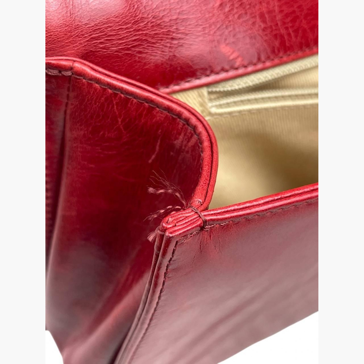 Червона шкіряна стьобана сумка на великій ланцюжку. Усередині одне основне відділення з подвійною відкритою кишенею та кишенею на блискавці навпроти. У хорошому стані, є потертості та інші сліди вжитку.
