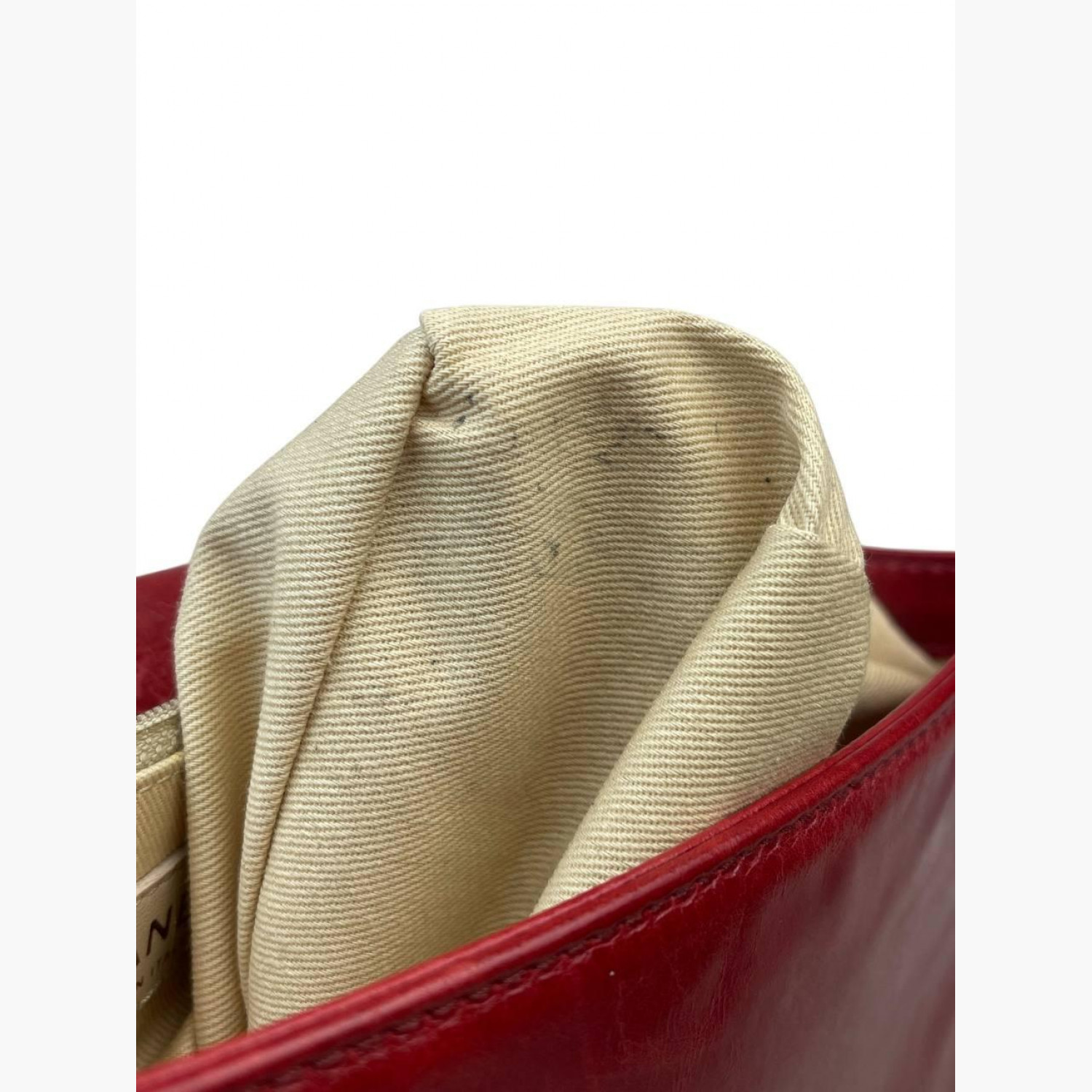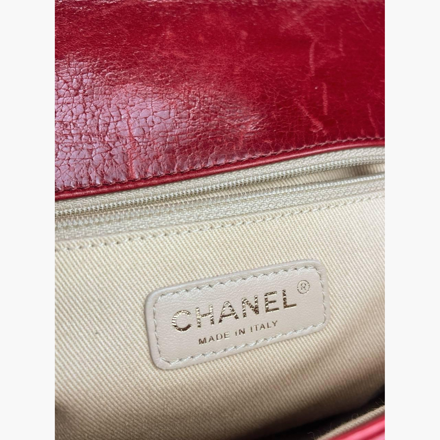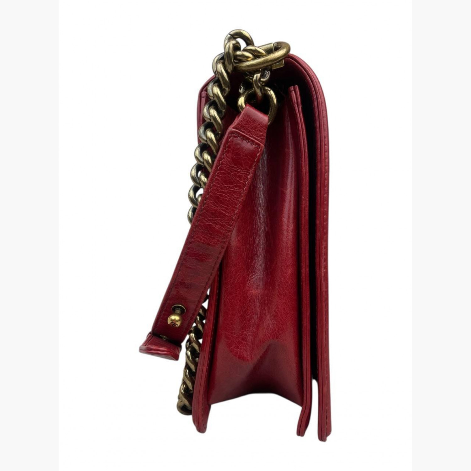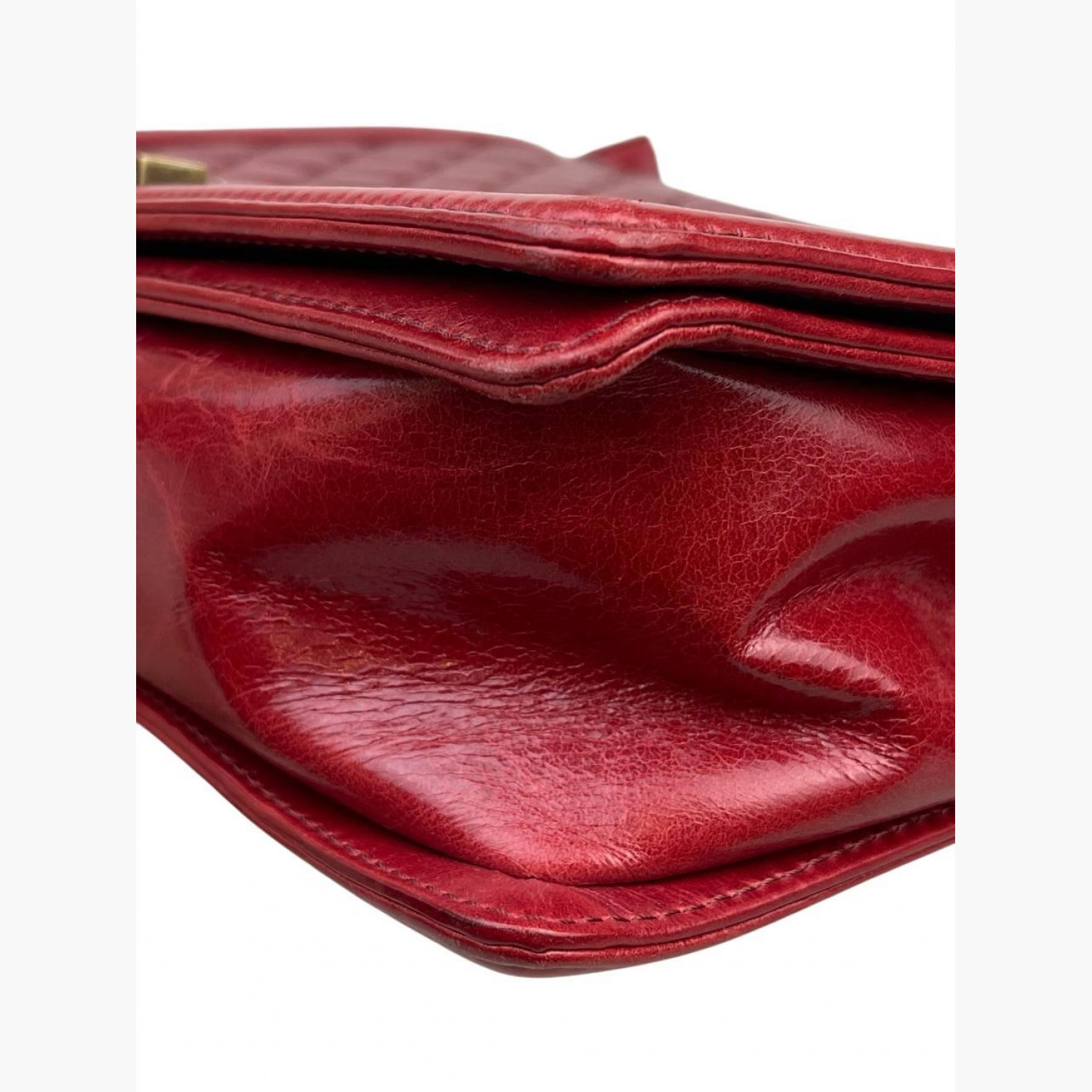 Червона шкіряна стьобана сумка на великій ланцюжку. Усередині одне основне відділення з подвійною відкритою кишенею та кишенею на блискавці навпроти. У хорошому стані, є потертості та інші сліди вжитку.
