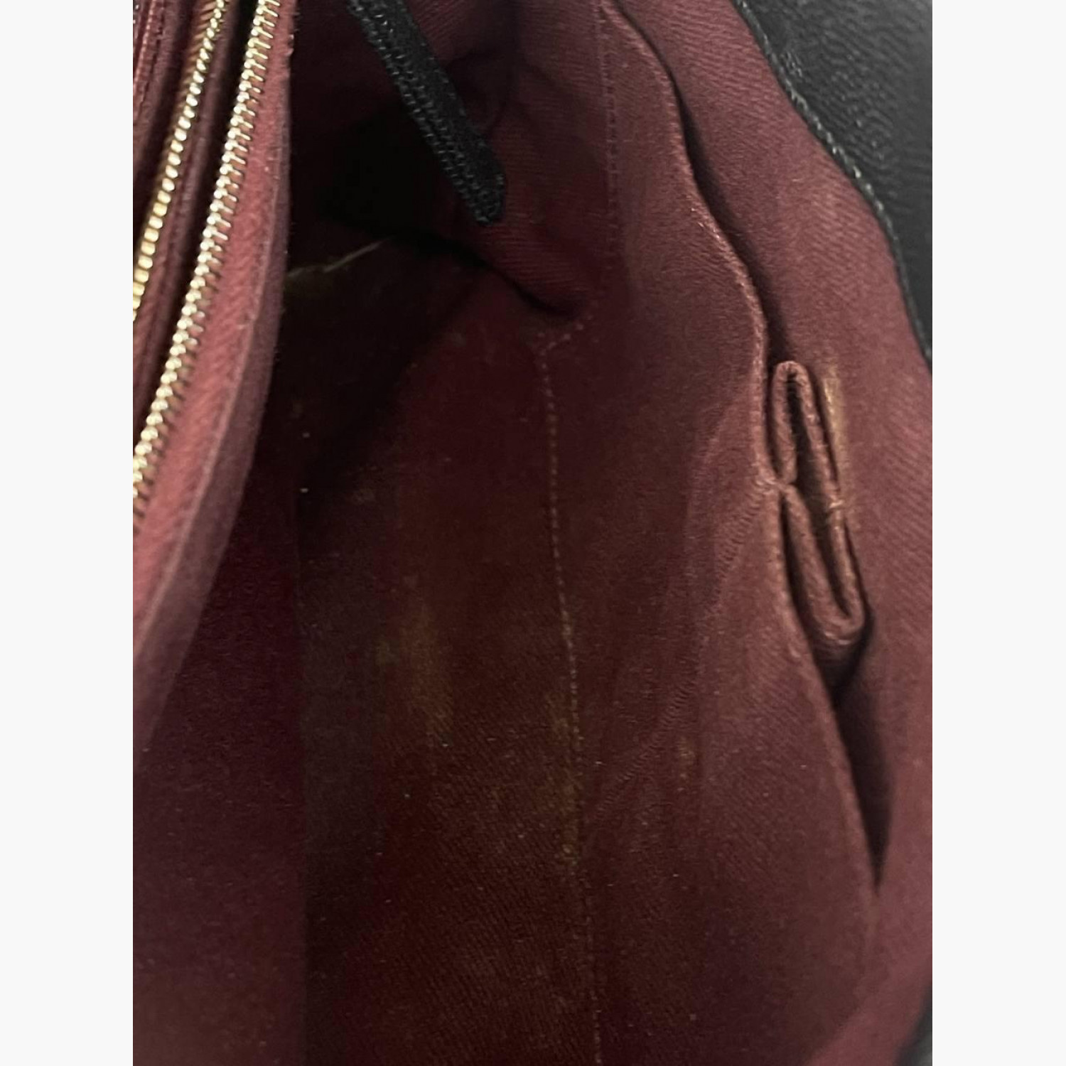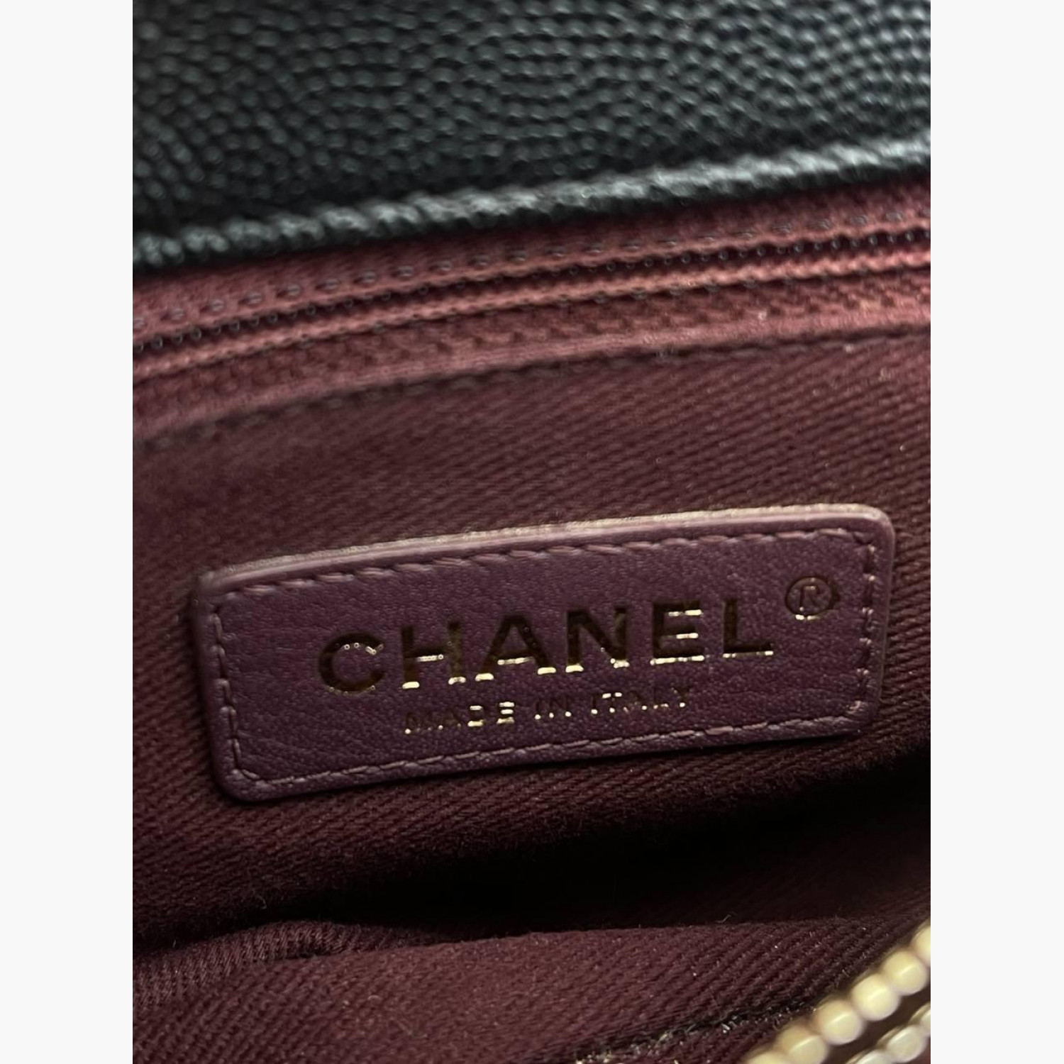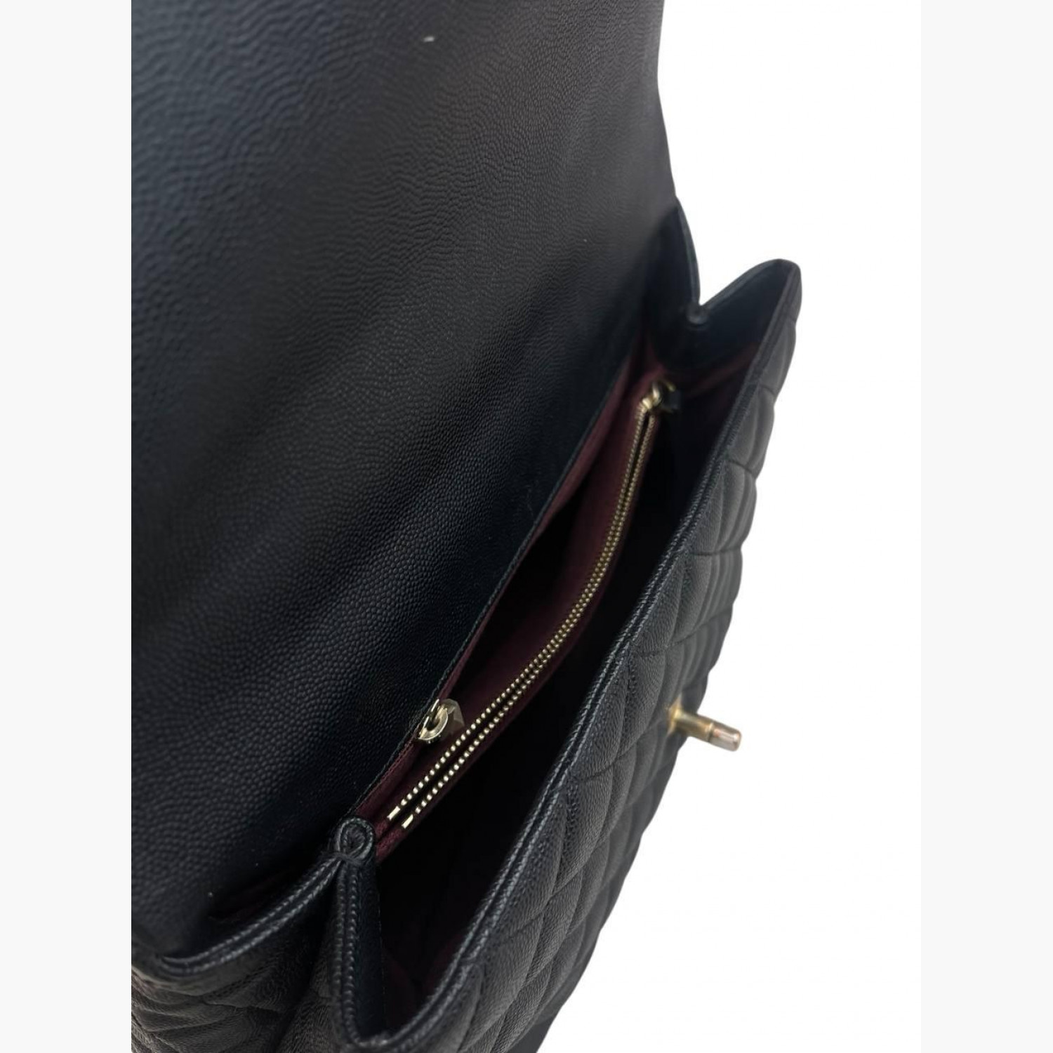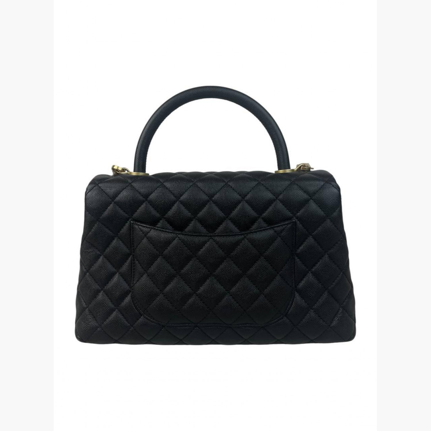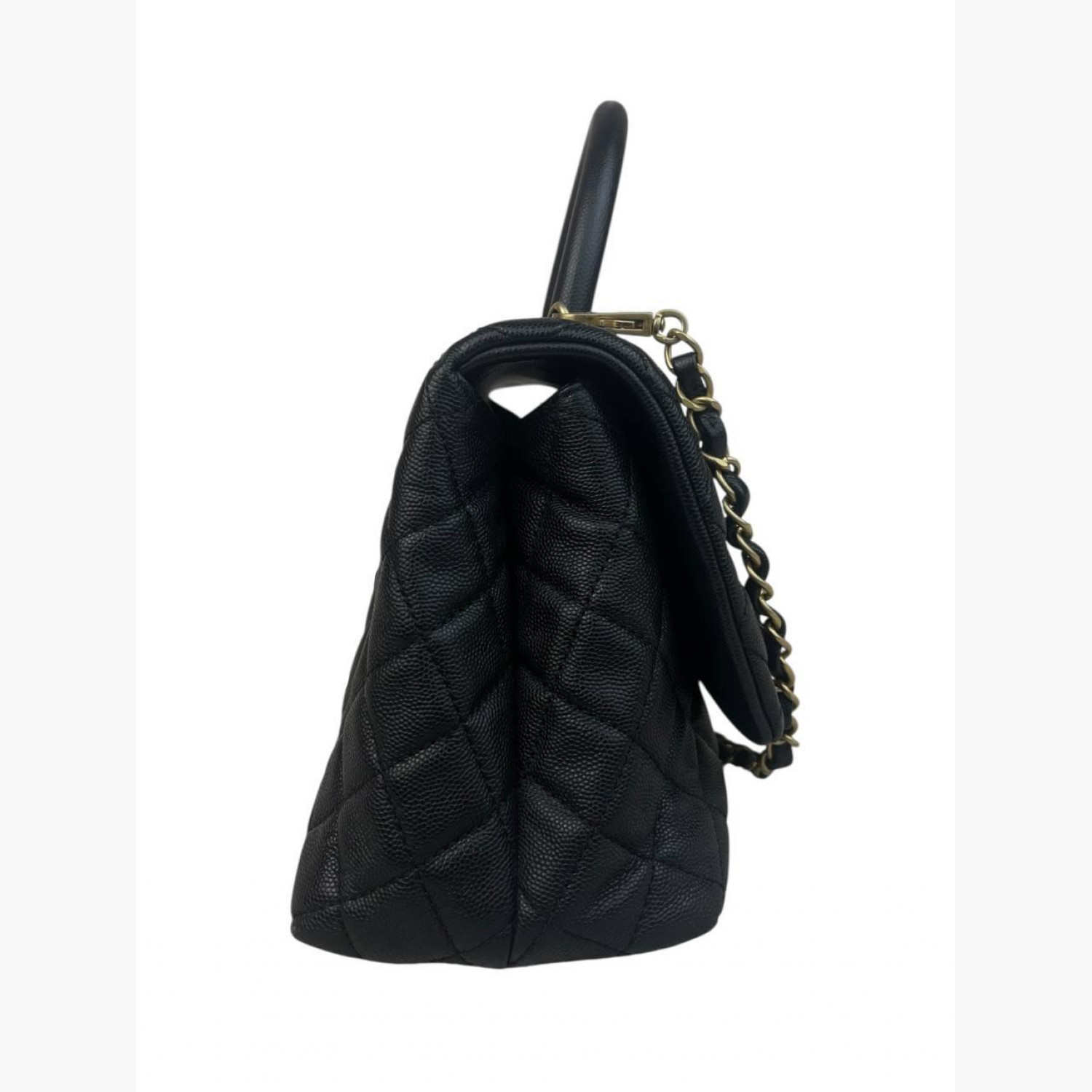 Чорна шкіряна стьобана сумка зі знімним шкіряним ремінцем на ланцюжку. Усередині — два відділення: у першому відкритий карман, у другому — карман на блискавці; між ними — додатковий карман на блискавці. Ззаду сумки розташований відкритий карман. У хорошому стані, є незначні плями та потертості.